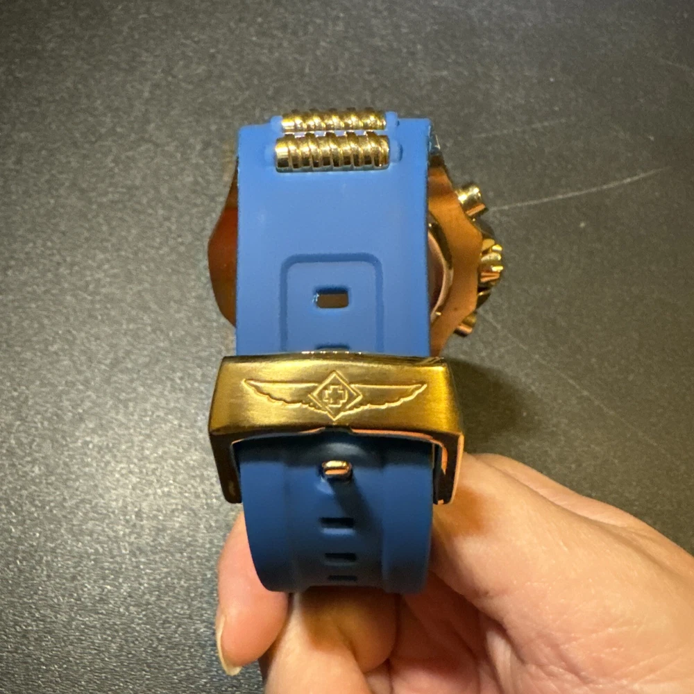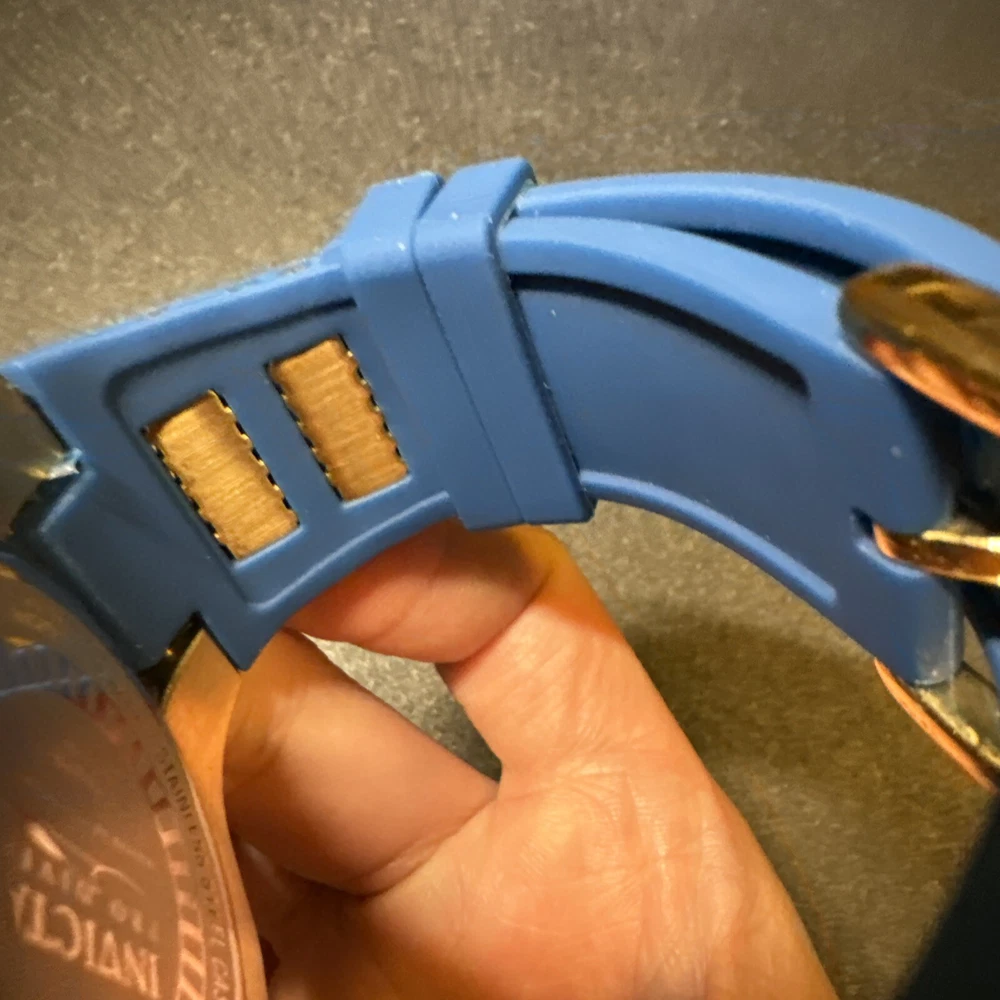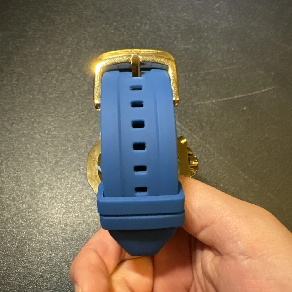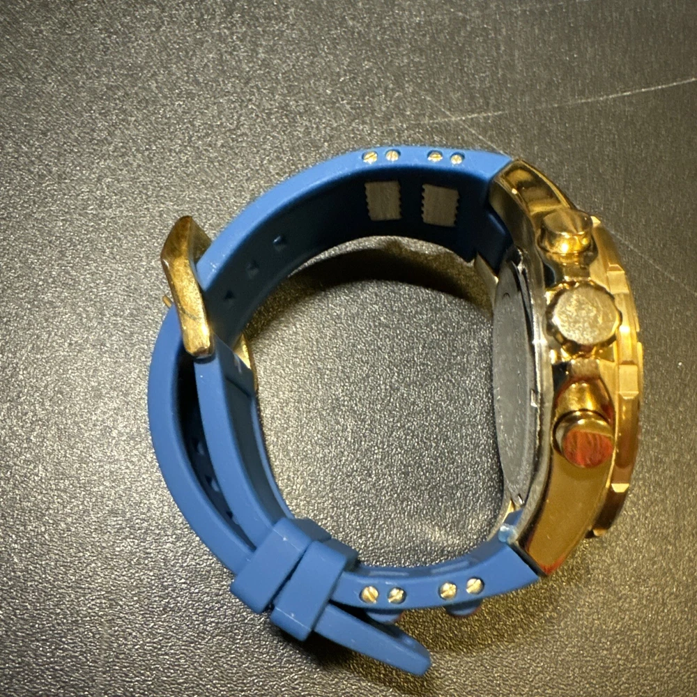 Introducing the Invicta Pro Diver 24681, a stunning men's wristwatch with a 52mm yellow gold-plated stainless steel case and a blue polyurethane band. This watch features a fixed blue bezel, a blue dial with minute, second, hour, date, chronograph, and tachymeter functions, and a solid caseback. With a water resistance of 100 meters/330 feet, this watch is perfect for professional divers and anyone who loves the ocean. The Invicta Pro Diver 24681 is a quartz movement watch that is suitable for left-handed men and has a tang clasp. This watch is an excellent addition to any collection and is sure to impress. Personal used condition in collection. Not currently running. NEEDS NEW BATTERIES! Bought couple years back and it's been in storage. No box. Just the watch itself with the band. Very good pristine condition. Currently sold out at retail value on official site: $199.00 very rare to find. offers welcome.