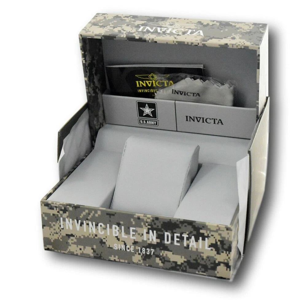 New - With Tags New and Unworn - Guaranteed Authentic - Includes Green US Army Invicta box and warranty card 100% Functional - This listing includes pictures of the actual watches for sale Case size: 38mm Case size: 38mm wide or about 41.5mm wide including the crown Thickness: 13mm Weight: 4.8 ounces Items included: Green US Army Invicta box and warranty card Max wrist size: 7.75 Inches Case and Dial Case Size: 38mm Case Material: Stainless Steel Bezel Material: Stainless Steel Bezel Color: Black Crown Type: Push Crystal Type: Flame Fusion Dial Material: Metal Movement Caliber: VD57B Function Type: Quartz Water Resistance Water Resistance: 100m Band Material: Stainless Steel Tone: Gold Length: 200mm Size: 18mm Top Selling Disney Super Hero Star Wars New in Stcok TechnoMarine Contact Us Invicta Pro Diver U.S. Army Women's 38mm Gold Stainless Chronograph Watch 31845 New - With Tags New and Unworn - Guaranteed Authentic - Includes Green US Army Invicta box and warranty card 100% Functional - This listing includes pictures of the actual watches for sale Case size: 38mm Case size: 38mm wide or about 41.5mm wide including the crown Thickness: 13mm Weight: 4.8 ounces Items included: Green US Army Invicta box and warranty card Max wrist size: 7.75 Inches Case and Dial Case Size: 38mm Case Material: Stainless Steel Bezel Material: Stainless Steel Bezel Color: Black Crown Type: Push Crystal Type: Flame Fusion Dial Material: Metal Movement Caliber: VD57B Function Type: Quartz Water Resistance Water Resistance: 100m Band Material: Stainless Steel Tone: Gold Length: 200mm Size: 18mm This item includes a 100% Money-Back Guarantee! If you're not completely satisfied with your purchase, just send it back in the same condition within 60 days and we will refund the full purchase price of the item. We'll even cover the return shipping! (Only applies to USA orders). Please Note: We do not cover water damage for watches. We do not test or verify manufacturer's water resistance claims. Please use your watch in water at your own risk. To receive free return shipping: Next to this item in your ebay purchase history, click on "Return this item." Please choose "Changed-mind" as the reason for the return. This will allow you to print a pre-paid return shipping label. - Klawk Watches - We have been in business for over 8 years, with more than 25,000 customers from around the world. We specialize in Invicta watches and have many models that can't be found anywhere else. We have some of the lowest prices - and you won't find better customer service. We try to provide the best customer service possible. We hand-inspect each watch and test them to make sure they are completely functional before shipping them out. We also include a no-hassle 60-day warranty on all of our watches (this warranty only covers defects in the watch movement). Our 60-day warranty does not cover any damage from water or moisture. Neither Klawkwatches nor any manufacturer covers water damage under warranty. Use your watch in water at your own risk. We're happy to help! If you have any questions, Please let us know and we will get back to you within 24 hours. Shipping Returns Shipping Shipping Returns Shipping Orders are shipped daily. We generally ship items within 24 hours of receiving payment. We offer standard, Prioirty, and overnight shipping services. You can upgrade your shipping speed at checkout for the difference in shipping costs. Unless a shipping upgrade is purchased, items will generally ship as a First Class Package, the normal arrival time is 3-5 business days starting the day after the item is shipped. We do all of our international shipping through the eBay global shipping program. We ship the item to the eBay global shipping center and they will ship the item to you. eBay determines the international shipping costs and import fees for the item based on the item weight and your location. International shipments can take between 2-4 weeks to arrive depending on your location. Shipping Returns Returns Shipping Returns Returns If you're not completely satisfied with your purchase, you are welcome to return it within 60 days for a full refund. We will generally cover the return shipping costs if you are not satisfied with your purchase. Next to the item in your purchase history, you can click on "More Options" and "Return this item". This will allow you to print a pre-paid return shipping label. For international orders and returns, please contact us to make return arrangements.