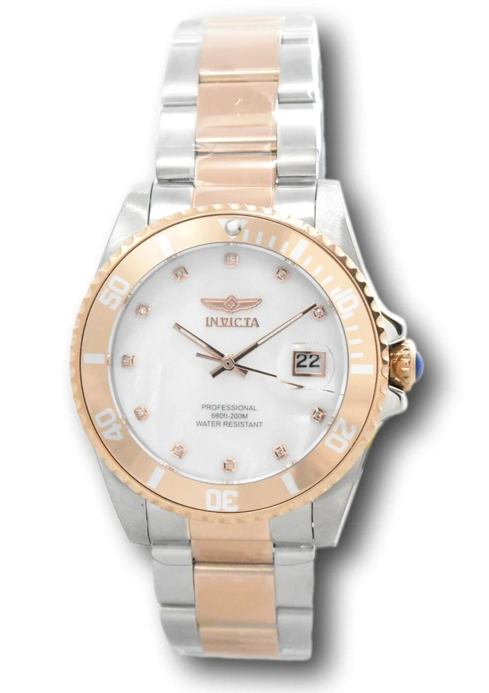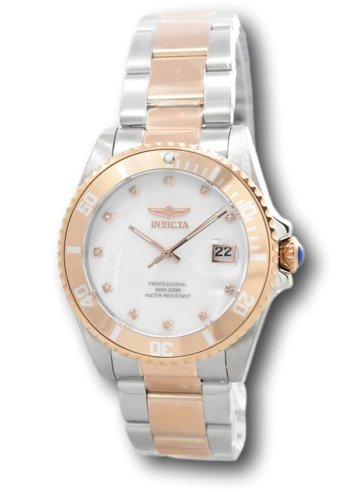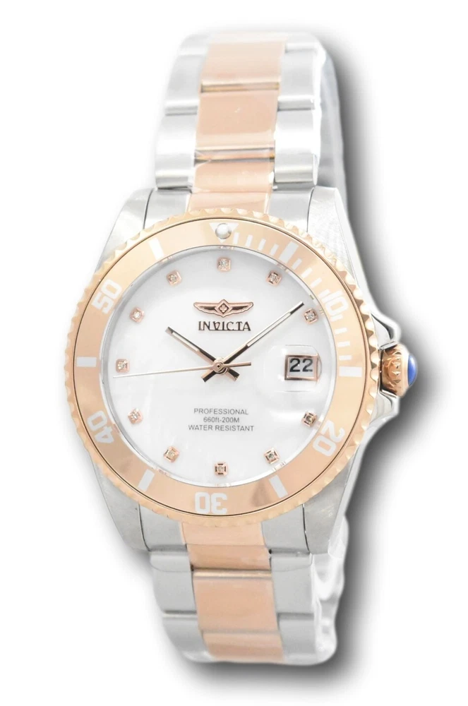 New - With Tags New and Unworn - Guaranteed Authentic - Includes Small Yellow Invicta box and Warranty Card 100% Functional - This listing includes pictures of the actual watches for sale Watch features White Mother of pearl dial that looks stunning in person - watch dial also features 11 individual diamonds for a luxurious and elegant look Case size: 38mm or about 42 mm wide including the crown Thickness : about 11.5 mm thick Weight: 4.6 ounces Items included: Small Yellow Invicta Box and Warranty Card Max wrist size: 8.25 Inches Case and Dial Case Size: 38mm Case Material: Stainless Steel Bezel Material: Aluminum Bezel Color: White , Rose Gold Crown Type: Push Crystal Type: Flame Fusion Dial Material: Mother of Pearl Movement Caliber: PC32 Function Type: Quartz Water Resistance Water Resistance: 200m Band Material: Stainless Steel Tone: Steel, Rose Gold Length: 175mm Size: 20mm Stones Type: Diamond Quantity: 11 Size: 0.9 Color: White Top Selling Disney Super Hero Star Wars New in Stcok TechnoMarine Contact Us Invicta Pro Diver Women's 38mm 11-Diamonds White MOP Dial Quartz Watch 31704 New - With Tags New and Unworn - Guaranteed Authentic - Includes Small Yellow Invicta box and Warranty Card 100% Functional - This listing includes pictures of the actual watches for sale Watch features White Mother of pearl dial that looks stunning in person - watch dial also features 11 individual diamonds for a luxurious and elegant look Case size: 38mm or about 42 mm wide including the crown Thickness : about 11.5 mm thick Weight: 4.6 ounces Items included: Small Yellow Invicta Box and Warranty Card Max wrist size: 8.25 Inches Case and Dial Case Size: 38mm Case Material: Stainless Steel Bezel Material: Aluminum Bezel Color: White , Rose Gold Crown Type: Push Crystal Type: Flame Fusion Dial Material: Mother of Pearl Movement Caliber: PC32 Function Type: Quartz Water Resistance Water Resistance: 200m Band Material: Stainless Steel Tone: Steel, Rose Gold Length: 175mm Size: 20mm Stones Type: Diamond Quantity: 11 Size: 0.9 Color: White This item includes a 100% Money-Back Guarantee! If you're not completely satisfied with your purchase, just send it back in the same condition within 60 days and we will refund the full purchase price of the item. We'll even cover the return shipping! (Only applies to USA orders). Please Note: We do not cover water damage for watches. We do not test or verify manufacturer's water resistance claims. Please use your watch in water at your own risk. To receive free return shipping: Next to this item in your ebay purchase history, click on "Return this item." Please choose "Changed-mind" as the reason for the return. This will allow you to print a pre-paid return shipping label. - Klawk Watches - We have been in business for over 8 years, with more than 25,000 customers from around the world. We specialize in Invicta watches and have many models that can't be found anywhere else. We have some of the lowest prices - and you won't find better customer service. We try to provide the best customer service possible. We hand-inspect each watch and test them to make sure they are completely functional before shipping them out. We also include a no-hassle 60-day warranty on all of our watches (this warranty only covers defects in the watch movement). Our 60-day warranty does not cover any damage from water or moisture. Neither Klawkwatches nor any manufacturer covers water damage under warranty. Use your watch in water at your own risk. We're happy to help! If you have any questions, Please let us know and we will get back to you within 24 hours. Shipping Returns Shipping Shipping Returns Shipping Orders are shipped daily. We generally ship items within 24 hours of receiving payment. We offer standard, Prioirty, and overnight shipping services. You can upgrade your shipping speed at checkout for the difference in shipping costs. Unless a shipping upgrade is purchased, items will generally ship as a First Class Package, the normal arrival time is 3-5 business days starting the day after the item is shipped. We do all of our international shipping through the eBay global shipping program. We ship the item to the eBay global shipping center and they will ship the item to you. eBay determines the international shipping costs and import fees for the item based on the item weight and your location. International shipments can take between 2-4 weeks to arrive depending on your location. Shipping Returns Returns Shipping Returns Returns If you're not completely satisfied with your purchase, you are welcome to return it within 60 days for a full refund. We will generally cover the return shipping costs if you are not satisfied with your purchase. Next to the item in your purchase history, you can click on "More Options" and "Return this item". This will allow you to print a pre-paid return shipping label. For international orders and returns, please contact us to make return arrangements.