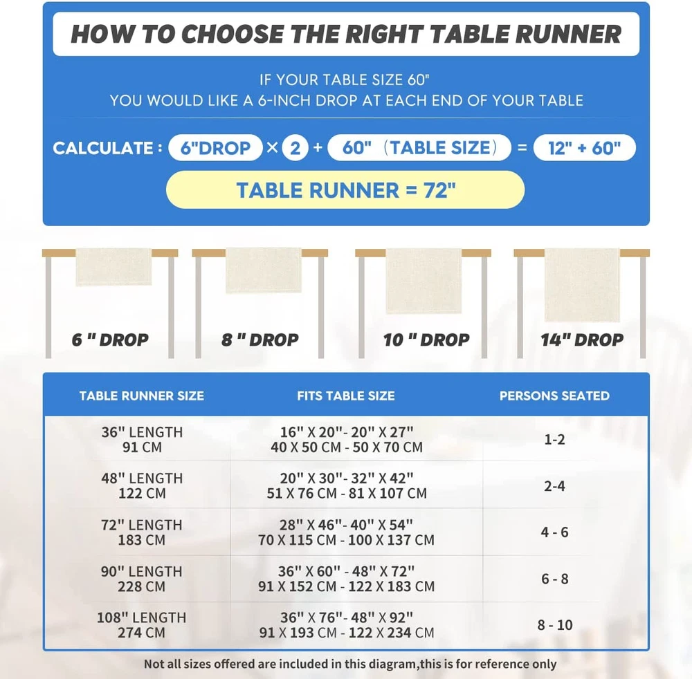 Number of pieces: 1 Import: Imported Type: Does not apply Care instructions: Machine Wash Batteries required: No Product Dimensions: 72 x 13 x 0.1 inches Item Weight: 3.84 ounces Brand: Does not apply Size: 13" x 72", Table Runner Item model number: TableRunner Country of Origin: China Fabric Type: Polyester Color: Beige