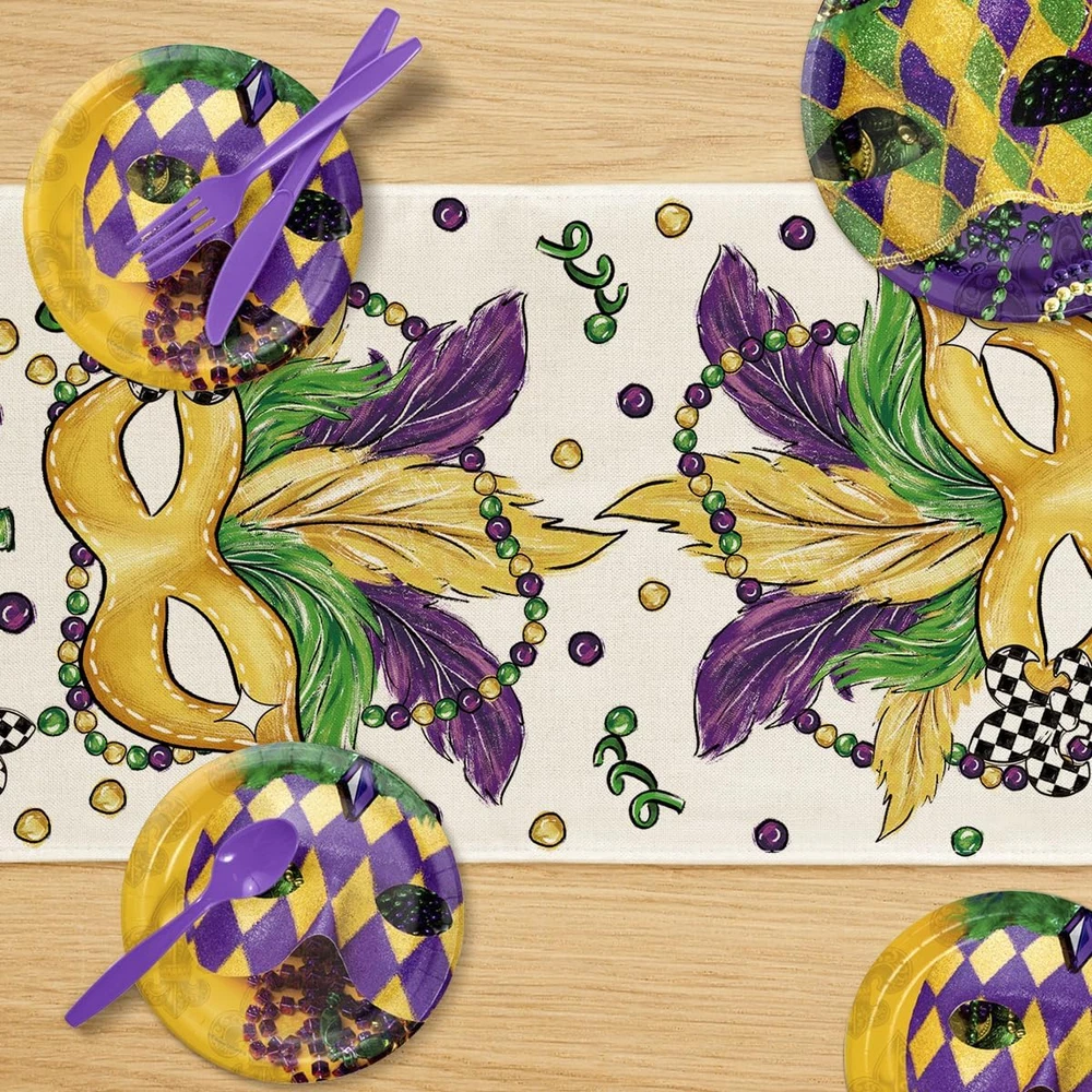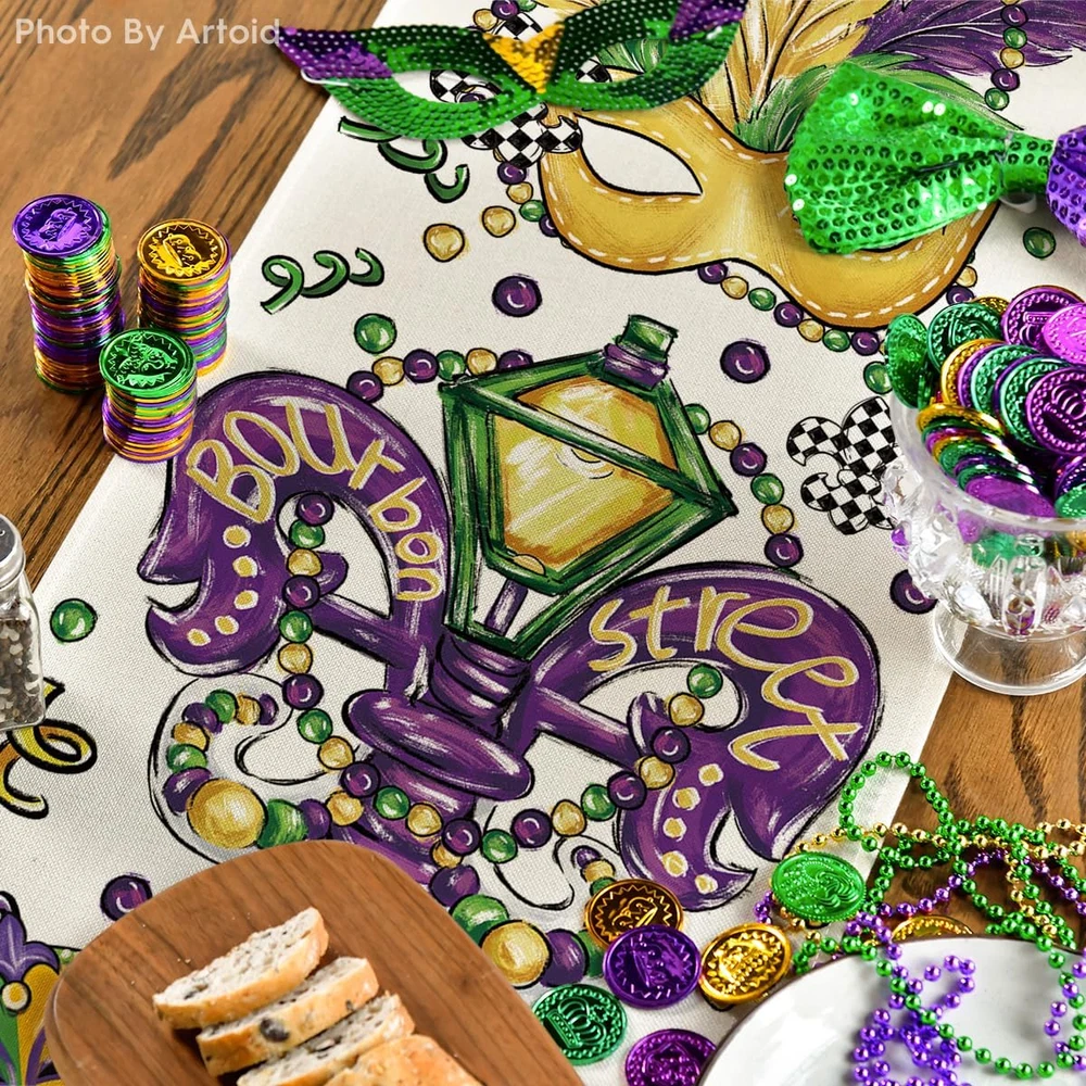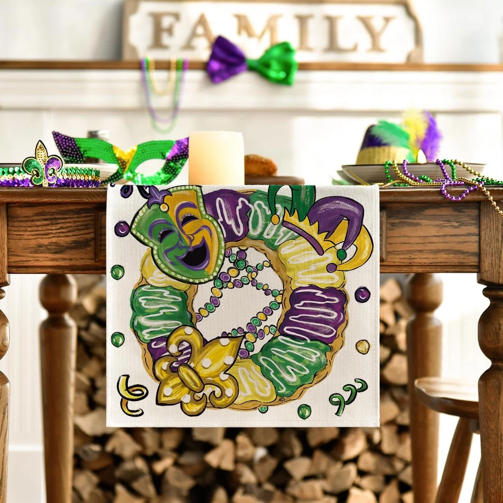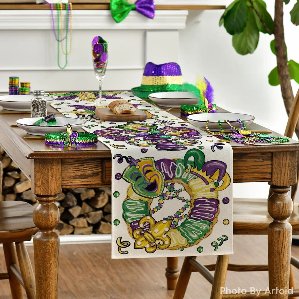 Irises Beads Mask Doughnut Hat Mardi Gras Table Runner, Carnival Kitchen Dining
