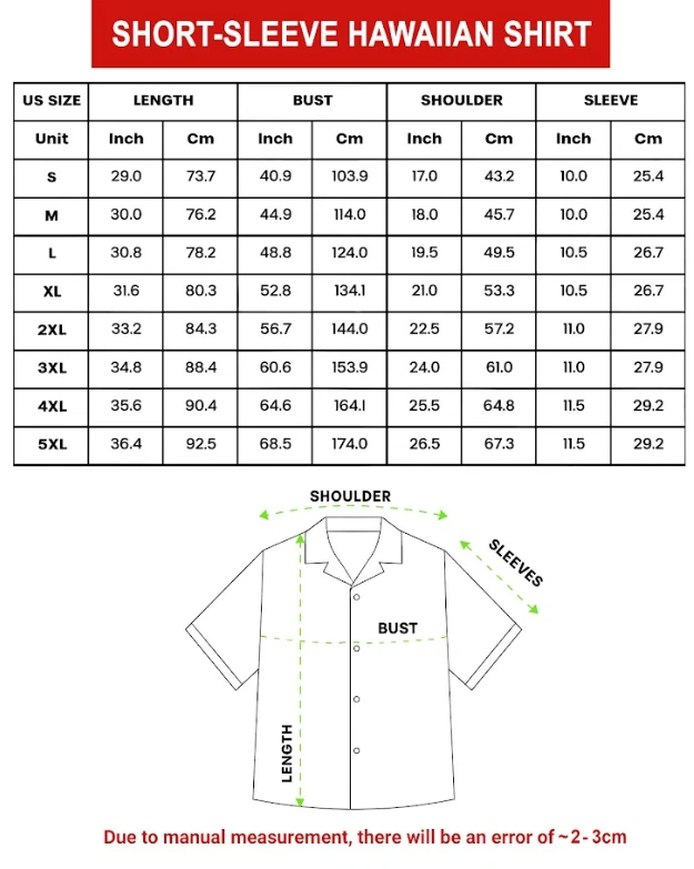 Product Description Bring island vibes to your wardrobe with our Hawaiian Shirt , designed for comfort, style, and vibrant color. Featuring full-surface, edge-to-edge printing , this shirt is perfect for vacations, summer outings, beach days, parties, or everyday casual wear. Product Details Style: Hawaiian / Aloha Shirt Fit: Unisex relaxed fit Material: High-quality polyester fabric Fabric Features: Lightweight and breathable Smooth, soft feel Quick-drying and wrinkle-resistant Printing: Full-color all-over sublimation print Design covers the entire shirt surface Colors remain vibrant wash after wash Design & Construction Short sleeves Button-down front Classic collar Professionally sewn for durability Printed using premium sublimation technology for long-lasting results Care Instructions Machine wash cold , separately Tumble dry low heat Do not bleach Do not iron directly on printed areas Do not dry clean Processing & Shipping Processing Time: 3-5 business days Shipping Time: 7-10 business days (U.S. only) Shipping time does NOT include Saturdays, Sundays, or holidays We always aim to ship orders as quickly as possible: During off-peak months , orders may arrive earlier than estimated During peak seasons (holidays or high order volume), shipping may take slightly longer Sizing Notes (Important) Please refer to the size chart before ordering Manual measurements may vary by 1-3 cm Fit is designed to be relaxed and comfortable Perfect For Beach vacations & summer trips Parties, festivals & themed events Casual everyday wear Unique and fun gifts for birthdays, holidays, or special occasions Our products may be manufactured either in the U.S. or at overseas facilities, depending on availability and production capacity at the time. This is to ensure that we deliver the best possible quality to you. Please rest assured and place your trust in us.