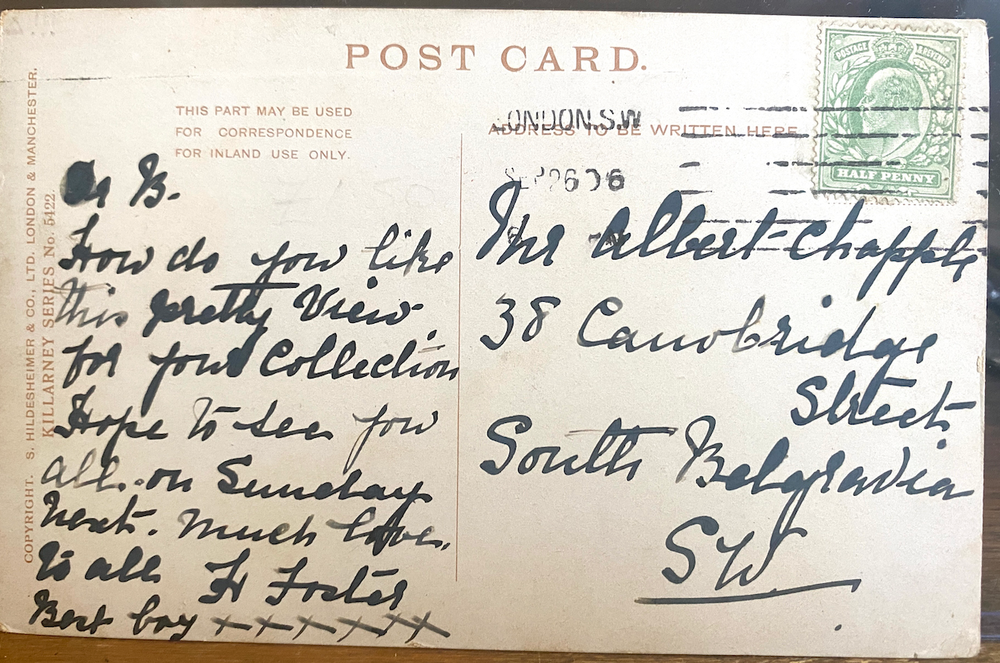 Vintage color art postcard with a view of Ross Castle on the Lakes of Killarney . Card based on a painting by Edgar Longstaffe. Sunset view of with radiant sky and clouds. White caption reads, "Ross Castle, Killarney." Note: Another version of the card includes Longstaffe's name at lower right, but this version is unsigned. Published by S. Hildesheimer & Co., Ldt., London and Manchester, and printed in Bavaria. Card Series No. 5422. Divided back for inland use only; posted 1906 to Belgravia, London to a Mr. Albert Chapple from an H Foster. Good condition with light age, wear, and use. See photos. Ships securely in a protective plastic holder. Free postage to US addresses, and to Ireland. (Request an invoice or receive postage refund after purchase.) We cheerfully combine postage for least cost to other destinations. Sorry -- no tracking available on flat items under $20, which ship at letter rate. Thanks for looking! See more vintage views of Ireland at our eBay store, Montana Gael.