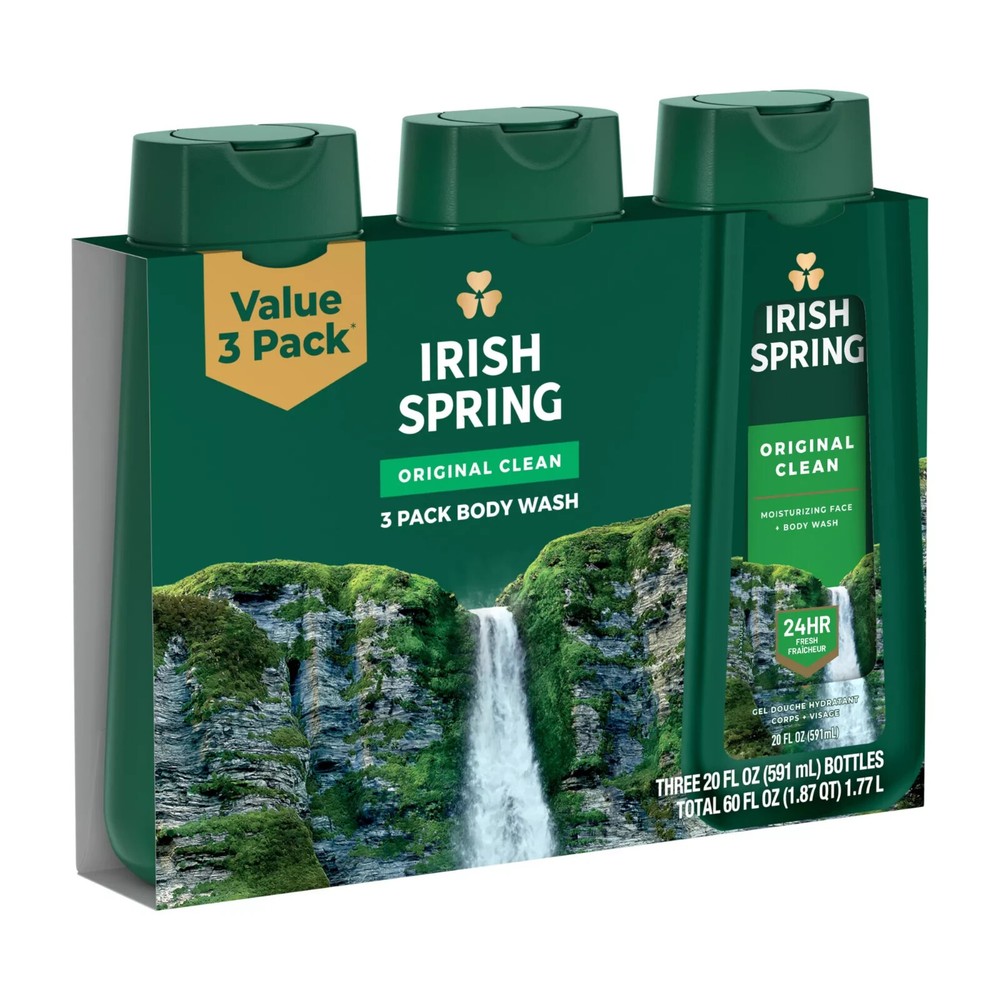 Smell like you came from a nice-smelling place with Irish Spring Body Wash. Count on Irish Spring Original Body Wash to leave your skin feeling clean — Irish Spring's original body wash for men retains skin’s natural moisture while keeping you fresh for 24 hours. Keep the good smells going with Irish Spring body wash. Feel clean, smell serene with the new Irish Spring. The bottle might have a refreshed design, but it’s still the same body wash you love. The packaging refresh is all part of Irish Spring's master plan to bring the amazing places you love to smell straight to your bathroom. Plus, the larger size bottle of body wash for men gives you more time in a nice smelling place and you don't have to replace it as often. Get as fresh as the great outdoors and add some adventure to your everyday with the whole Spring of bar soaps and body washes for men. Smell as great as you feel, so you can focus on moments that turn into memories. Irish Spring Original Body Wash has a sudsy lather that washes away bacteria, so you can use it as a face wash or hand soap and keep the fresh smell going all day long. Made with biodegradable cleansing ingredients, this men’s body wash is paraben free and formulated without phthalates. Feel good while washing from head-to-toe with Irish Spring. Product Features: Irish Spring Original body wash has a fresh look and a great smell so you can smell like you came from a nice-smelling place Fresh look, same smell, larger size (20 oz. bottle vs.18 oz. bottle) Irish Spring body wash keeps you fresh for 24 hours Made with biodegradable cleansing ingredients, this body wash for men retains skin’s natural moisture, so you can feel as great as you smell Body wash for men that is paraben free and formulated without phthalates This men’s body wash has a sudsy lather that washes away bacteria Use Irish Spring Original Clean Body Wash as a face wash or hand soap and stay fresh and clean all day long Includes three 20 oz. bottles Ingredients: Water/Eau, Sodium C12-13 Pareth Sulfate, Cocamidopropyl Betaine, Parfum/Fragrance, Citric Acid, Cocamide MEA, Sodium Benzoate, Sodium Chloride, Tetrasodium EDTA, Polyquaternium-7, Green 3, Yellow 5.