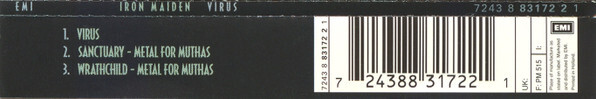 Welcome to Werkstraat Records. Bringing you rare and collectable music on Vinyl, CD & Cassette. We are a small company who care about the quality of our music and our customers. Most of our music sales are pieces that have been released over the last 40 years and have been played previously. Any questions ? just ask and we will be happy to help. Please read carefully below for exact details of the item for sale: Listing Title and Pictures are generic & AUTO generated. Please read the Item Specific details and Notes below for details regarding the condition of the actual item for sale in this listing. Please contact us first if you have any issues with your order before leaving feedback. We will always rectify problems when they occur. Shipping: Multi-purchase post discounts applied in your cart. 7-8 Vinyls sent for £4.95 UK only. Up to 20CDs sent for £4.95 UK only. All packages ship via 2nd Class recorded tracking service. NOTE: All images are stock and not of the actual item unless noted in the listing below. Details: Artist : Iron Maiden Title: Virus Format: (CD, Single) Item Specific details: Some light marks to the disc mostly outside the data area. Notes lovely. Media Condition : Very Good Plus (VG+) Sleeve Condition : Near Mint (NM or M-) Released : 1996 Label : EMI Catalog Number : 7243 8 83172 2 1 Location_ : Box 12.5 Barcode and Other Identifiers : Barcode 7 24388 31722 1 Barcode 724388317221 Label Code LC 0542 Rights Society bel BIEM Price Code PM 515 Matrix / Runout 883172 2 1 . 1-1-4-NL Matrix / Runout 883172 2 1 1-2-1-NL Matrix / Runout 883172 2 1 1-1-2-NL Matrix / Runout 883172 2 1 1-1-3-NL Matrix / Runout 883172 2 1 1-1-1-NL Matrix / Runout 883172 2 1 1-1-5-NL Mastering SID Code IFPI L042 Mould SID Code ifpi 1553 Mould SID Code ifpi 15FF Mould SID Code ifpi 1520 Mould SID Code ifpi 152F Mould SID Code ifpi 1546 Mould SID Code ifpi 1593 Notes : Issued in a J-card case, with foldout insert, blank on the inside. ℗ 1996 The copyright in this sound recording is owned by Iron Maiden Holdings Ltd. under exclusive licence to EMI Records Ltd. © 1996 Iron Maiden Holdings Ltd. Tracks two and three originally released on "[m=150039]" February 1980. Tracks two and three recorded at EMI Manchester Square, November 1979 Inlay: Printed in Holland. CD: Made in Holland. Track List : 1. Virus 6:14 2. Sanctuary (Live) "Metal For Muthas" 3:33 3. Wrathchild (Live) "Metal For Muthas" 3:06 Licensed To EMI Records Ltd. Marketed By EMI Distributed By EMI Phonographic Copyright (p) Iron Maiden Holdings Ltd. Copyright (c) Iron Maiden Holdings Ltd. Published By Zomba Music Publishers Ltd. Recorded At EMI Studios, Manchester Square, London Pressed By EMI Uden Glass Mastered At EMI Uden