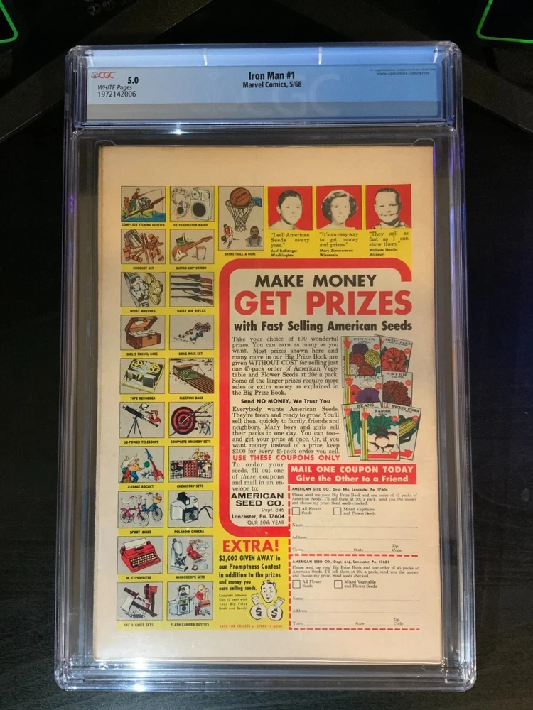 Comic Details : Title : The Invincible Iron Man #1 Publisher : Marvel Comics Release Date : May 1968 Key Features : The first solo issue of Iron Man following "Tales of Suspense." "Big Premiere Issue" with classic Gene Colan and Johnny Craig cover art. One of Marvel’s most iconic Silver Age key issues. Grade & Condition : CGC Grade : 5.0 (Good/Very Good), with White Pages . The CGC case is intact and securely sealed. Note on CGC Cases : CGC slabs may have minor imperfections such as Newton rings, scuffs, standard surface wear, or small cracks that are typical and deemed acceptable by CGC. These minor defects do not impact the integrity of the grade or comic protection. Any significant damage to the slab will always be disclosed, and we do not list comics with damaged slabs that compromise their protection. Why Buy? Collector’s Key Issue : Iron Man #1 is a must-have for fans of Marvel’s Silver Age and a key issue in Iron Man’s legendary run. Historic Significance : The launch of Iron Man’s standalone title from the pages of "Tales of Suspense." Affordable Entry : A great mid-grade option for collectors or investors looking for an accessible copy of this iconic issue. Shipping Details : Comic will be carefully packed with ample protection to ensure safe delivery. Returns : Returns are not accepted for this listing. Please review the description and photos carefully before purchasing.