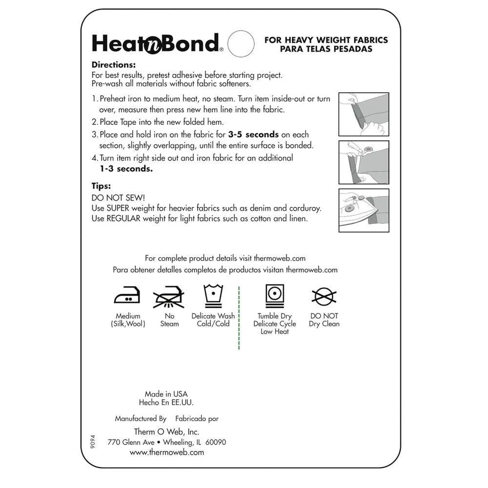 FREE SHIPPING HeatnBond Hem Iron-On Adhesive, Super Weight, 3/4 Inch x 8 Yards, White About this item Product Overview: A clear image of the adhesive roll with its packaging, showcasing the size (3/4 inch x 8 yards) and the white color. Application Process: Preparation: Photos showing how to cut the adhesive to the desired length. Application: Step-by-step images demonstrating how to place the adhesive on the hem or fabric edge. Ironing: Visuals of the ironing process, including the temperature settings and pressing techniques. Before and After: Side-by-side photos of fabric or hems before and after using the adhesive to show the neat, professional finish. Close-Up Details: Detailed images of the adhesive strip to highlight its texture and thickness. Usage Tips: Infographics or images providing tips for best results, such as proper ironing techniques and fabric types that work best with the adhesive. Durability and Longevity: Visuals or charts showing how the adhesive holds up over time, including any washing instructions or tips for maintaining its bond. Comparison: If relevant, compare HeatnBond with other types of hem adhesives to highlight its advantages, such as its super weight or ease of use. Safety and Care: Images or icons indicating any safety precautions or care instructions for using the adhesive.