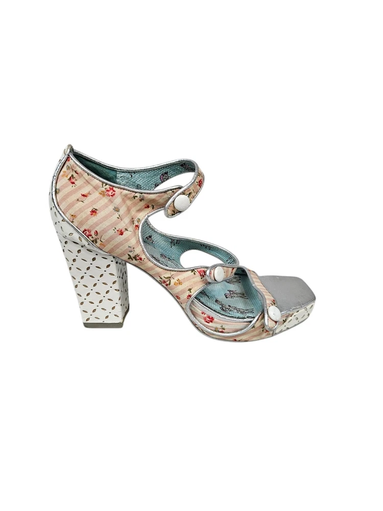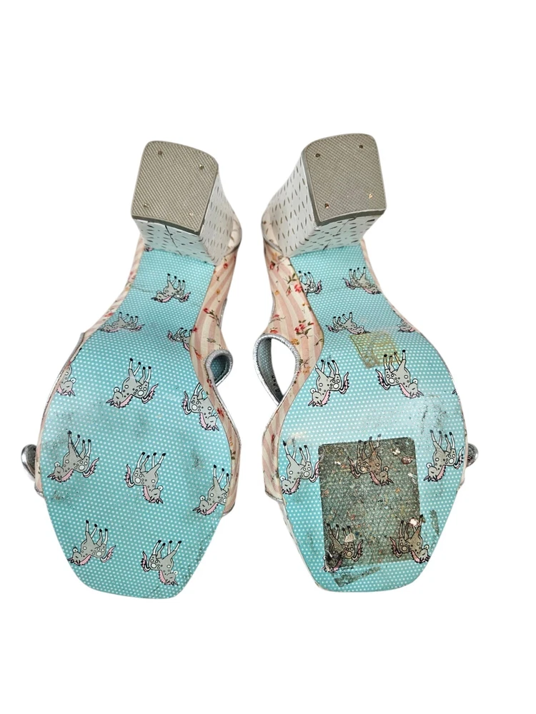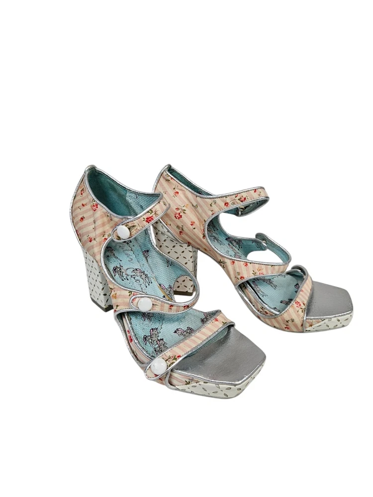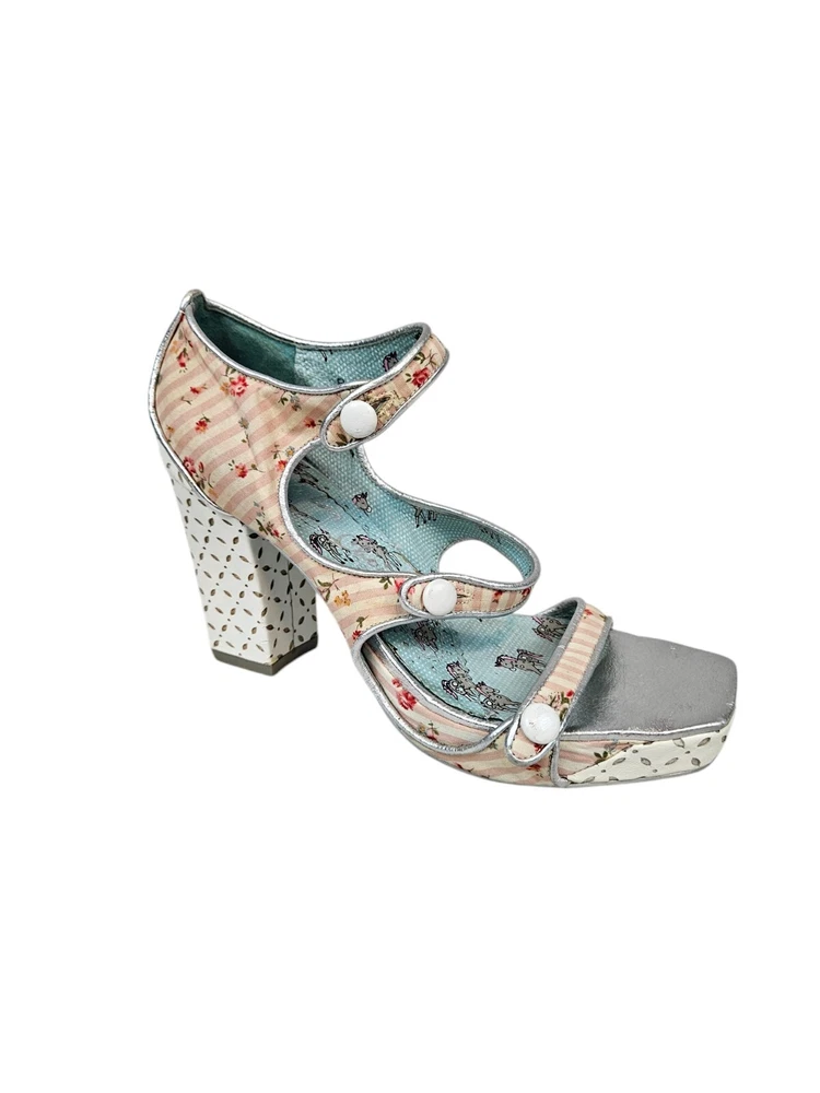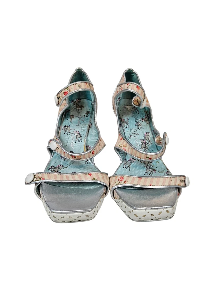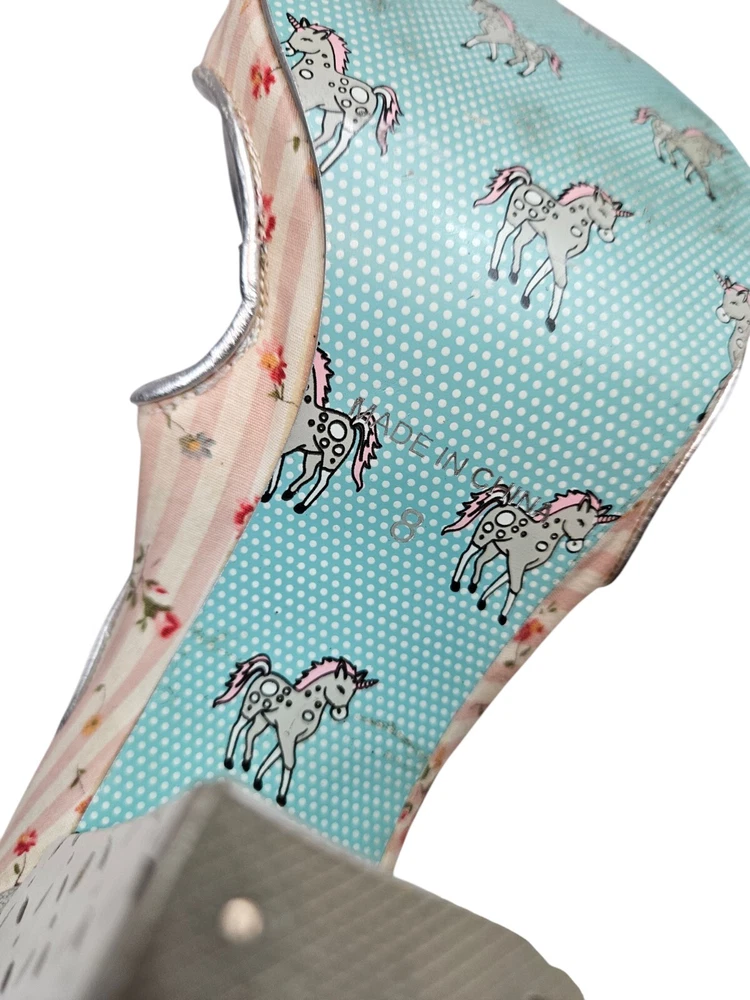 Irregular Choice Striped Floral Strappy Platform Heels Unicorn Bottoms Size 8 In excellent condition Irregular Choice Striped Floral Strappy Platform Heels Unicorn Bottoms Size 8 Women's. Features inspired 50s style platform heels by Irregular Choice, chucky heel with leather perforated diamond shape, peep toe, 3 straps with white leather buttons, silver toe beds, perforated white leather diamond print platform, square peep toe, pink and white striped floral print, Tiffany Blue bottoms adorned with unicorns, pin up girl style, cosplay, feminine heels, unique high heels. Measurements platform height .75" heel height 3.5" Fabric unknown This is a pre-owned item that may show signs of wear. In excellent condition, light black mark on 1 button and on back.