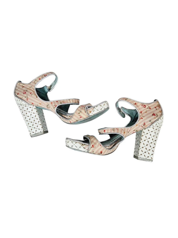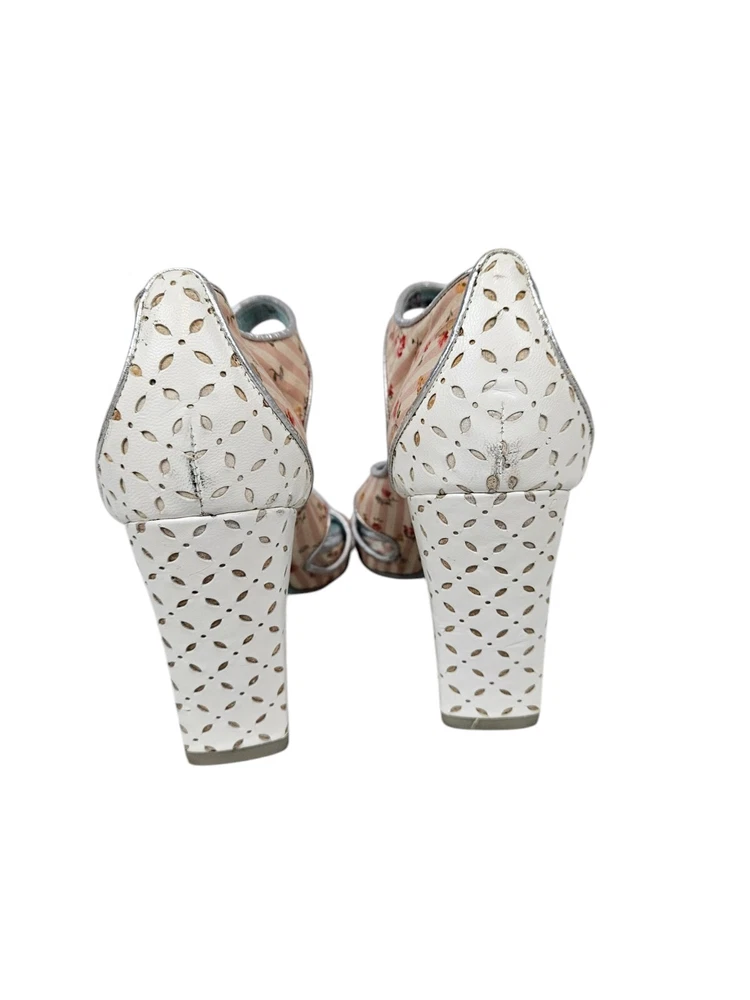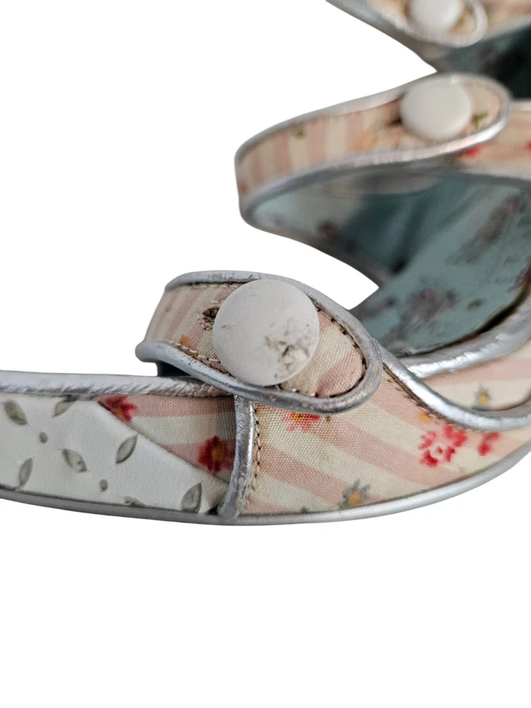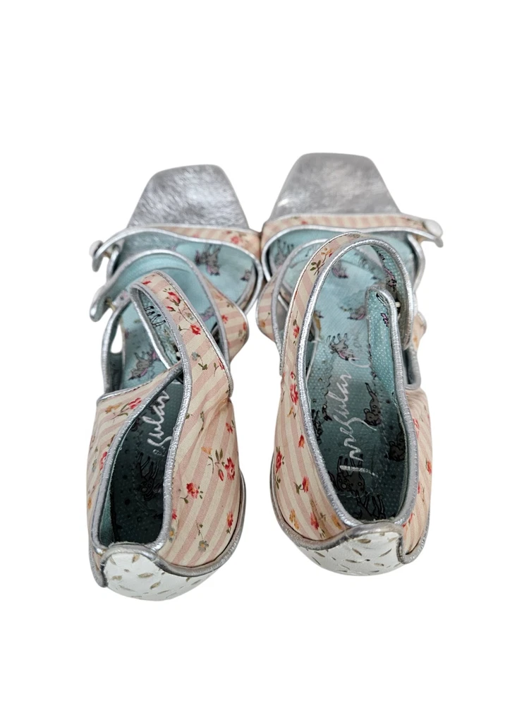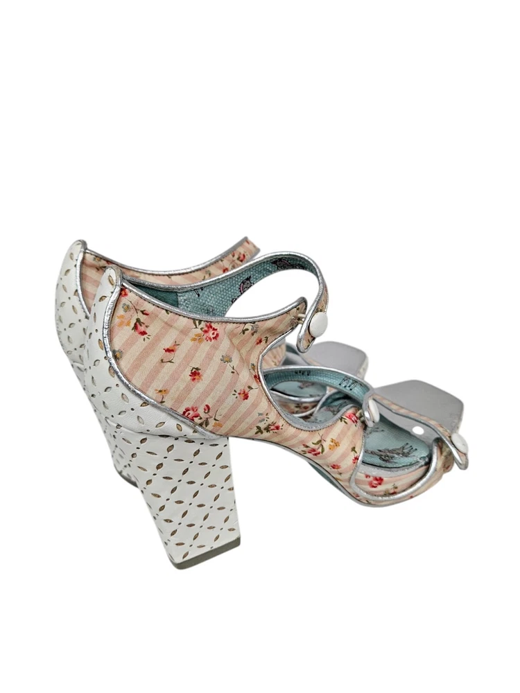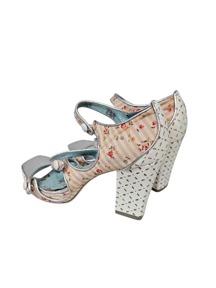 Irregular Choice Striped Floral Strappy Platform Heels Unicorn Bottoms Size 8 In excellent condition Irregular Choice Striped Floral Strappy Platform Heels Unicorn Bottoms Size 8 Women's. Features inspired 50s style platform heels by Irregular Choice, chucky heel with leather perforated diamond shape, peep toe, 3 straps with white leather buttons, silver toe beds, perforated white leather diamond print platform, square peep toe, pink and white striped floral print, Tiffany Blue bottoms adorned with unicorns, pin up girl style, cosplay, feminine heels, unique high heels. Measurements platform height .75" heel height 3.5" Fabric unknown This is a pre-owned item that may show signs of wear. In excellent condition, light black mark on 1 button and on back.