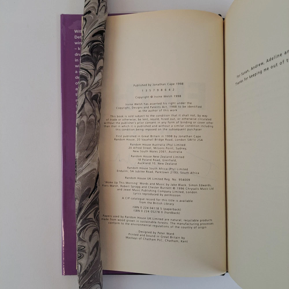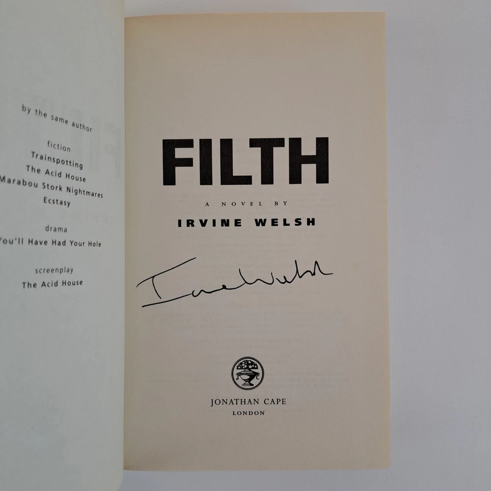 FILTH [Signed] Author: Welsh, Irvine Title: FILTH [Signed] Publication: London, UK: Jonathan Cape, 1998 Edition: First UK Edition, First Printing Description: Octavo, 393 pages. In Very Good condition with Near Fine condition dust jacket. Spine is purple with black and white lettering. Dust jacket protected by mylar covering, price uncut: "£15.99" on front flap. Boards have mild shelving wear along spine head and tail. Text block edges have mild age toning and light gray smudges along head and fore edges. Signed flat by Irvine Welsh on title page. Shelved in hallway. Seller ID: 1388947 Subject: Literature Welcome to the eBay store of Second Story Books! DC's Oldest Rare and Used Bookstore, Second Story Books operates two open shops in the Washington D.C. metropolitan area. We have an extensive internet presence and provide accredited appraisals member ASA. This listing was created by Bibliopolis.