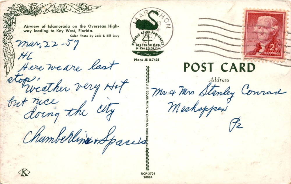 MAKE AN OFFER. THE MORE YOU BUY THE BETTER DEAL I WILL ACCEPT The postcard features an airview of Islamorada on the Overseas Highway leading to Key West, Florida. The photo was taken by Jack & Bill Levy. Islamorada is a village in the Florida Keys known for its fishing, snorkeling, and diving opportunities.