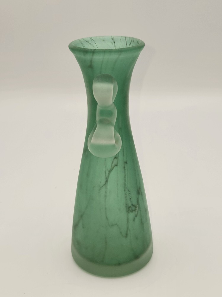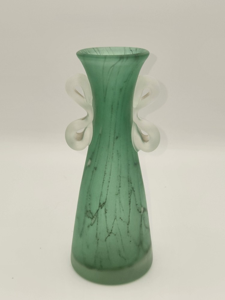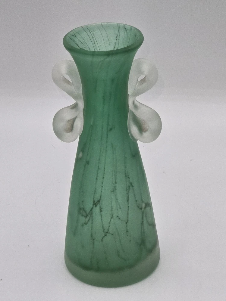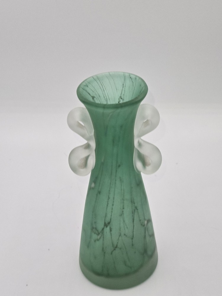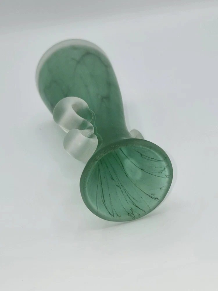 This Israeli Glass Satin Green Bud Vase features an abstract asymmetrical shape with frosted handles, hand-blown from green satin glass in Israel during the 1950s. Standing at 6.5 inches tall, this small vase showcases a unique artistry that makes it suitable for all occasions. With its mid 20th-century origins and original handmade construction, this piece exudes a vintage charm perfect for collectors or those appreciative of abstract art.