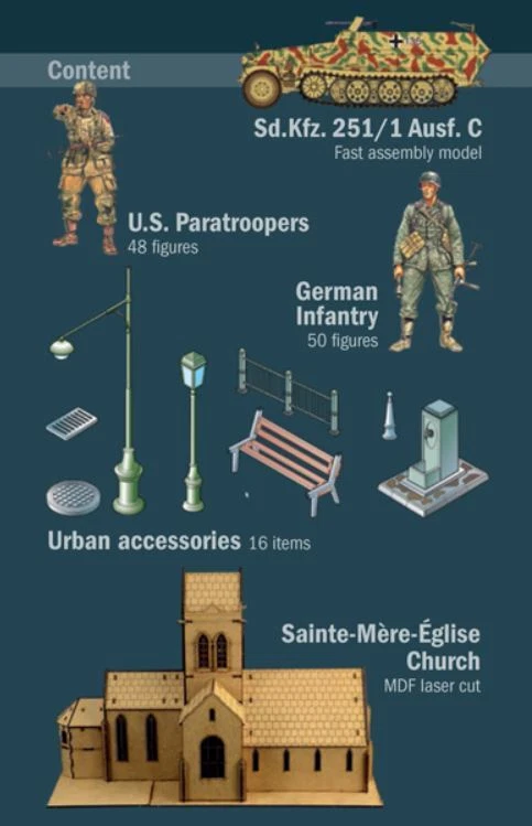 Italeri was founded in the early 60s, with that enthusiasm that only the unbridled passion of youth can create. Since they were boys, the two founders of Italeri loved airplanes and military vehicles. Soon they were no longer satisfied with the models available at the time: they wanted something more and better. What they wanted was not available, so they decided to produce it themselves. Their hobby turned into an accurate research, and became the motivating force to produce the models that modelers want, with no imperfections whatsoever. Thus the company asserted itself, always increasing his range of products and growing. Also thanks to the imagination and the talent of the founders and of their colleagues, Italeri in time became a leader in modeling! Item is brand new and in its original factory packaging. Listing images are stock pictures provided by the manufacturer or the distributor. Within the overall strategic planning of the acclaimed operation 'Overlord', the code name for the Allied landings on the beaches of Normandy, the French village of Sainte-Mere-Eglise played a key role. On battle plan maps it was rightly identified as an important road junction that the defending Germans could have used to carry out rapid counter attacks directed towards the Utah and Omaha beacheads. It was therefore strategically important to attack and quickly occupy the village with American airborne troops to support the landings. In the early hours of June 6, 1944, paratroopers of the famous 82nd and 101st US Airborne Divisions secured the small French town following a period of intense fighting. The contribution made by the American paratroops has been widely recognised and celebrated in numerous movies from 'The Longest Day' made in the 1960s, to the most recent war movies.