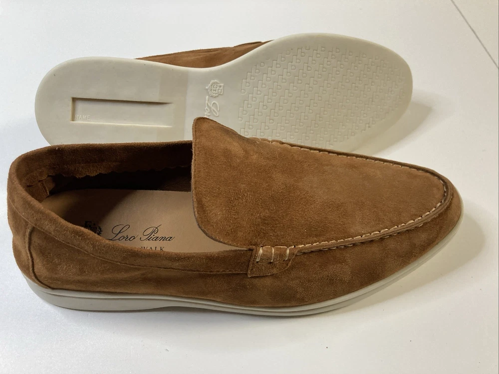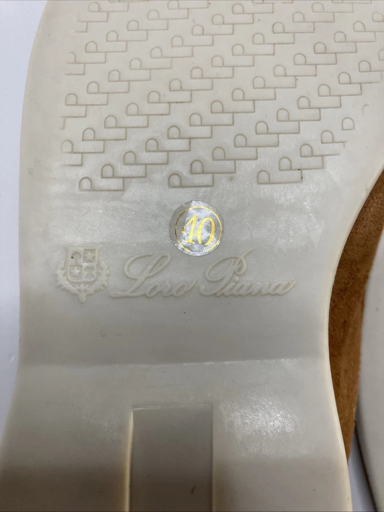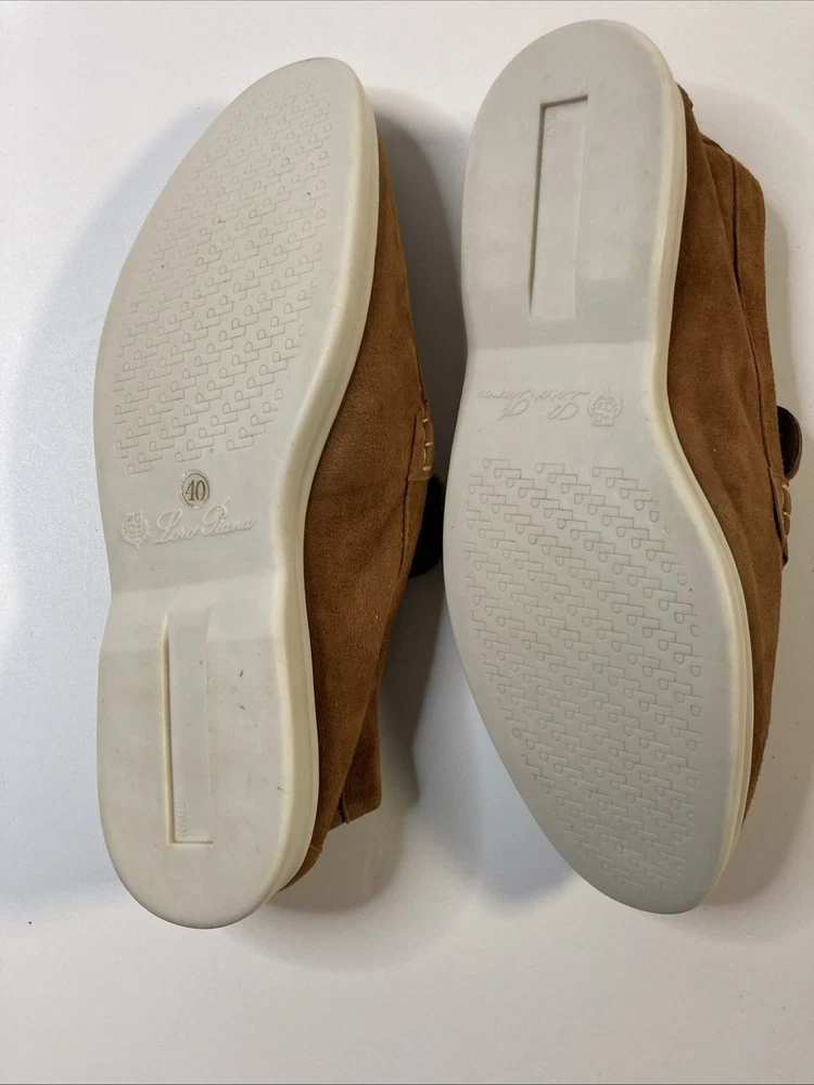 The product is a pair of Italian hand-made Loro Piana summer walk women's suede loafers in a stylish brown color. Crafted with high-quality materials, these loafers are designed to provide comfort and sophistication for any summer outing. The size is 8.5, narrow which is equivalent to a European 40, making them a versatile choice for various occasions. Perfect addition to any woman's shoe collection, these loafers embody Italian craftsmanship and timeless style. Only worn once so this is someone’s good fortune if looking for hand made Italian loafers Thanks for looking