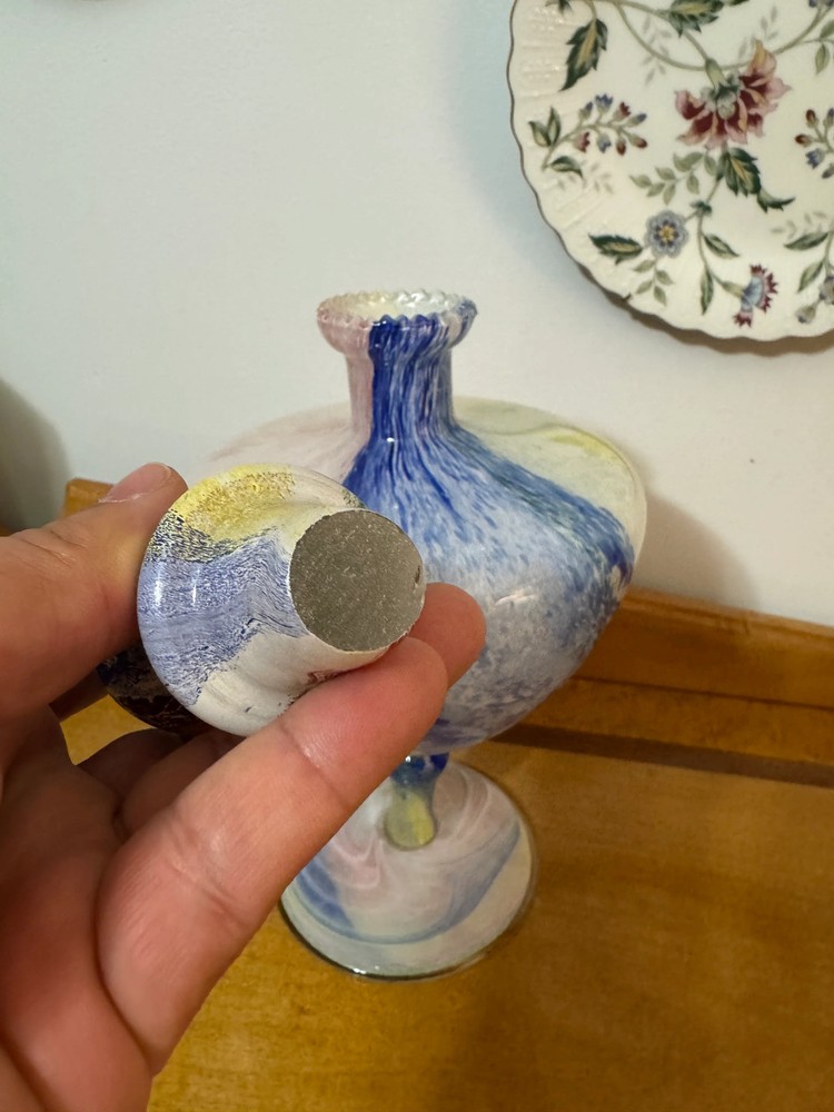 Discover the beauty of this Italian Murano glass vase or bottle, designed to mimic a genie bottle and featuring an elegant stopper. This exquisite piece will elevate your decor and make a stunning statement in any room. CONDITION: Pre-owned and in good condition; the glass on the stopper is rougher than the rest of the vase. See the attached photos. Color: Multicolor, green, blue, burgundy Materials: Glass Measurements: 13.25 in. H x 7 in. W x 7 in D, approximately "All our items are sold as is." We are committed to providing you with the best customer experience and affordable prices. Thank you for supporting our small business and contributing to a better and cleaner world.