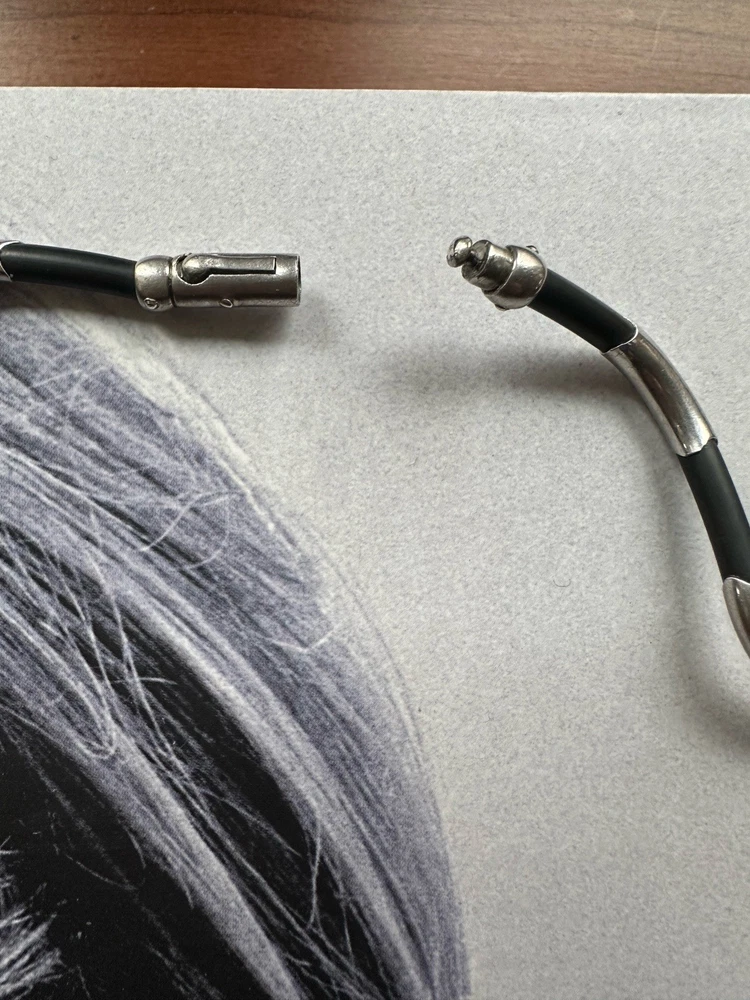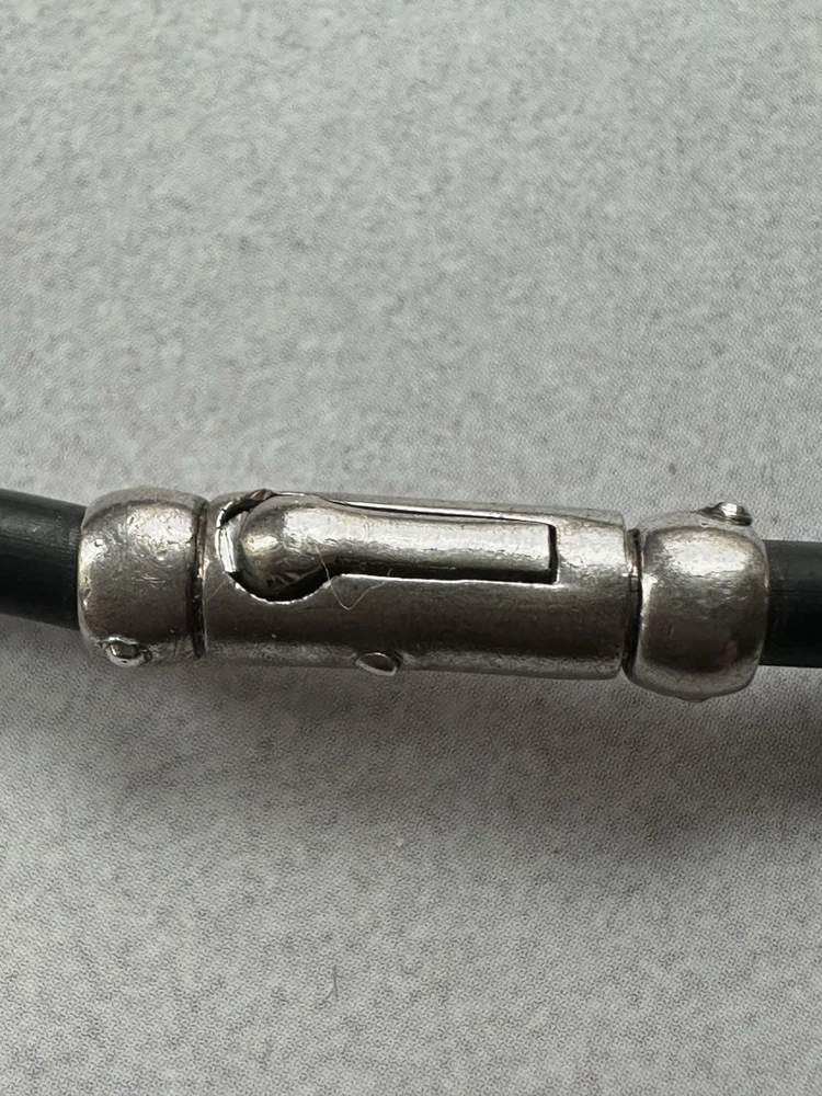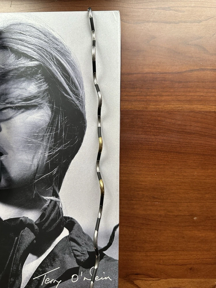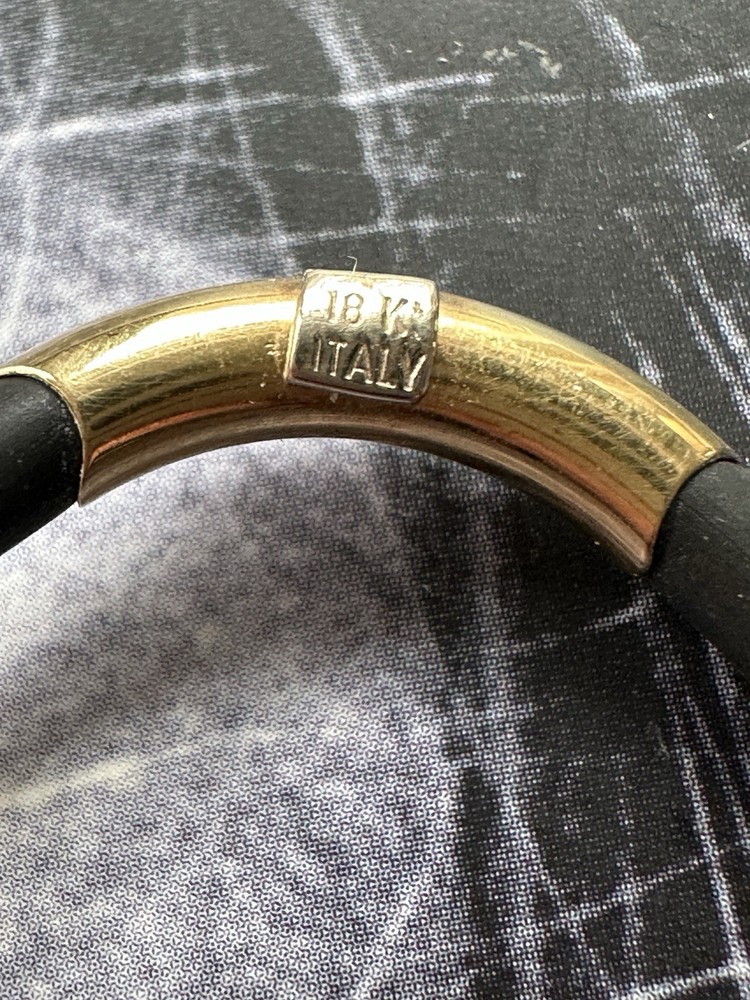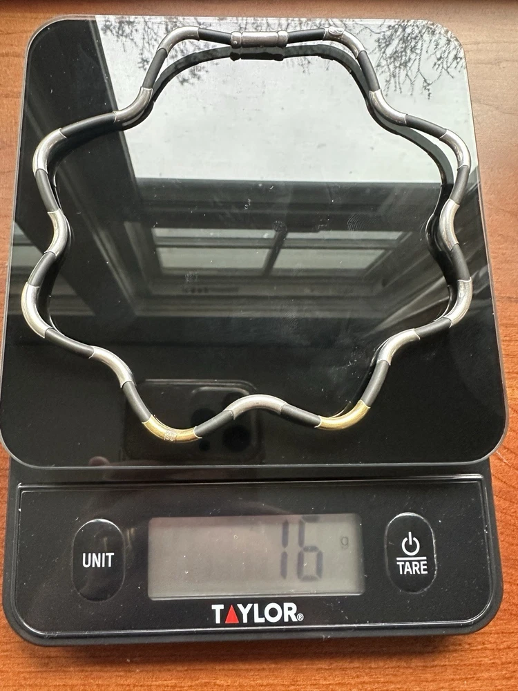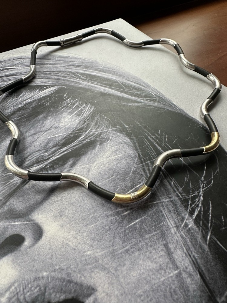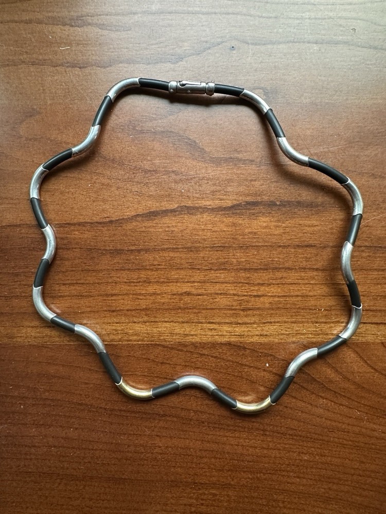 Italian Modernist Wave Necklace Sterling Silver & 18K Yellow Gold | 16.5 ″ Length | Hidden Clasp Made in Italy A compelling example of late 20th century Italian modernist jewelry, this sculptural necklace pairs a rhythmic pulse of tubular sterling silver links with warm accents of 18K solid gold, all united by a seamless hidden clasp. At 16.5 ″ long, it sits elegantly at the collarbone, balancing architectural purity with subtle luxury. Each link measures approximately ½″ long × 3–4 mm wide, creating a refined tactile rhythm that underscores the piece’s design integrity. The mixed-metal composition and precision engineering are characteristic of Italian workshop production centered in Vicenza, Arezzo, and Milan during the post-modern and late modernist periods. Details • Length: 16.5 ″ • Total weight: ~16 g • 13 sterling silver tubular links (stamped 925) • 2 solid 18K yellow gold tubular links (stamped 18K) • Approx. tube size: ~ ½″ long × 3–4 mm wide • Integrated hidden clasp for seamless visual flow • Made in Italy Condition Excellent vintage condition. No structural issues or repairs. Clasp is secure and functions smoothly. Light surface wear consistent with careful use. Design Context This piece reflects Italian modernist design principles popular in the late 1970s–early 1990s, emphasizing form, proportion, and material interplay over ornamentation. It is stylistically linked to workshop jewelry traditions from Vicenza and Milan and can be appreciated alongside other Italian sculptural jewelry of the era
