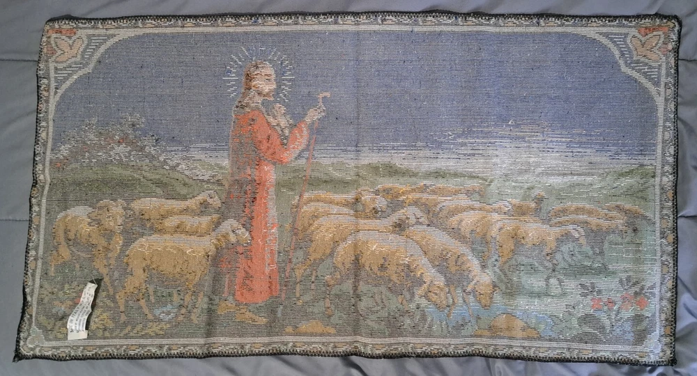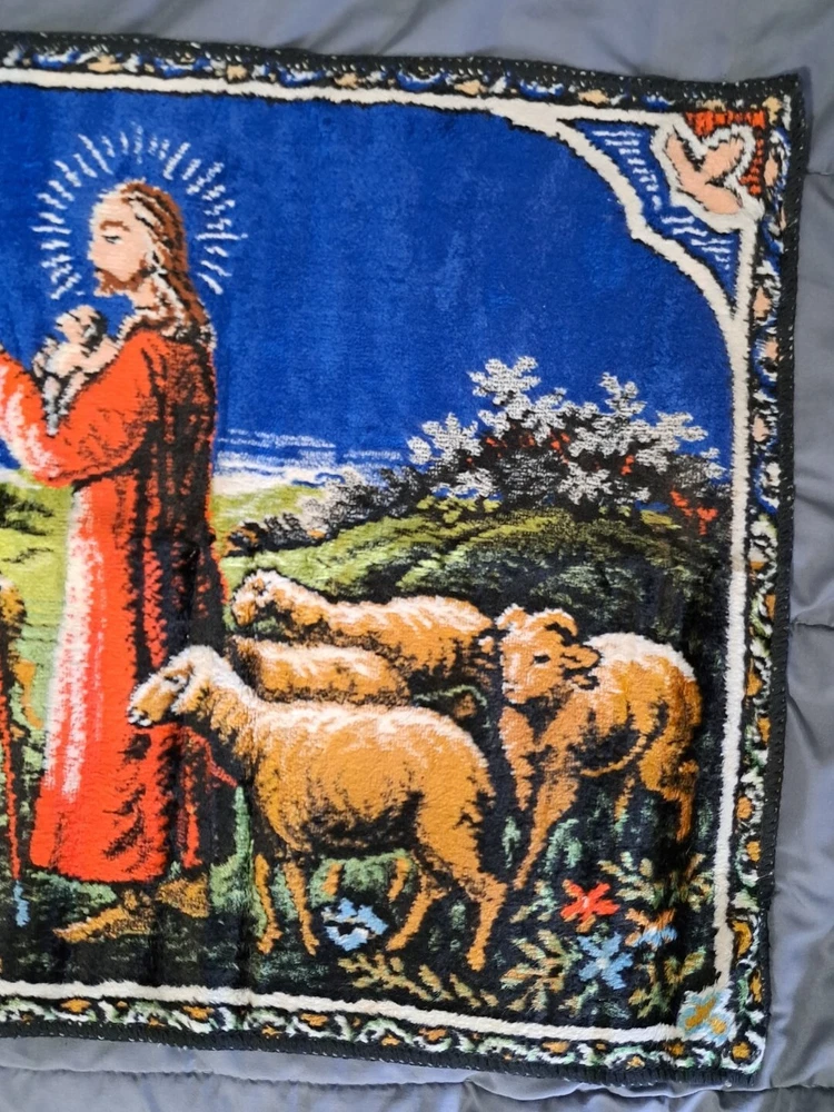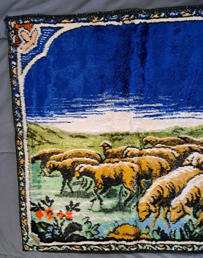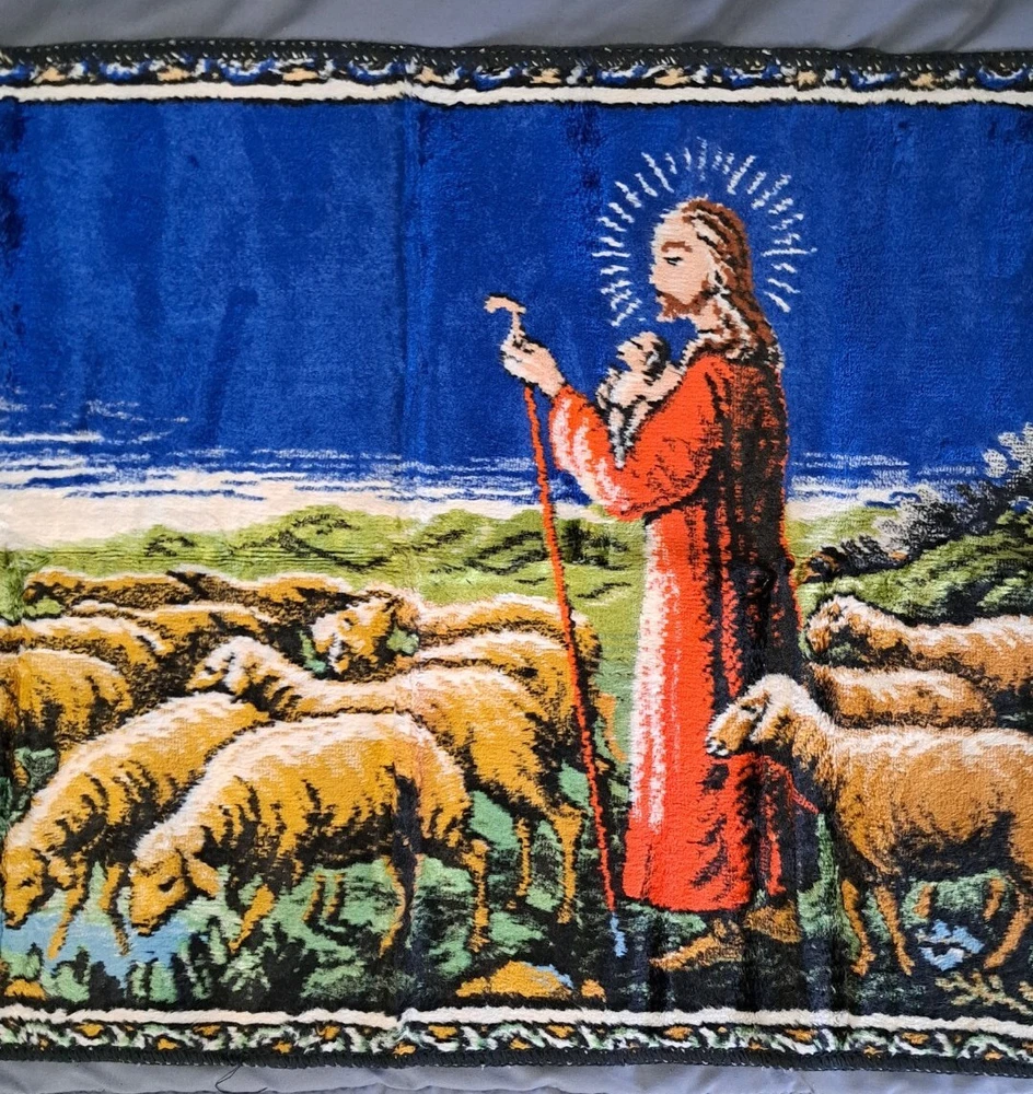 Vintage Wall Hanging Rug Italian Tapestry Jesus Shepard Flock Made In Italy It has that crushed velvet feel/texture Approx 20” tall x 38" across I consider this to be in very good preowned condition Please view all photos zooming in on them as they are part of the description for you to judge condition. The made in Italy tag is held on with a staple, which is how it was when I purchased it years ago.
