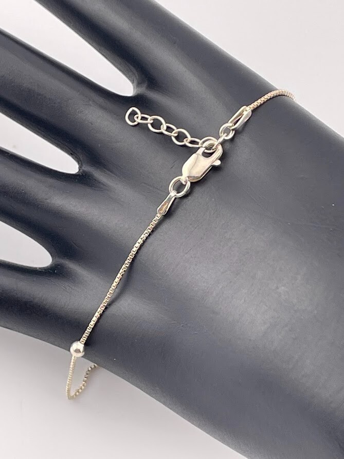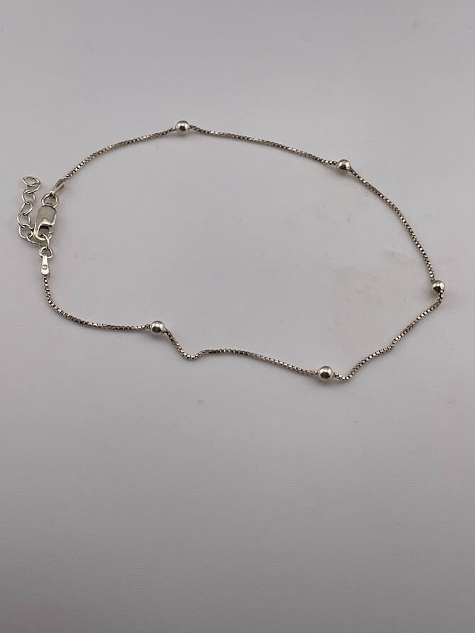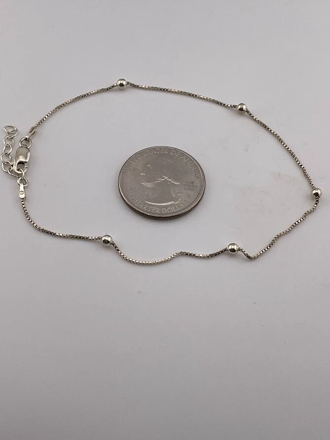 ITALY 925 STERLING SILVER 3MM BEAD STATION SATELLITE ANKLET BRACELET 9-10" 242 CLASSIC ****************************** Thank you for your interest in our jewelry. We'd like to introduce ourselves. We are just a retired couple who love matching our customers with great jewelry. We're not professional jewelers. To have the best shopping experience we like to recommend the following: Please measure your hand, wrist, finger or neck to ensure the best fit. We can use your measurements to help with sizing. Please ask all the questions you want. We know some stuff and, if we don't, we'll do the research. We like to learn too. More Stuff: If an item is described as "gold over 925 sterling silver" this means it is gold vermeil. Vermeil is the process by which a layer of gold (usually 14k or 18k) is bonded to sterling silver. We only clean with gentle soap and warm water to avoid damage. The items we sell may be new or pre-owned and may have normal wear, slight damage, and/or tarnish. We make every effort to ensure the items we sell are as described. This includes testing to confirm metal purity if the item isn't marked, and testing for gemstone identity. We try to put measurements in the jewelry description and include a photo of each piece with a U.S. quarter (25mm).