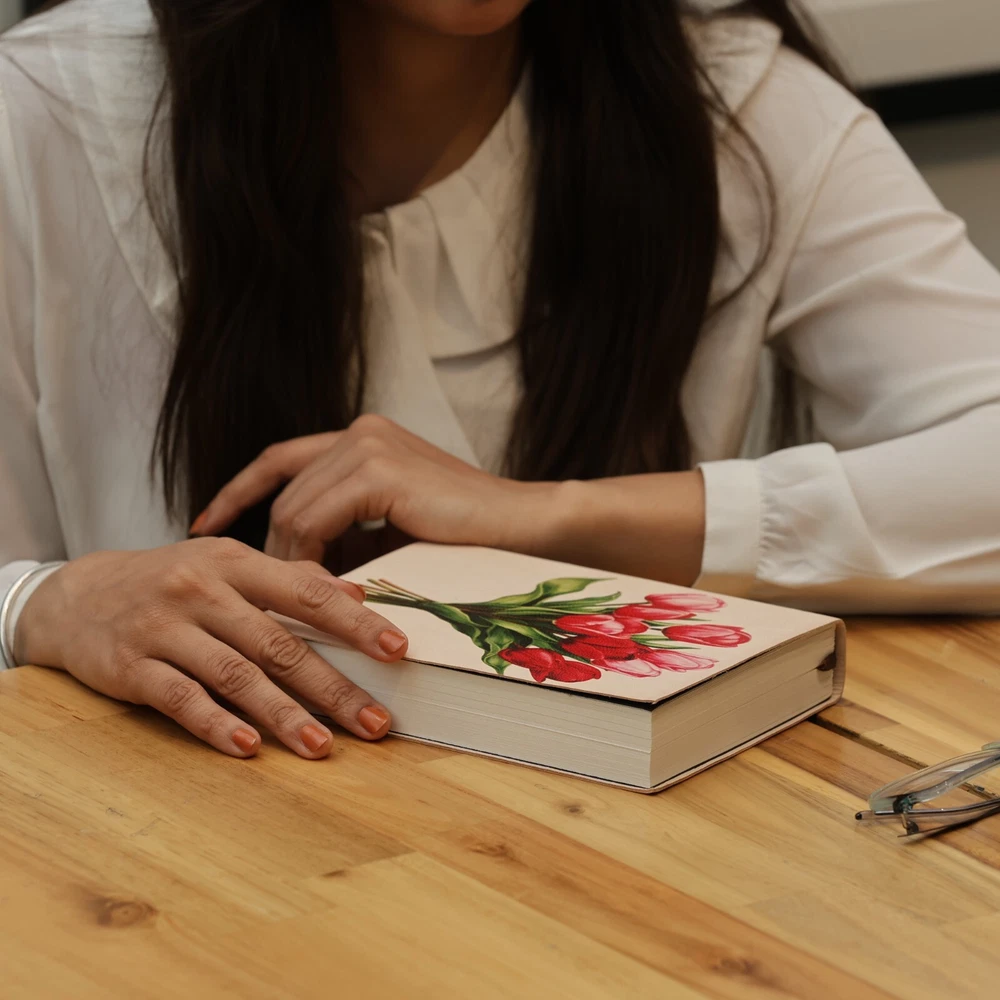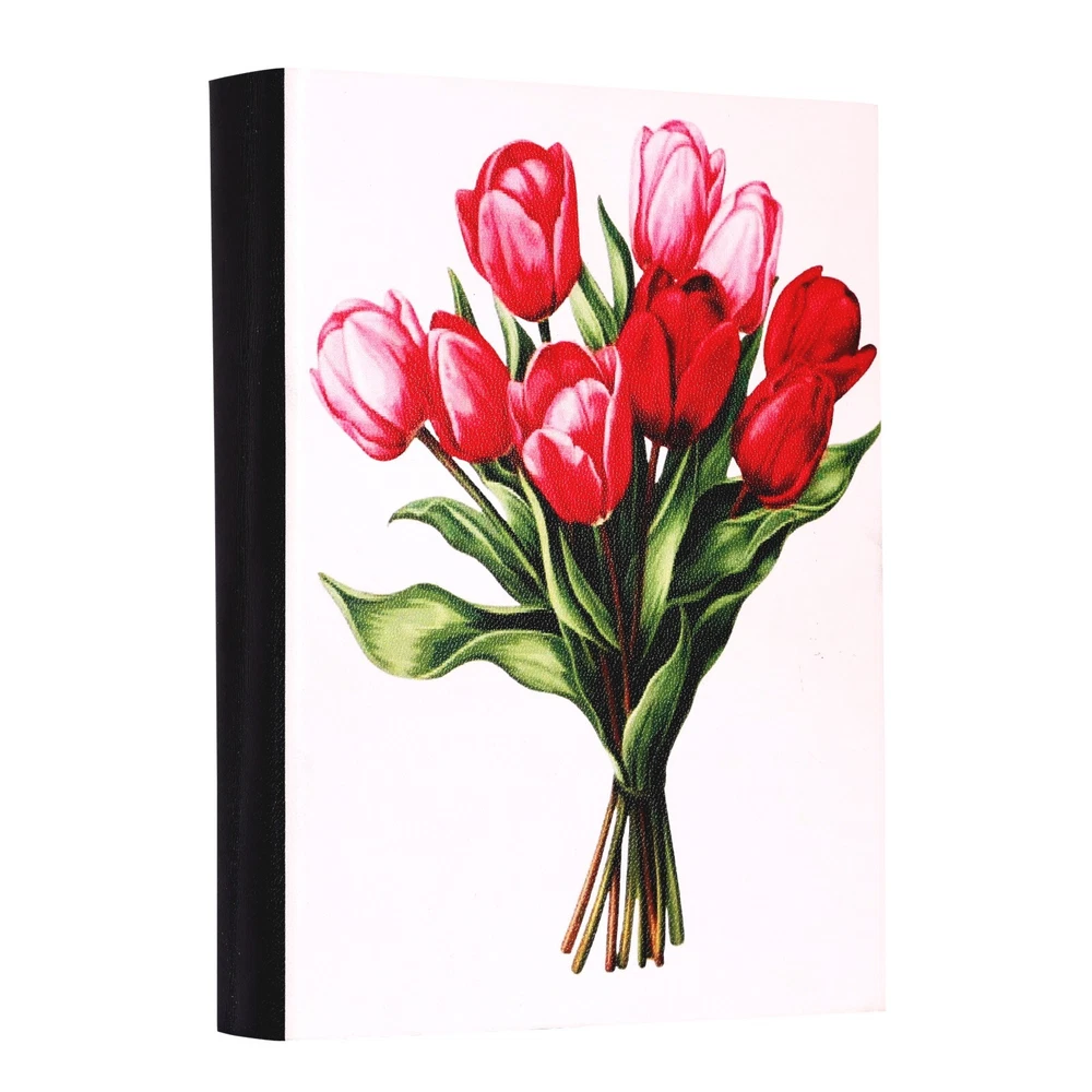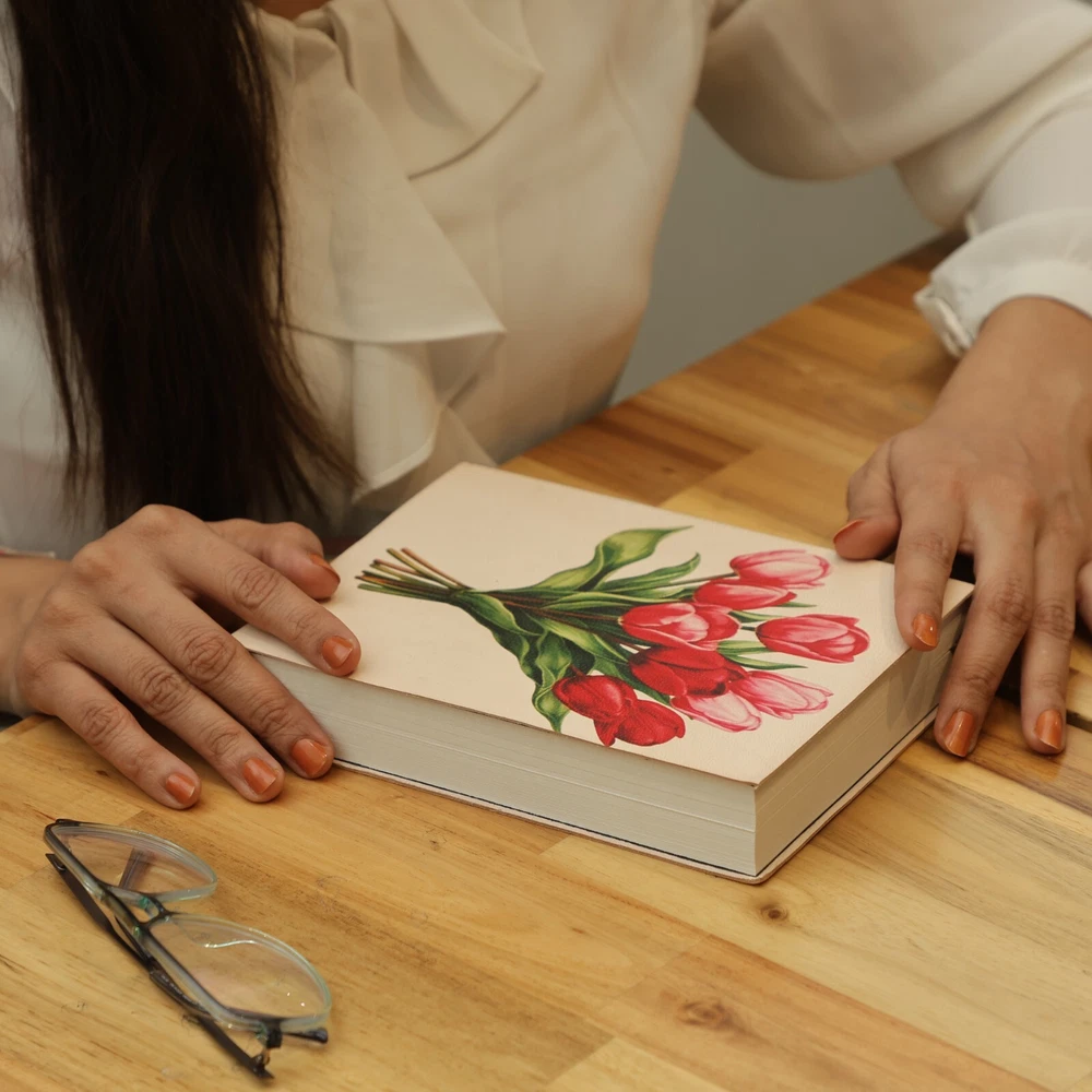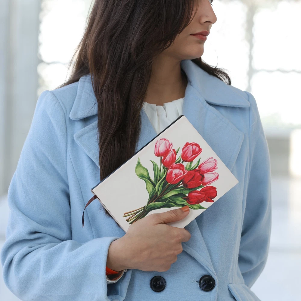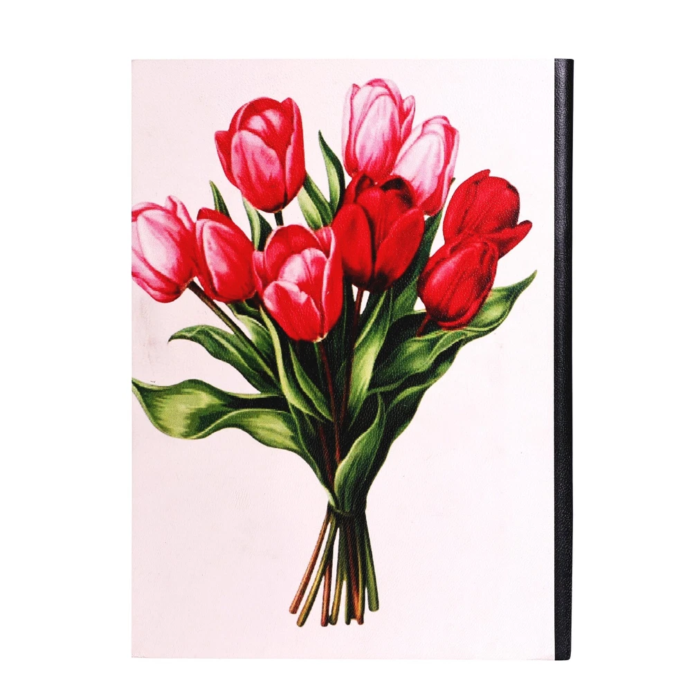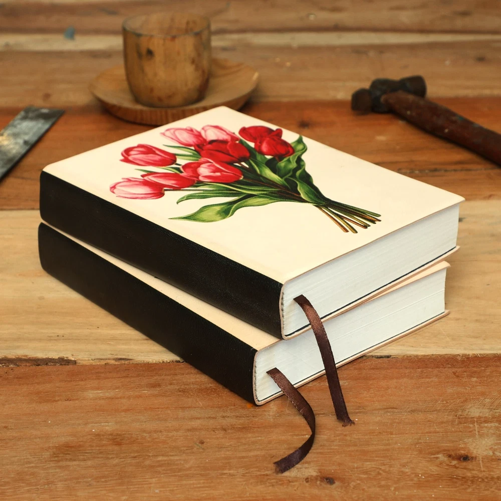 Features to Fall in Love With:😊 Exquisite Genuine Leather Cover: Adorned with a red tulip bouquet design, the soft leather cover offers a luxurious texture and a refined aesthetic. Classic Hand-Binding: Constructed with expert craftsmanship, ensuring durability and sophistication. Premium Writing Experience: Includes 190 sheets (380 ivory lined pages) of eco-friendly FSC-certified recycled paper, ideal for journaling, sketching, or note-taking. Thoughtful Design Elements: A coordinating ribbon bookmark helps you keep track of your ideas and inspirations. Designed to Fit Your Lifestyle Measuring 6” x 8”, this journal is the perfect size for daily use, whether you're writing at home, traveling, or working in your favorite coffee shop. A Gift That Speaks from the Heart❤ Perfect for occasions like birthdays, anniversaries, or holidays, this journal is an exceptional gift for writers, artists, travelers, or anyone who cherishes meaningful keepsakes. Each journal reflects expert artistry and attention to detail, making it a one-of-a-kind treasure for capturing life's most precious moments. Please Note: This listing is for one journal only. The Primary image shows two journals to provide a better view of the design from different angles. The second journal is for illustrative purposes and is not included in the sale.