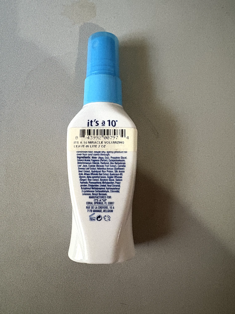 Active Ingredients: Hyaluronic Acid Period After Opening (PAO): 12M Volume: 2 fl oz UPC: Does not apply Model: It 's A 10 Miracle Leave In LITE MPN: 48269E717177 Features: All Natural Ingredients, Cruelty-Free/No Animal Testing, Contains Vitamins Formulation: Spray Type: Conditioner Gender: Unisex Styling Effect: Color Protection, Detangling, Volumizing, Shine, Deep Conditioning, Nourishing, Hair Repair, Split Ends, Heat Protection, Anti-Frizz Ingredients: Acai, Baobab Extract, Aloe Vera, Panthenol, Green Tea Extract, Chamomile Extract, Hydrolyzed Silk, Hydrolyzed Rice Protein Size: Travel Size Hair Type: All Hair Types Product Line: It's A 10 Brand: It's a 10 Age Group: Adult gtin13: Does not apply