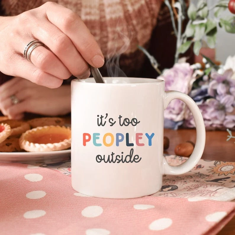 It's too peopley mug, funny gift, funny mug, gift for her, birthday gift Ceramic Mug 11oz White ceramic 11 oz (0.33 l) Rounded corners C-Handle Warm your soul with a nice cuppa out of this perfectly sized ceramic mug. Customize with cool designs, photos or logos to make that "aaahhh!" moment even better. It’s microwave safe and dishwasher safe and made of white, durable ceramic in an 11-ounce size. It's high-quality sublimation printing makes it the perfect gift for your true coffee, tea or hot chocolate lover. Key features Microwave-safe: Mug can be safely placed in microwave for food or liquid heating Vibrant colors: The latest printing techniques provide bright and crisp colors matching your craziest designs