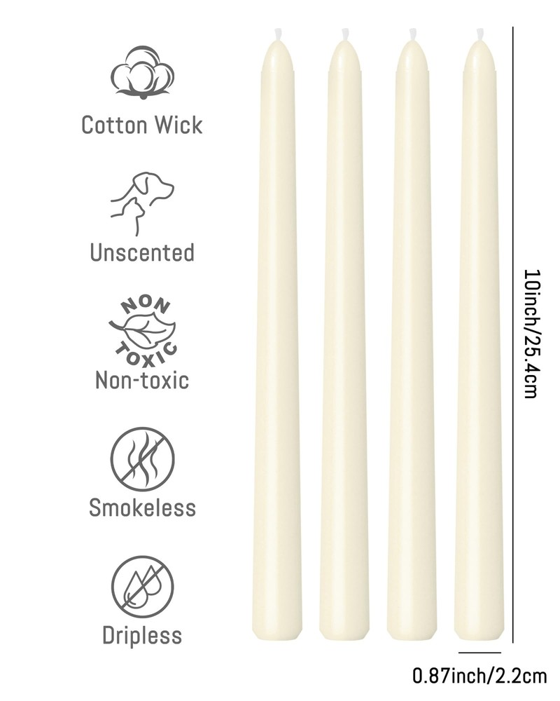 Ivory Taper Candles, 10 Inch Set of 4, Unscented, Dripless, Smokeless, 8 Hours Long Burning, Hand Poured Tall Tapered Candlesticks Wedding Advent Home Decor Dinner Timeless tapered design: these ivory taper candles feature the timeless and elegant design of candlesticks, with a slender and tall shape. Hand-poured taper candle that adds sophistication to any setting. Smokeless, dripless an unscented: crafted with a blend of soy wax, beeswax, and a small paraffin, these candles offer a clean and smoke-free burn. Say goodbye to messy wax drips, as these candles are designed for a smooth and hassle-free experience. Extended burning time: each of these tapered candles offers an impressive 6-8h burning time, ensuring that your candles will provide a warm and inviting glow throughout your event or evening. Their long-lasting performance makes them ideal for extended gatherings and celebrations. These tapered candles are unscented, making them perfect for individuals who prefer a fragrance-free atmosphere. set of 4: this ivory candle set includes a quantity of 4 pieces, offering you ample options for creating beautiful and enchanting decorative arrangements. Whether you want to illuminate a romantic dinner or adorn your event venue, these long taper candles provide versatility. Ideal for home decor and weddings: with their classic ivory, these taper candles are perfect for enhancing the ambiance of your home decor. Additionally, they make an excellent choice for weddings, adding a touch of sophistication and romance to your special day. Whether you place them in candle holders, candelabras, or use them as part of your table centerpiece, these taper candles are a versatile and stylish addition to your decor. Introducing our exquisite taper candle, a perfect blend of elegance and functionality. With a burning time of 6-8 hours, this candle promises to illuminate your special moments with warmth and charm. Whether it's a wedding ceremony, a festive celebration, or a cozy dinner with loved ones, this candle is the ideal choice to set the mood and create a magical atmosphere. Place it on your dining table to add a touch of sophistication to your meals, or use it as a centerpiece to enhance the ambiance of your decorations. Experience the beauty and versatility of our candle, designed to elevate every moment and make memories that last a lifetime. Whether you're planning a romantic evening or hosting a festive party, let this candle be the centerpiece of your cherished moments. Various coccasions: Religious ceremonies, weddings, memorials, holidays, home decor, candlelight vigils Ingredient: soy wax, beeswax and a small amount of paraffin wax Safety Tips Prior to lighting, ensure that all packaging has been removed. Trim the wick to a length of 1/8" to 1/4" and ensure it is centered. Always use appropriate candle holders and place them on a heat-resistant surface. Exercise caution and never leave a burning candle unattended. Keep lit candles away from drafts, flammable materials such as curtains, and out of reach of children and pets. We recommend limiting the burning time to a maximum of 2 hours per session. Shipping We offer FREE shipping on all orders! We ship within Three business days of payment, usually sooner. We use a selection of shipping services such as UPS, FedEx, USPS etc. We only ship to the lower 48 states, no APO/FPO addresses or PO Boxes allowed. Local pickups and combined shipping options are not provided at this time. International buyers – please note: Import duties, taxes, and charges aren't included in the item price or postage cost. These charges are the buyer's responsibility. Please check with your country's customs office to determine what these additional costs will be prior to bidding or buying. Order Cancellation Policy * Order Cancellation Policy ** You can return a product for up to 30 days from the date you purchased it. 1. The seller reserves the right to cancel the special case only due to eBay cancellation fee. 2. The decision of seller is the final. 3. The seller will respond to the cancellation request within 2 business days. Please wait for the result of cancellation. 4. In case the cancellation is not completed by some reasons, the buyer can follow the options below to get the refund. 4.1 The buyer can reject the item when it arrives. 4.2 The buyer can send the item back to the seller within 30 days If the buyer receives item (USA Shipment ONLY). The seller will provide the FREE return label to the buyer when the buyer opens " Return Item" case on eBay by using the reason as "Change my mind" ONLY. 5. When buyer has placed the order. The order will be processed and completed by automatic warehouse system within 5 minutes. In case that buyer sends the cancellation request after 5 minutes of placing the order, the request will be rejected. **Sending direct message to cancel the order is not allowed for every case.* Return Policy - If buyer would like to return the items for refund or replacement, please CONTACT SELLER to receive the free return label from seller. The refund or replacement will be processed with the tracking number of return label which is provided by seller only. The other ways of return which are not approved by seller will not be processed for the refund or replacement. Return You can return a product for up to 30 days from the date you purchased it. Any product you return must be in the same condition you received it and in the original packaging. Please keep the receipt. Payment We accept payment by any of the following methods: eBay Payments Please pay as soon as possible after winning an auction, as that will allow us to post your item to you sooner! Feedback Customer satisfaction is very important to us. If you have any problem with your order, please contact us and we will do our best to make you satisfied. Contact Us If you have any queries, please contact us via ebay. We usually respond within 24 hours on weekdays. Please visit our eBay 
