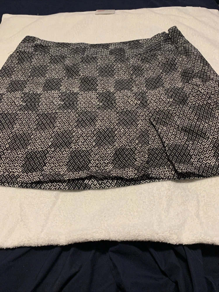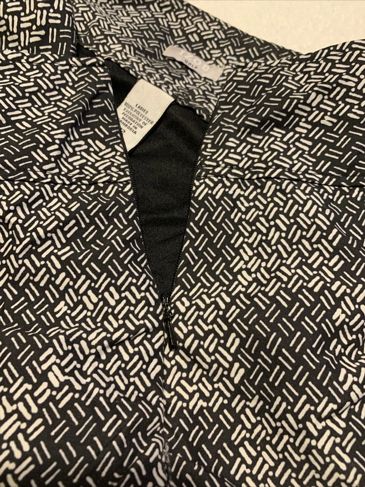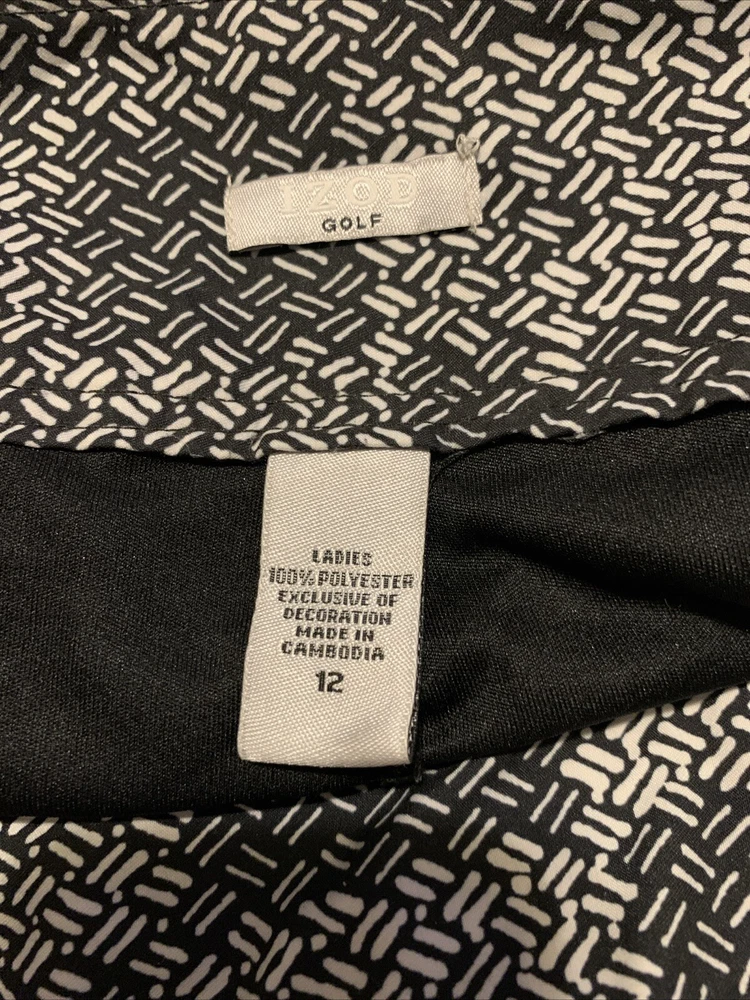 This Izod Golf Skirt Skort in size 12 is the perfect addition to any golfer's wardrobe. The black and white geometric pattern adds a stylish touch to this athletic piece, while the zip closure ensures a secure fit. Made of 100% polyester, this skirt skort is suitable for both casual and activewear occasions, and is perfect for women who enjoy golfing. The skirt skort is designed with a performance-enhancing style, making it a great choice for those who want to look and feel their best on the golf course. This item is made in Cambodia and is categorized under Sporting Goods, Golf, Golf Clothing, Shoes & Accessories, Women's Golf Clothing & Shoes, and Skirts & Skorts.