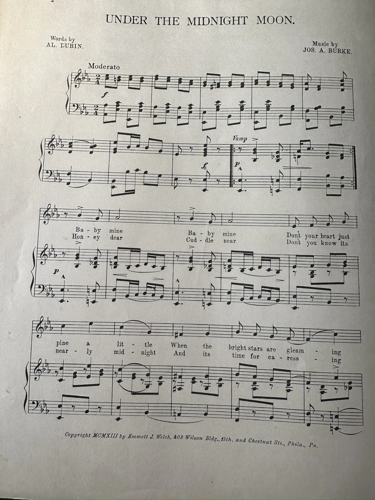 This vintage 11x14 sheet music from 1913 is a must-have for any ragtime enthusiast. Titled "Under the Midnight Moon" by Joseph Burke, this piece is a classic in the musical genre. The sheet music is in excellent shape and is perfect for those who appreciate vintage and antique musical memorabilia. The format of the sheet music is a standard size for easy viewing and playing. It falls under the categories of musical instruments and gear, as well as sheet music and song books. This item is a rare find and a great addition to any collection for those who love ragtime and vintage music.