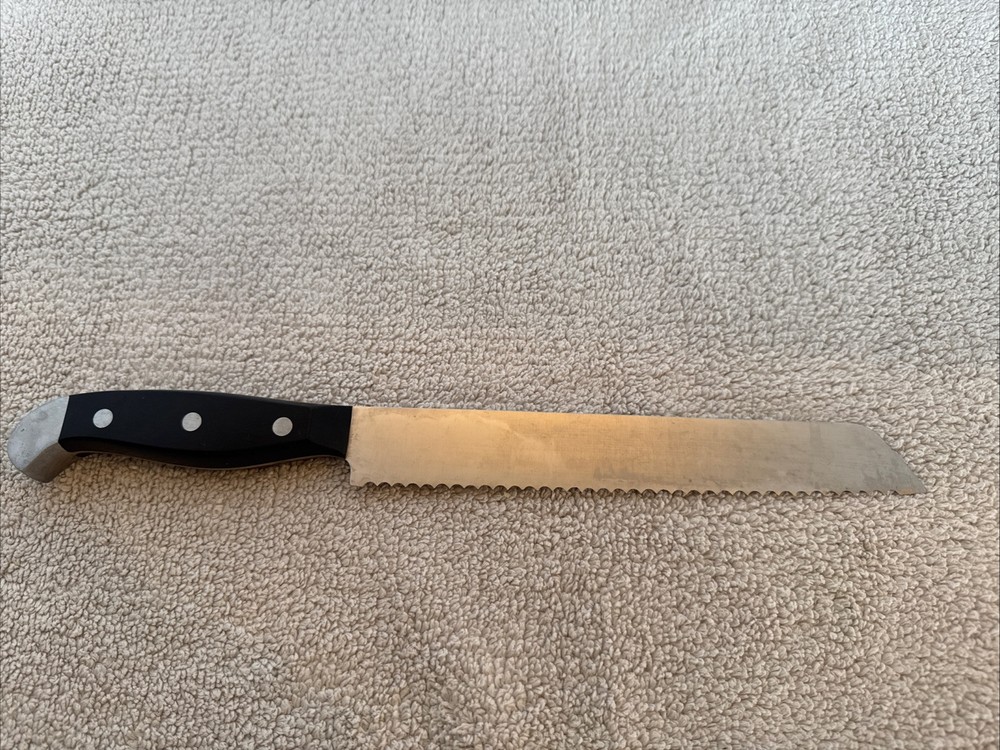 This knife is sharp, gently used, excellent condition. No signs of abuse, misuse, chips, cracked etc. This J A Henckels bread knife is a top-quality stainless steel serrated knife. It is the perfect addition to any kitchen and is great for cutting through bread and other baked goods with ease. The knife is part of the J A Henckels brand, which is known for producing high-quality kitchen products. The knife is an excellent choice for anyone looking for a reliable and durable serrated knife that is made in Germany. Its sharp serrated edge makes it easy to cut through even the toughest of bread and other baked goods. This knife is a must-have for any kitchen and is sure to become a favorite.