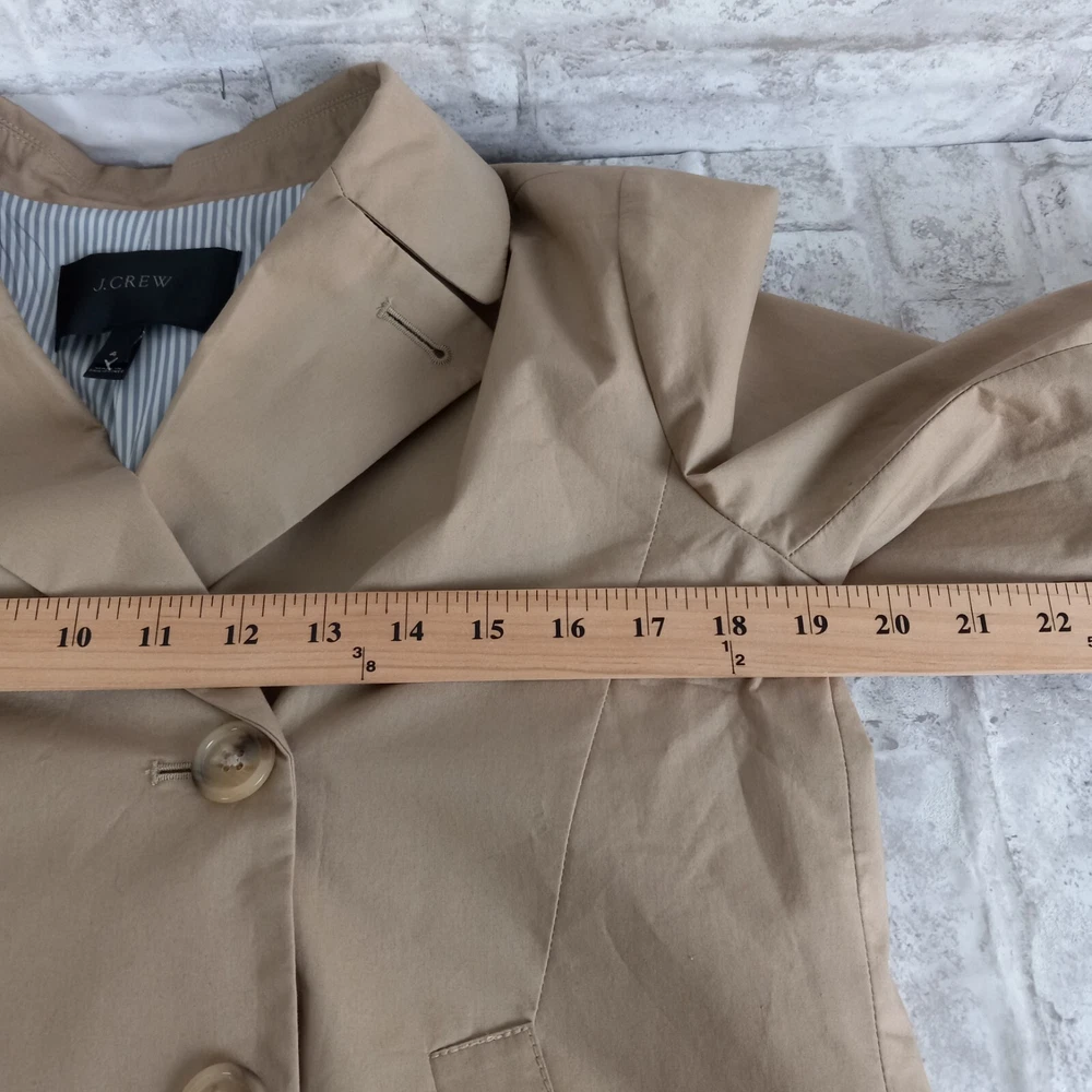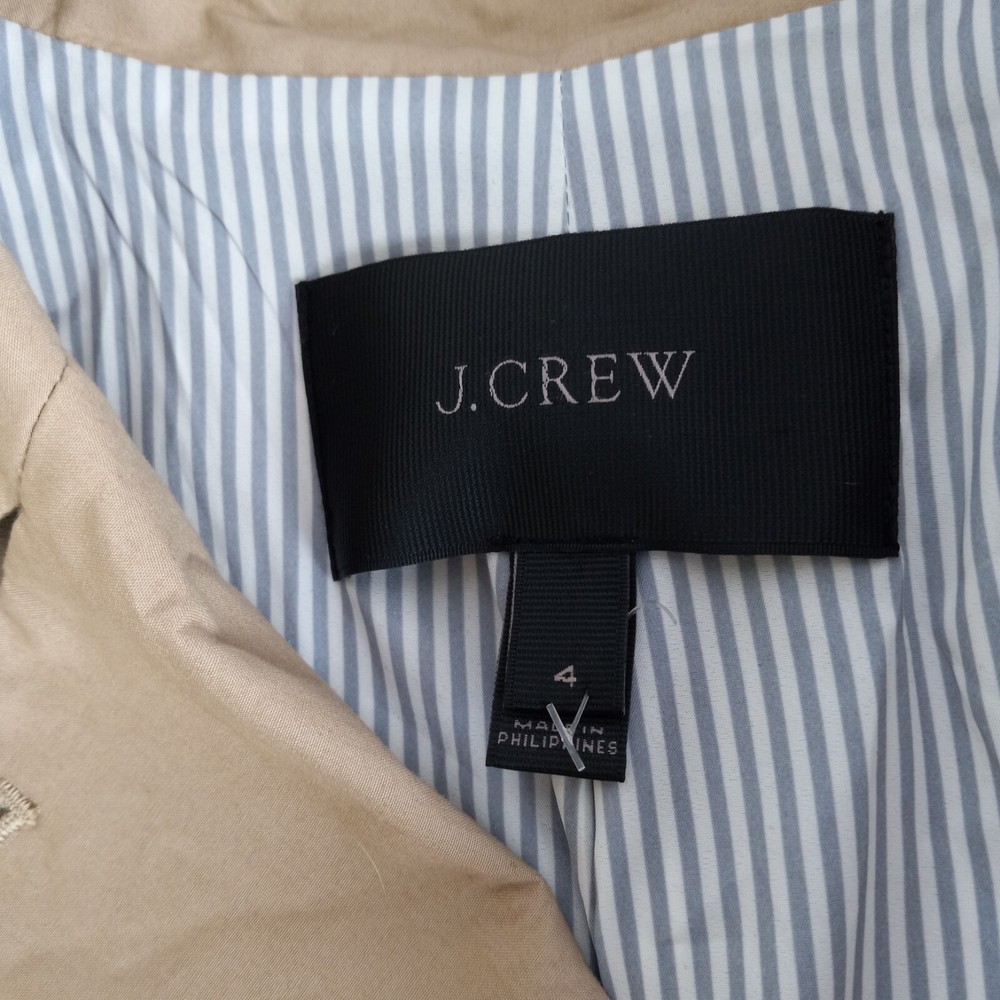 Seller Notes: “Great preowned condition, no flaws seen. See pics for details and measurements.” Jacket/Coat Length: Short Type: Blazer Occasion: Business, Casual, Travel, Workwear Number of Pieces: 1 Piece Season: Fall, Spring, Winter Fit: Regular Garment Care: Machine Washable Size: 4 Size Type: Regular Features: Lined, Stretch, pockets Style: blazer Country of Origin: China Theme: City, Classic, Preppy, academia Color: tan Set Includes: Jacket Jacket Cut: Double-Breasted Sleeve Length: Long Sleeve Material: Cotton Jacket Front Button Style: Three-Button Pattern: Solid Brand: J.CREW Lining Material: 100% Polyester Department: Women