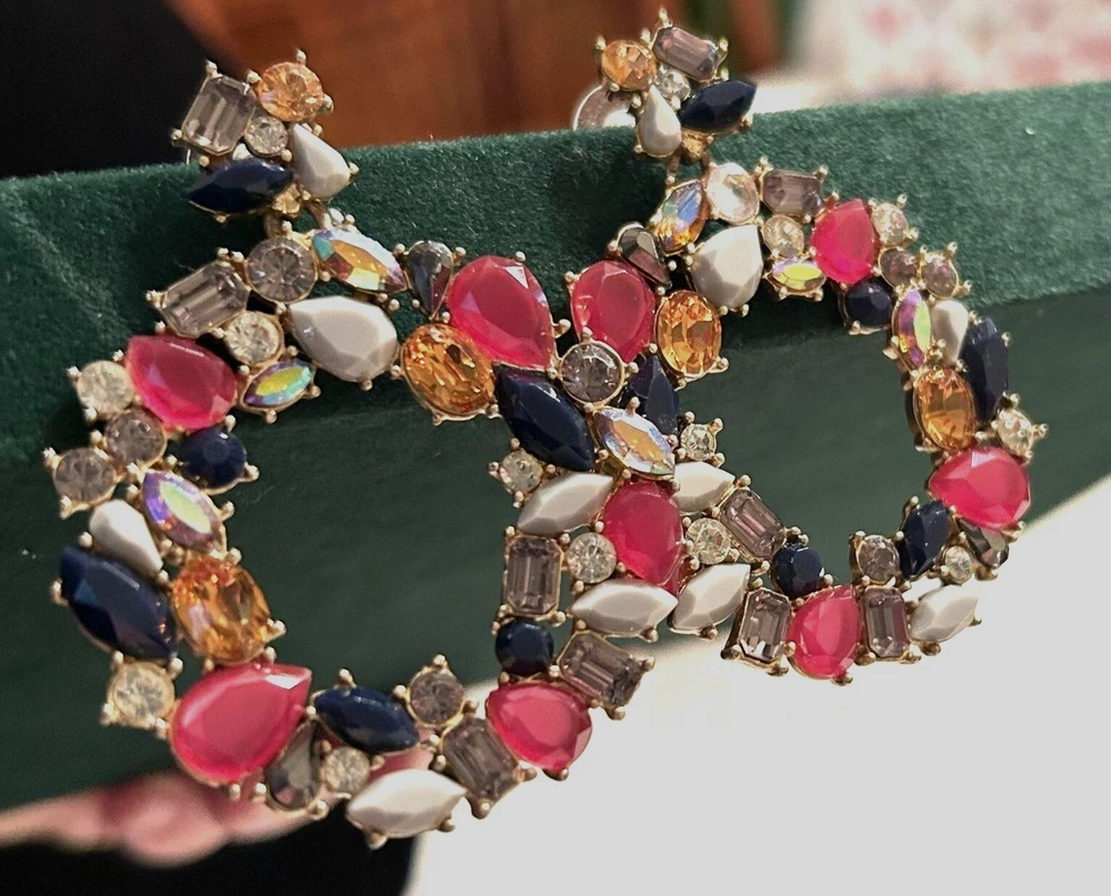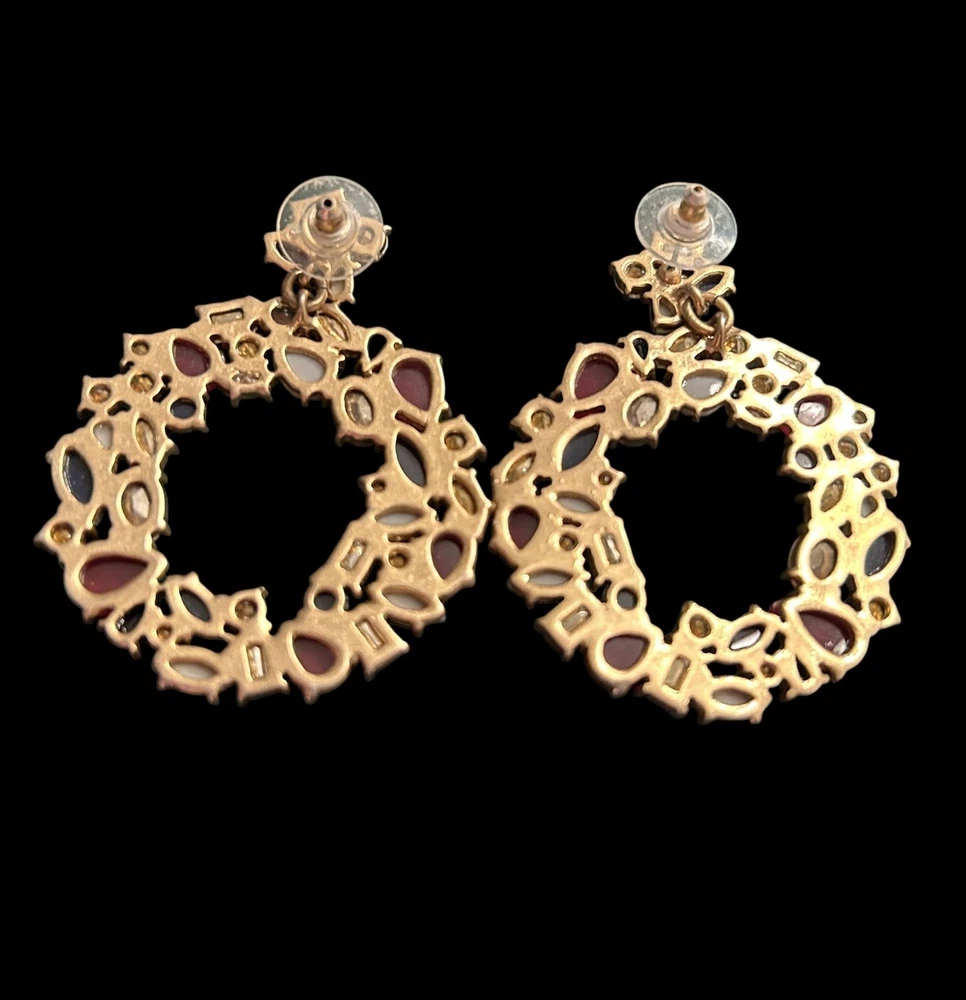 In a whimsical dance of colors, these J. Crew earrings capture the essence of a blooming garden or holiday wreath. Rhinestones and Lucite shapes form a wreath-like hoop, radiating charm and sophistication. The vibrant hues add a playful twist to any ensemble, making them a delightful treasure in any jewelry collection. • Dangle style earrings • Butterfly back closures • Multi-colored rhinestones and Lucite accents • Gold-tone base • Lightweight for comfortable wear Lovely Gold-tone backs and posts. One replaced rhinestone. Top to bottom = 2,5 inches, width = 2 inches.