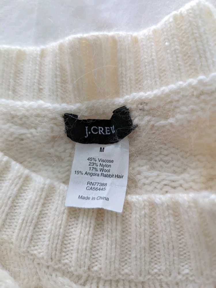 Character: Cable Theme: Preppy, Classic, Outdoor, fisherman Knit Style: Cable-Knit Fabric Type: Knit gtin13: Does not apply UPC: Does not apply Type: Sweater Style: Pullover Size Type: Regular Occasion: Casual Pattern: Solid Department: Women Season: Fall, Winter Neckline: Crew Neck Fit: Regular Features: Breathable, Preshrunk MPN: 54466 Size: M Sleeve Length: Long Sleeve Material: Wool, Angora, Viscose Color: Ivory Brand: J.CREW
