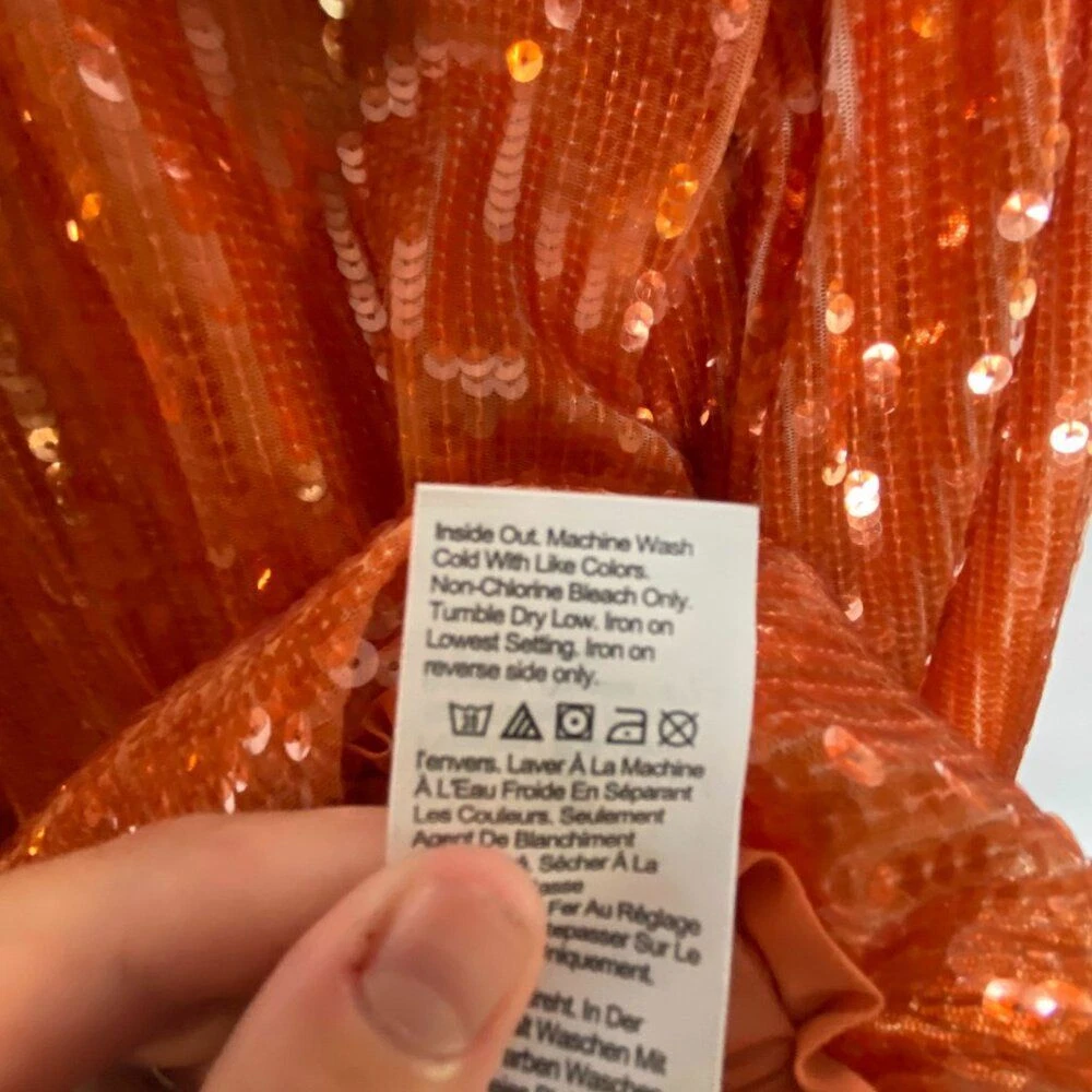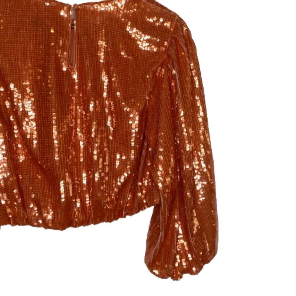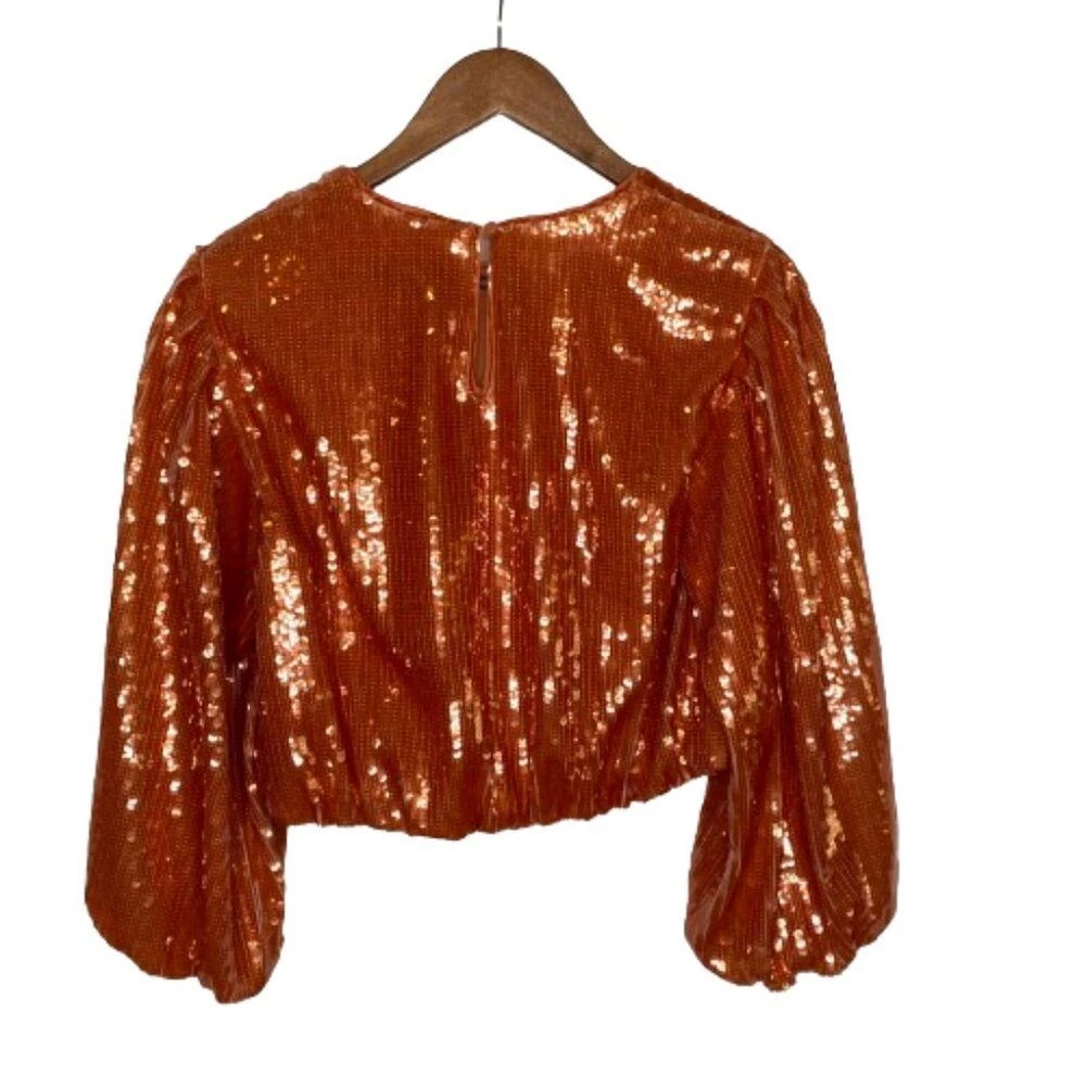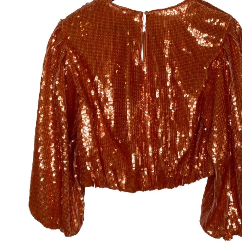 New With Tags Did notice a few sequins that are broken in half, but does not really affect the look of the top Pullover style with back keyhole button closure Bubble long sleeves with elastic cuffs Round neckline Blouson cropped elastic hem Fully lined 100% polyester Machine washable Approximate flat lay measurements: Shoulder to bottom hem length - 18" Pit to pit width - 19" Please compare measurements to something you already own to verify size and fit We are happy to answer any questions! We ship the next business day!