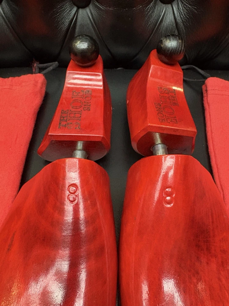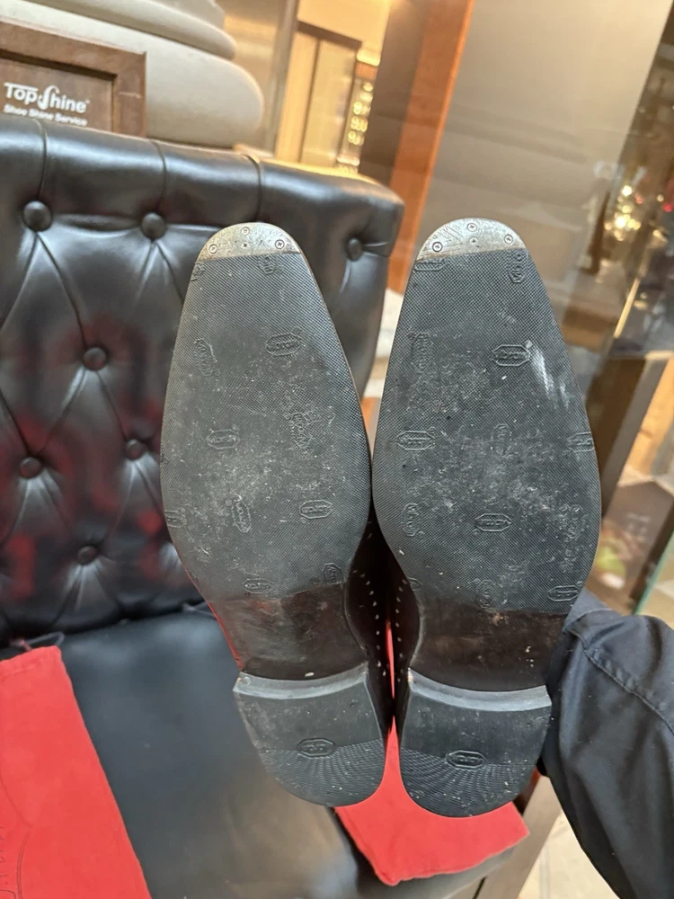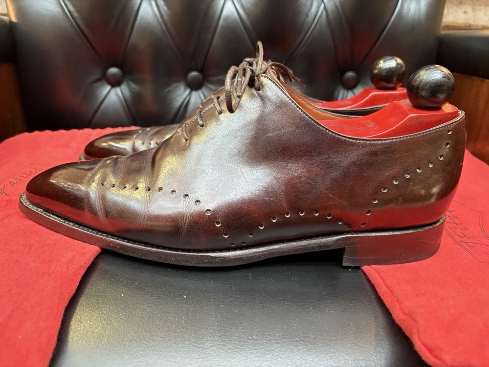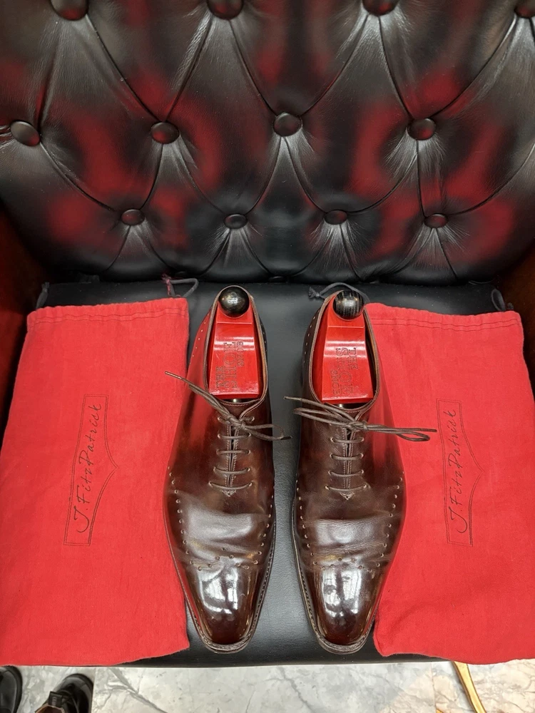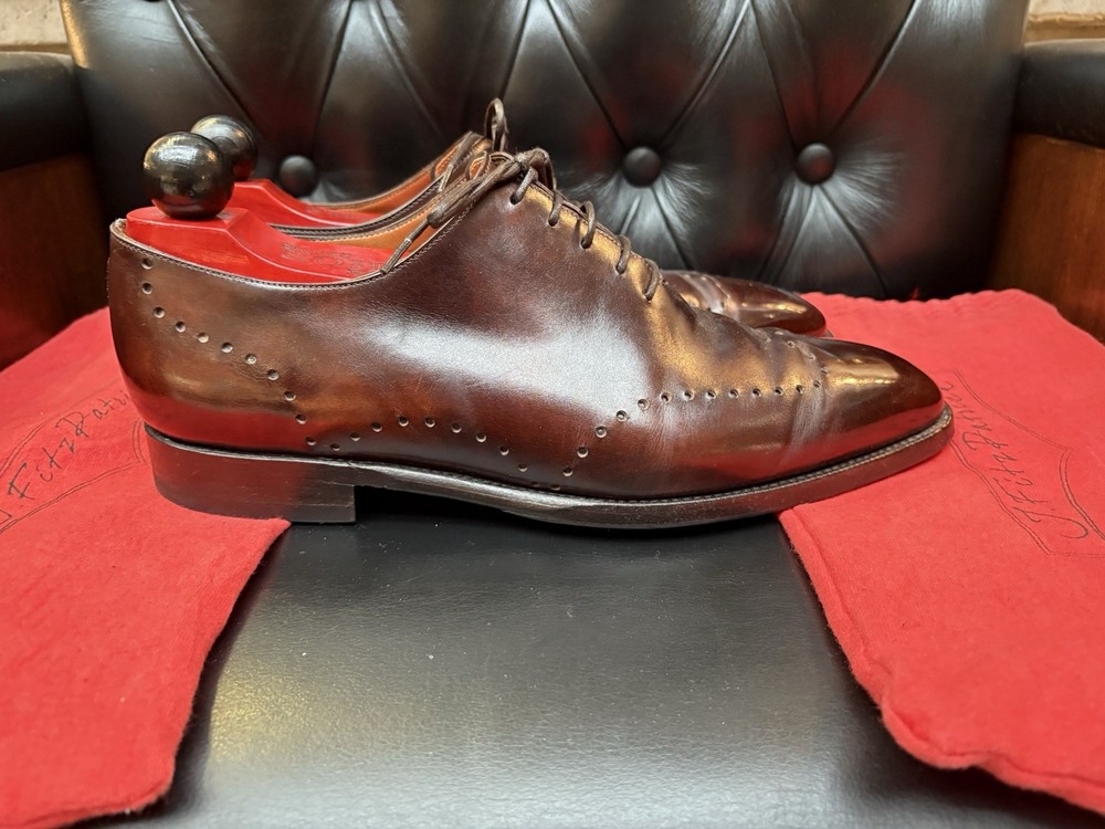 J Fitzpatrick Mens dark brown wholecut Oxford shoes in UK size 8.5, EU size 42.5, US size 9.5. E width fitting. These shoes have had a vibram rubber sole and steel toe plates added to the soles. They come with red 'shoe snob' shoe trees UK size 8 and red J Fitzpatrick dust bags.