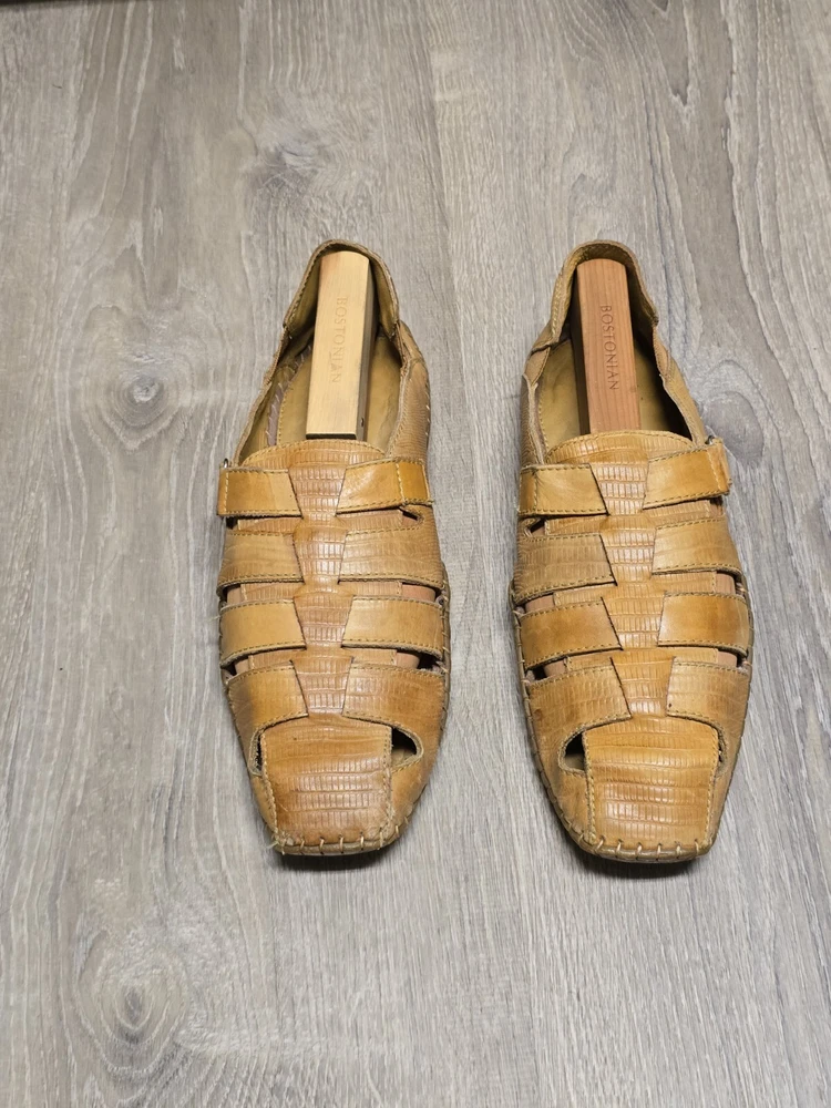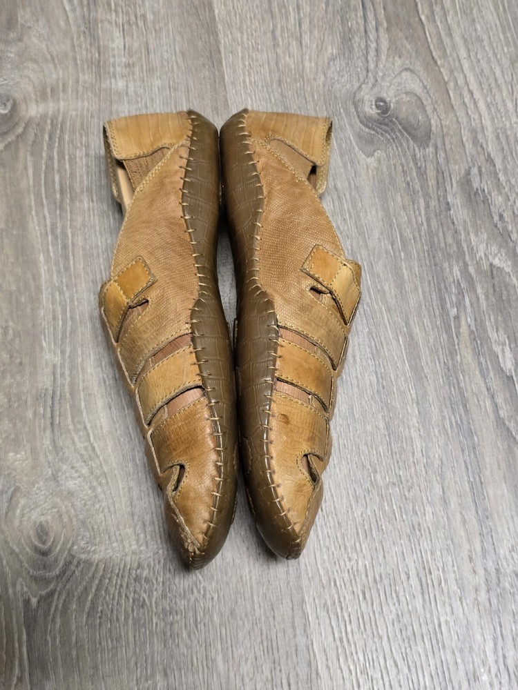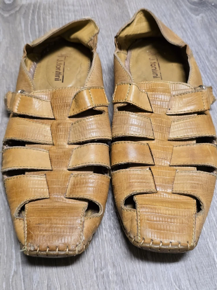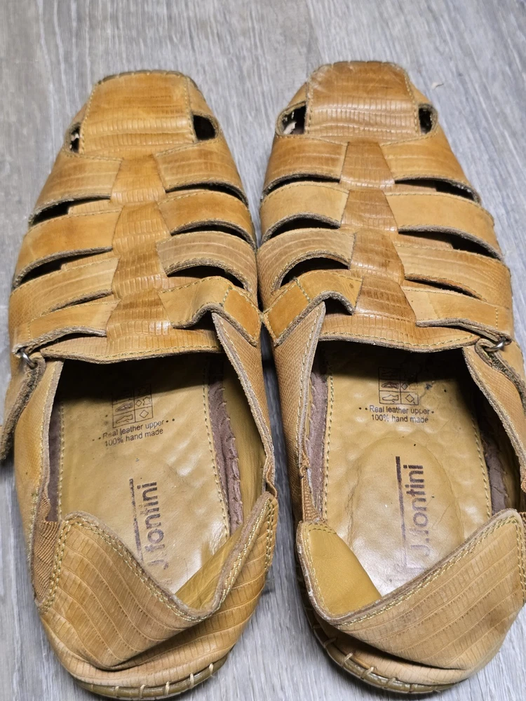 Elevate your style with these J. Fontini Men's Handmade Brown Leather Fisherman Closed Toe Sandals. Crafted with solid pattern and made of high-quality leather, these sandals are perfect for any occasion. The closed-toe design ensures durability and comfort, while the handmade touch adds a unique touch to your outfit. These sandals come in size 9.5 for US shoe size and 43 for EU shoe size. The brown color complements any outfit and the fisherman style adds a touch of sophistication. Perfect for men who want to add a touch of elegance to their wardrobe.