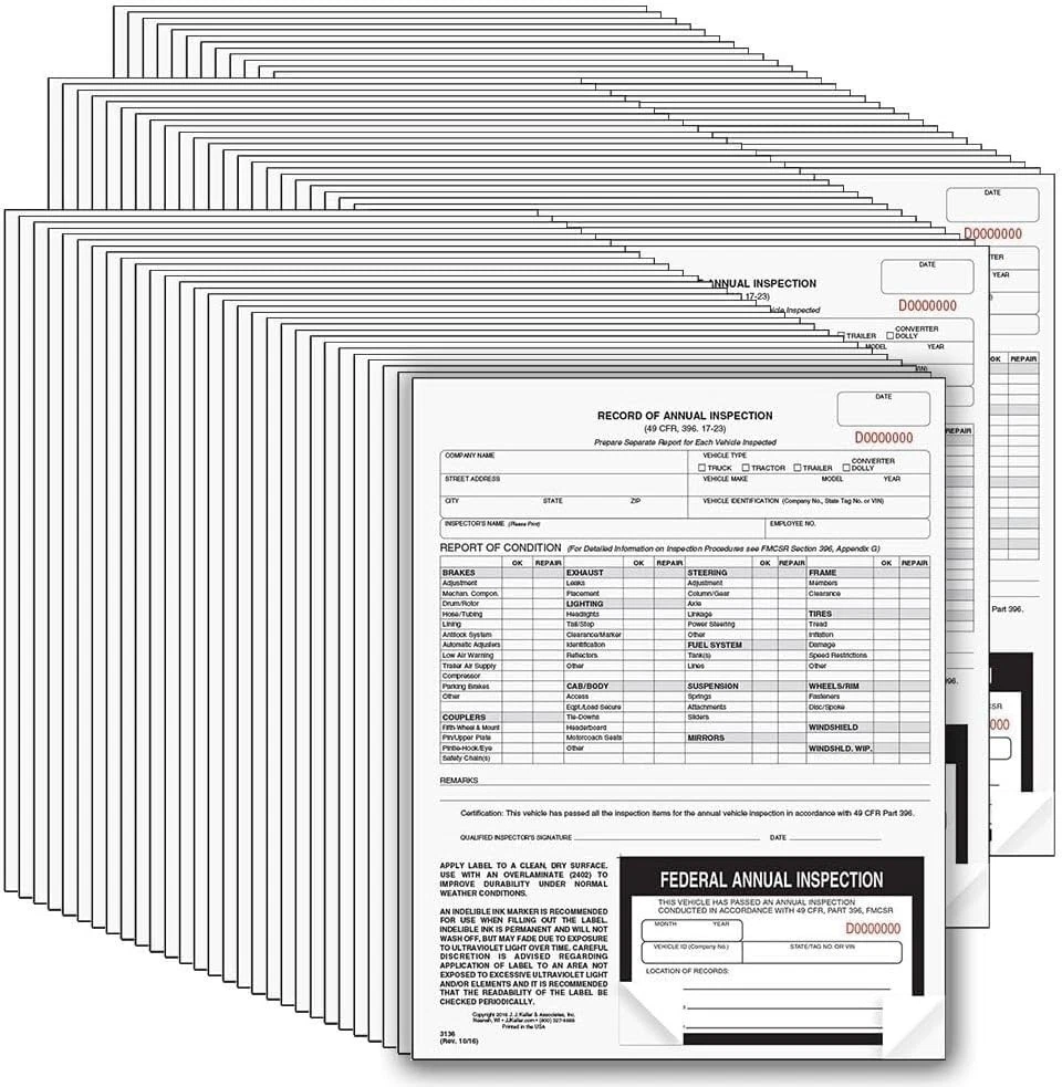 FOR YOU J. J. Keller 100-Pack, Record of Annual Inspection Form with Inspection Decal, 2-Ply Carbonless Form, DOT Compliant FEATURES Avoid fines while keeping you, your workers, vehicles, and highways safe and compliant! Reduce the stress of unwanted fines and penalties with these DOT annual inspection forms and decals. High-Quality, two-plies DOT inspection forms are carbonless in a continuous format. Durable forms reduce risk of fading over time. Forms and decals with consecutively numbered. Measures: 9 1/2” x 11”. Fade Resistant Inspection Decals are included. Annual inspection form and decal are consecutively numbered. No loss of important data with markings that are permanent and do not fade in sunlight or wash off. Comply with DOT Regulations. AVIR forms meet DOT annual vehicle inspection requirements under 49 CFR Section 396.21. Annual vehicle inspection labels meet requirements under 49 CFR 396.17(c)(2). Provides full reporting on the 13 required inspection categories. 100-Pack. Includes (100) Record Annual Inspection Forms with black and white Inspection Decals. Made in the USA. Product description Buy Forms with Confidence from J. J. Keller An Industry Leader Since 1953 Keep your operation running smoothly – and ensure you’re in compliance with regulations and requirements – when you use J. J. Keller’s wide range of affordable safety and compliance forms. A Family-Run Business Our founder, Jack Keller, started J. J. Keller & Associates, Inc. in Neenah, Wisconsin, as a consulting firm to help trucking companies comply with complex regulations. That was 70 years ago. Today, President & CEO Rustin Keller is the third generation of the Keller family to lead the business, which has grown to support companies of all types and sizes. Trust Our Wide Range of Experts J. J. Keller’s team of regulatory experts continually monitors the requirements of 300+ North American agencies to ensure your forms meet all requirements. Business leaders in transportation, manufacturing and industrial, healthcare, utilities, construction, education rely on J. J. Keller. An Extensive Selection of Compliance Forms Annual Vehicle Inspection Drivers Inspection Log Books Driver qualification HR Forms Forklift & Equipment Checklists Easily Complete Annual Vehicle Inspections For 13 Required Categories These 2-ply carbonless forms help meet applicable DOT requirements in §396.17–§396.21, providing full reporting on the 13 required inspection categories. Easily adhere the label to the inspected vehicle for proof of annual inspection. Satisfy DOT’s annual vehicle inspection requirements Includes plenty of room for recording identification data and component conditions Includes Minimum Periodic Inspection Standards Durable 100 lb. manila ply Measures 8½” W x 11” L Item model number 3136 Number of Items 100 Color Black, White Is Discontinued By Manufacturer No Brand J. J. Keller & Associates, Inc. Material Paper, Plastic Material Type Paper, Plastic Manufacturer Part Number 3136 Item Weight 0.01 ounces Shape Rectangular Manufacturer J. J. Keller & Associates, Inc. Finish Type Painted Package Dimensions 14.02 x 10.63 x 0.63 inches Size 100-pack 10.63 inches x 14.02 inches x 0.63 inches. Weight: 0.01 oz PAYMENT We accept all payments via Ebay using Credit Cards , PAYPAL , Apple Pay and many others SHIPPING We are always working hard to ensure your package arrives as soon as possible. Please understand that some factors like weather, high postal traffic, and the performance of shipping companies are outside of our control. DELIVERY & RETURN POLICY We offer a 30-Day Return Policy on items in which you are not completely satisfied with. You have the option of a full-refund or an exchange of the item. No returns are available on items shipped outside of the USA. WELOCME TO BUY EZ Checks High Security Check Paper with Hologram & 20 Security Features | 500 S 128.89 USD 138.59 USD Free shipping 7% off Zzrywuty Money and Rent Receipt Book with Cardboard Insert,2-Part Carbonless,5.3 10.87 USD 11.44 USD Free shipping 5% off Money and Rent Receipt Book 2-Part Carbonless 7-5/8" X 11" Spiral Bound 200 Sets 11.89 USD 12.52 USD Free shipping 5% off 500 CMS 1500 Claim Forms, Current HCFA 02/2012 New Version Valid for HCFA 1500 C 36.57 USD 38.49 USD Free shipping 5% off Professional Money and Rent Receipt Book Two Part Carbonless Copy Spiral Bound(3 28.0 USD 29.47 USD Free shipping 5% off 12 Check Registers for Personal Checkbook - Checkbook Ledger Transaction Registe 10.86 USD 11.43 USD Free shipping 5% off 12 Pack Checkbook Register, Check Register Books for Personal and Work Use, Tran 8.07 USD 8.49 USD Free shipping 5% off 20 Pack Checkbook Register, Check Registers for Personal, Blank Ledger Transacti 9.49 USD 9.99 USD Free shipping 5% off Estate Planning Kit Includes Last Will and Estate Guide, POA, Living Will and Me 37.99 USD 39.99 USD Free shipping 5% off Nextdaylabels - CMS 1500 / HCFA 1500 Insurance Claim Forms - Laser/Ink-Jet Compa 37.57 USD 39.55 USD Free shipping 5% off