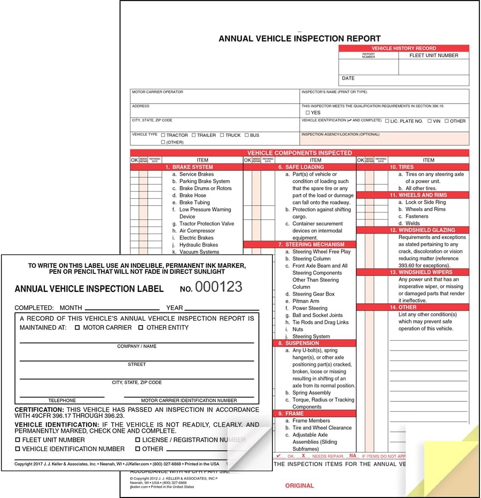 Store New Arrivals Add to Favorite View Feedback Contact J. J. Keller 25-Pack, Annual Vehicle Inspection Report Form & Adhesive Vinyl Label 2-Ply, 3-Ply Carbonless Form, Prenumbered, DOT Compliant Description Item model number 3128 + 1279 Item Weight 1.23 pounds Number of Items 25 Color Black Material Vinyl Material Type Vinyl Manufacturer Part Number 3128 + 1279 Ink Color Black Shape Rectangular Finish Type Laminated Package Dimensions 11 x 8.5 x 1 inches Size 25-pack Avoid fines while keeping you, your workers, vehicles, and highways safe and compliant! Reduce the stress of unwanted fines and penalties with these annual inspection forms and labels. High-Quality, long-lasting 100 lb. manila three plies inspection forms are carbonless in a snap-out format. Durable manila forms reduce risk of fading over time. Measures: 8 1/2” x 11 3/4”. Durable 2- Ply vinyl inspection labels with mylar laminate. Two ply lamination provides heat, tear, and puncture resistance. Labels are easy to apply, write on, and long-lasting. Measures 5" x 4". Labels come consecutively prenumbered. Comply with DOT Regulations. AVIR forms help you meet DOT annual vehicle inspection requirements under 49 CFR Section 396.21. Annual vehicle inspection labels meet requirements under 49 CFR 396.17(c)(2). Includes Minimum Periodic Inspection Standards (Part 396, Appendix G to Subchapter B) on back of forms. 25-Pack. Bundle includes (25) Annual Vehicle Inspection Reports and (25) Annual Vehicle Inspection Labels. Made in the USA. Product description Buy Forms with Confidence from J. J. Keller An Industry Leader Since 1953 Keep your operation running smoothly – and ensure you’re in compliance with regulations and requirements – when you use J. J. Keller’s wide range of affordable safety and compliance forms. A Family-Run Business Our founder, Jack Keller, started J. J. Keller & Associates, Inc. in Neenah, Wisconsin, as a consulting firm to help trucking companies comply with complex regulations. That was 70 years ago. Today, President & CEO Rustin Keller is the third generation of the Keller family to lead the business, which has grown to support companies of all types and sizes. Trust Our Wide Range of Experts J. J. Keller’s team of regulatory experts continually monitors the requirements of 300+ North American agencies to ensure your forms meet all requirements. Business leaders in transportation, manufacturing and industrial, healthcare, utilities, construction, education rely on J. J. Keller. An Extensive Selection of Compliance Forms Annual Vehicle Inspection Drivers Inspection Log Books Driver Qualification Human Resources Forklift & Equipment Checklists ABOUT US We offer the best prices around on high quality products. Our E-store includes media such as books, movies, music and games while offering electronics, toys, sporting apparel, clothing, tools, general home, garden items and more. SHIPPING We are always working hard to ensure your package arrives as soon as possible. Please understand that some factors like weather, high postal traffic, and the performance of shipping companies are outside of our control. We offer free shipping to the lower 48 states and ship within 2 business days of payment, usually sooner. We do not accept P.O. Boxes. Please provide a physical address. RETURNS We offer a 30-Day Return Policy on items which you are not completely satisfied with. You have the option for a full-refund or an exchange of the item. No returns are available on items shipped outside of the USA. PAYMENT We accept PayPal. CONTACT US This page content is yet to come Please ad us to your favorite seller and visit again later Thank You CUSTOMER SATISFACTION We try our very best to make sure every customer is completely satisfied. If there's a problem, message us! We're happy to help.