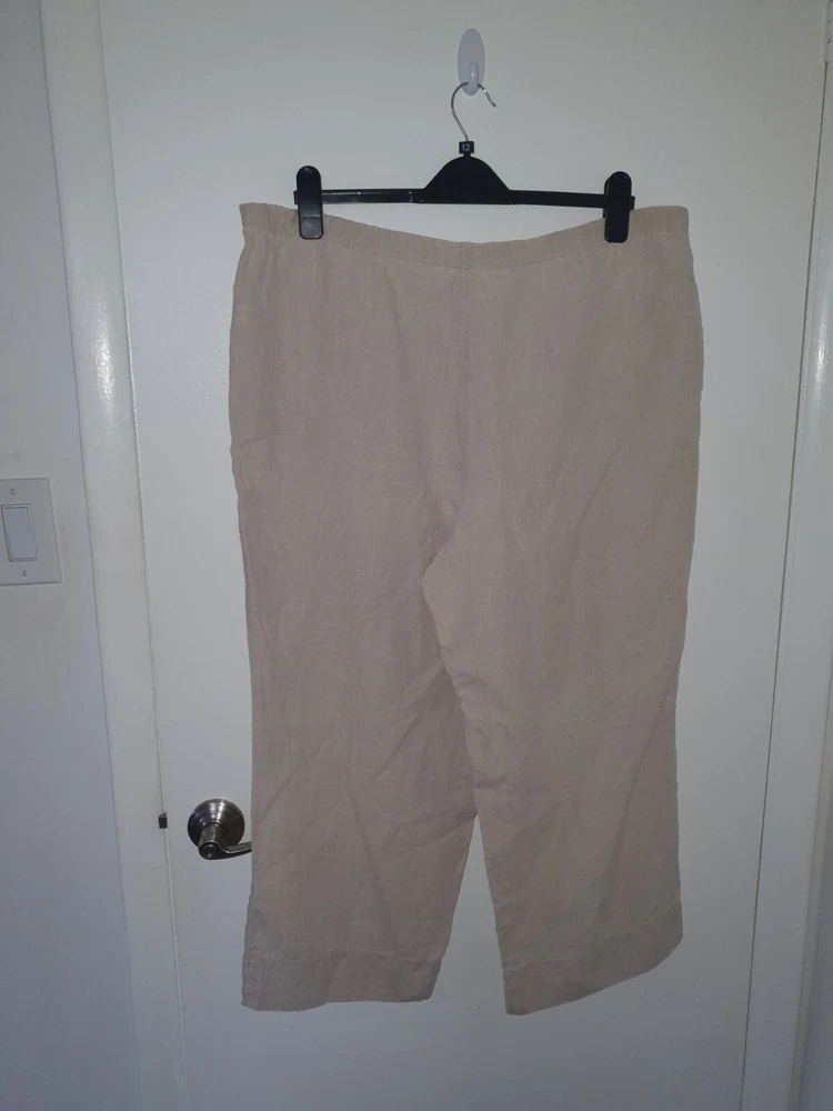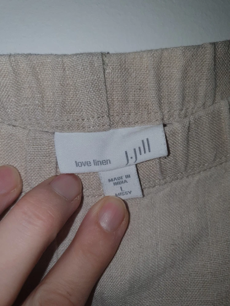 The J. Jill Pure Jill wide-leg pants are made of beige linen, featuring a solid pattern with a relaxed fit and elastic waist closure for comfort. These cropped pants in size L are designed for casual wear and travel, ideal for a nature-inspired, beachy, or hippie style. The canvas fabric adds a tropical vibe to the relaxed wide-leg design, making them a versatile and stylish addition to any woman's wardrobe.