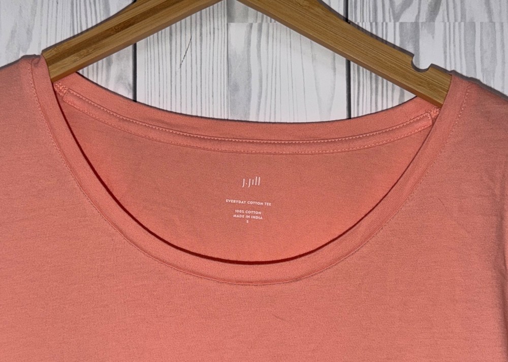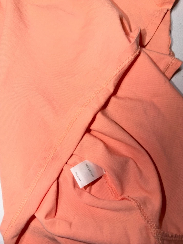 Arrived on time, in recycled packaging, which I appreciated since the reason I buy used on eBay instead of new on Amazon (which would cost less) is for ethical reasons. (The cheap way to buy ethical fashion is to buy used!) The material was listed as cotton and it is cotton. The one thing that was not accurate was the color. The picture showed a burgundy/fuscia dark pink, but the actual shirt was a bubblegum pink. So if color is important to you, confirm verbally w/this seller first.