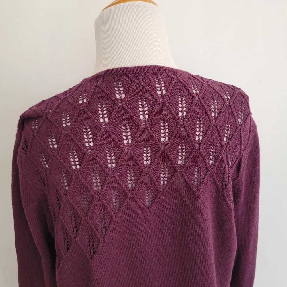 J. McLaughlin knit sweater dress Size XL extra large 54% cotton/44% modal Hand wash Pullover styling Round neck 3/4 sleeves Sangria purple Crochet detail Stretchy No pockets Unlined Approx. lay-flat measurements: Length: ~42.5" Pit to pit: ~20.5" Sleeves: ~19.5" Good pre-owned condition. There is some wash wear, esp. in underarm area, but no holes/stains