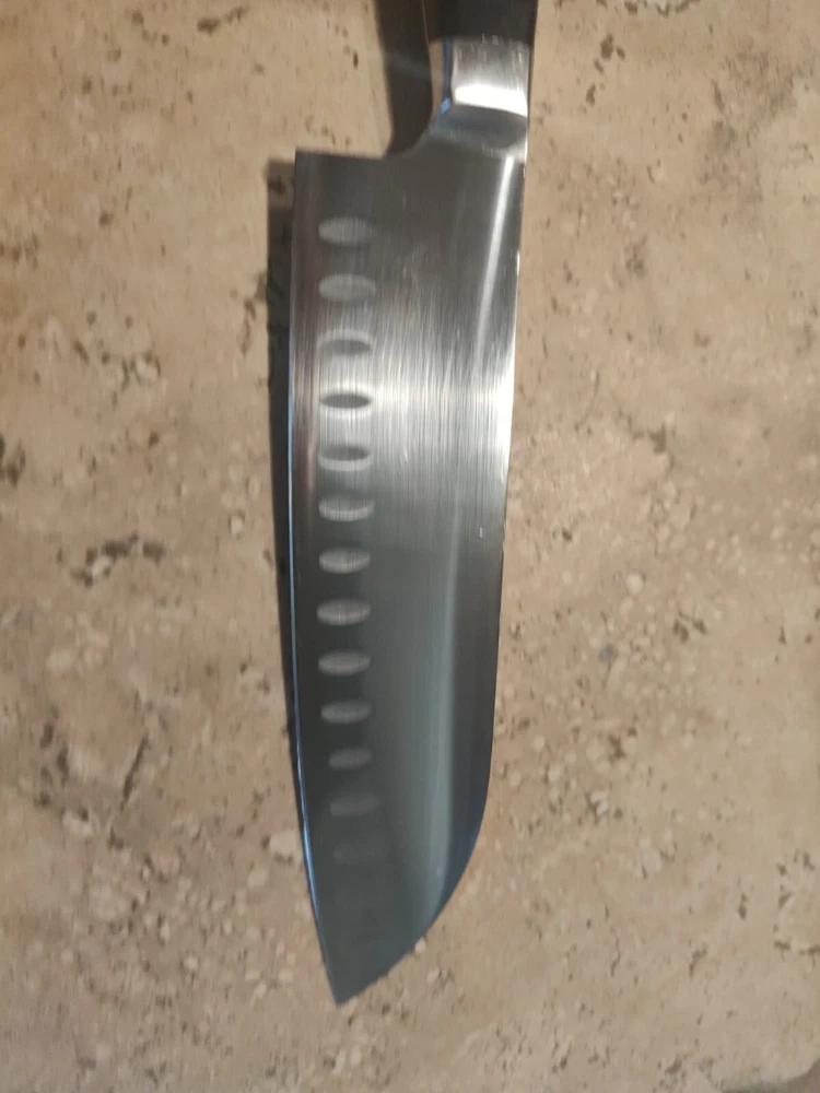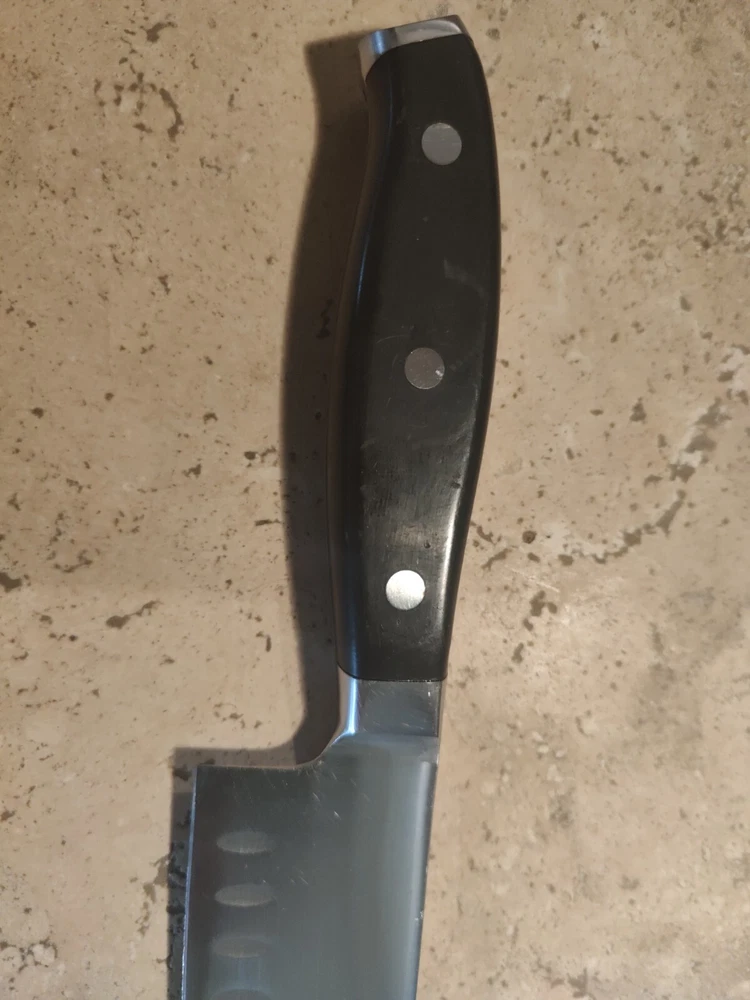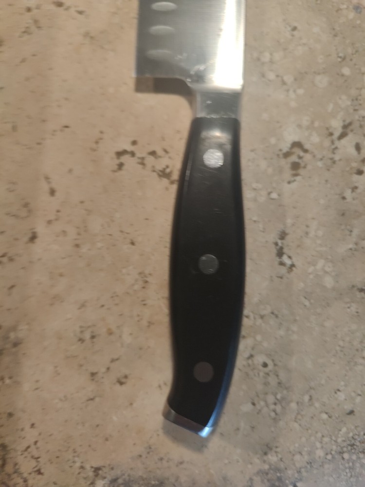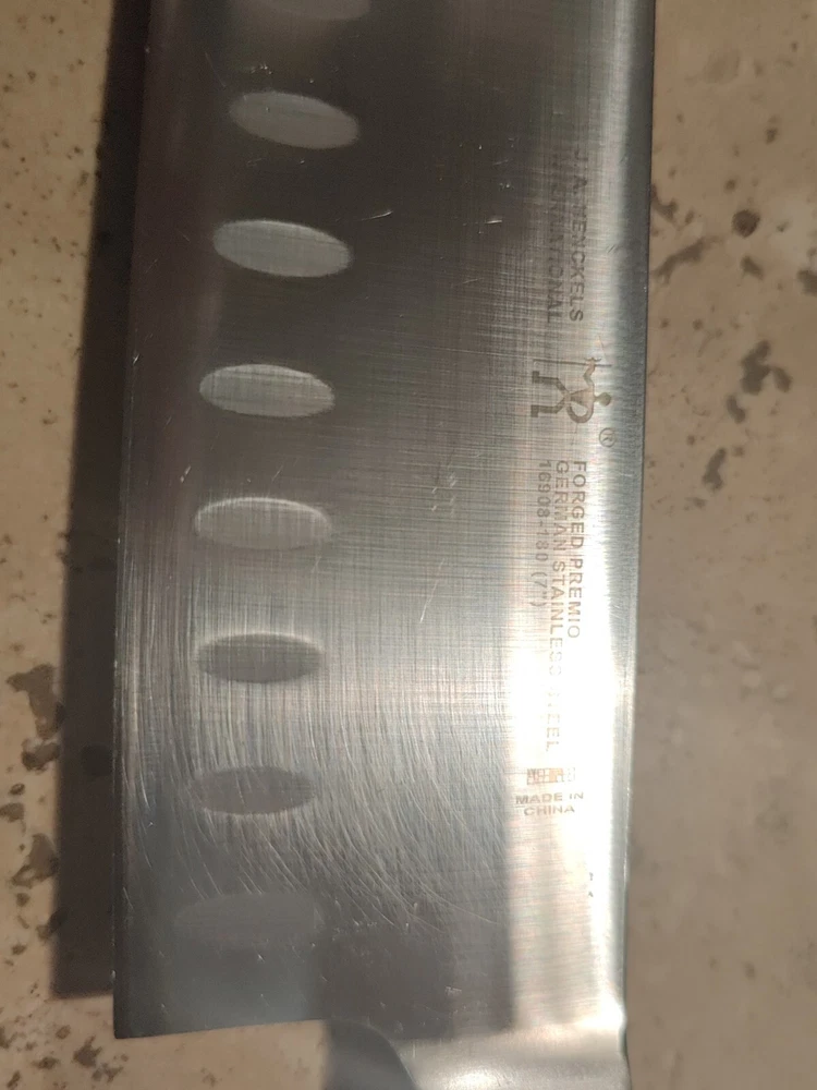 The J.A. Henckels International 7" Chef Knife 19008-180 is a high-quality chef's knife made by ZWILLING J.A. HENCKELS. This stainless steel knife has a 7-inch blade length, making it ideal for a variety of kitchen tasks. This is a preowned knife that does show typical signs of wear from use including scratches and buffs to both the blade and handle.
