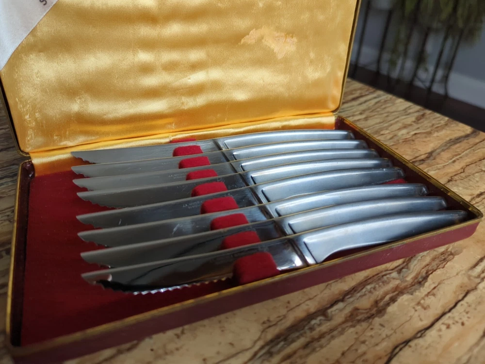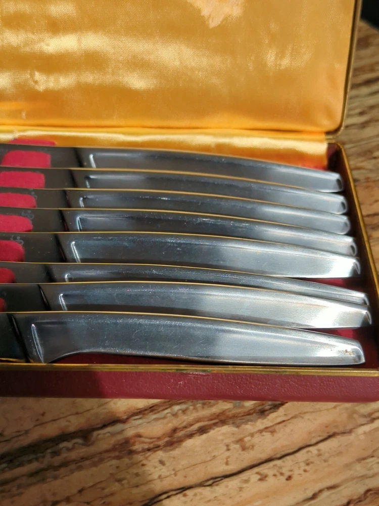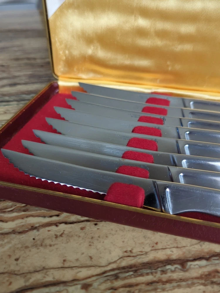Set of 8 Used J.A. Henckels Solingen 35199-100 No-Stain Serrated Steam Knives. Great condition for their age. Some scratching from normal use. Lots of life left in them! Includes 8 knives and the original storage case.