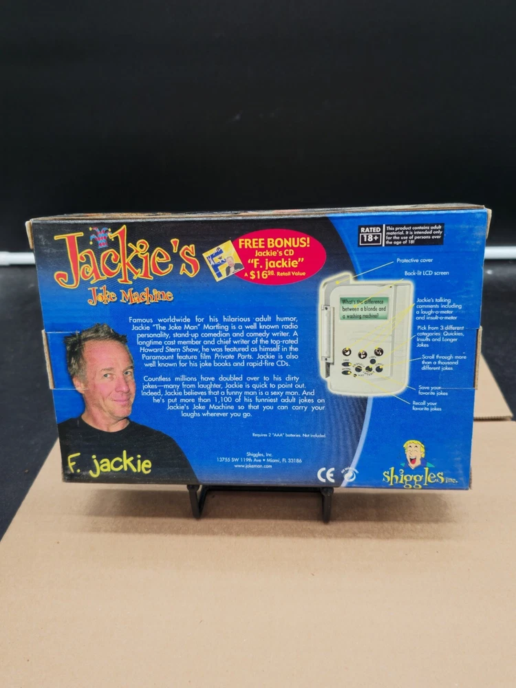 The product is a "Jackie's Joke Machine" by Jackie Martling, featuring dirty jokes. It is a toy that provides entertainment with a focus on jokes. The product is new in its original packaging. The brand associated with the toy is Jackies, and it falls under the theme of jokes.