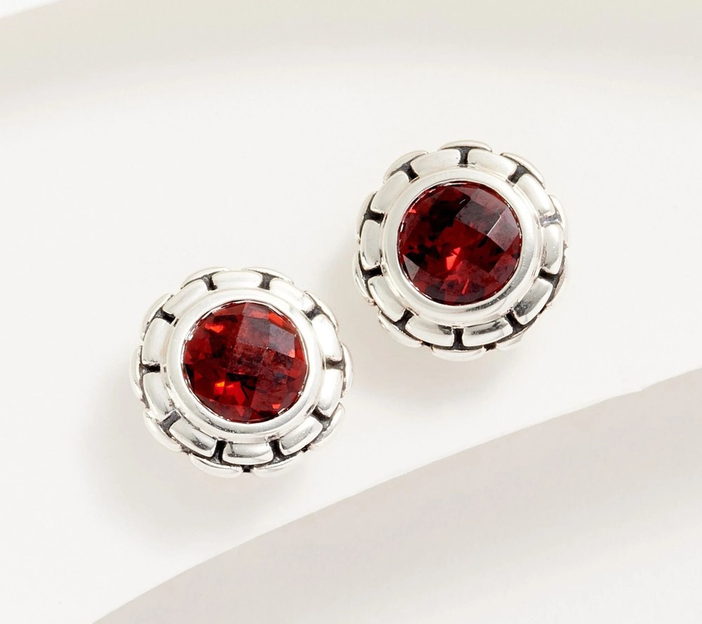 JAI's phenomenal box chain details surround these vibrant gemstone studs for a look that gives a lively lift to whatever OOTD you choose. From JAI. Sterling silver, 925 Total gemstone weights are approximate: Garnet 1.60 carats; Gemstone stud earring design; box chain carved details; polished and slightly oxidized Posts and clutches, for pierced ears only Measures approximately 3/8"L x 3/8"W Imported