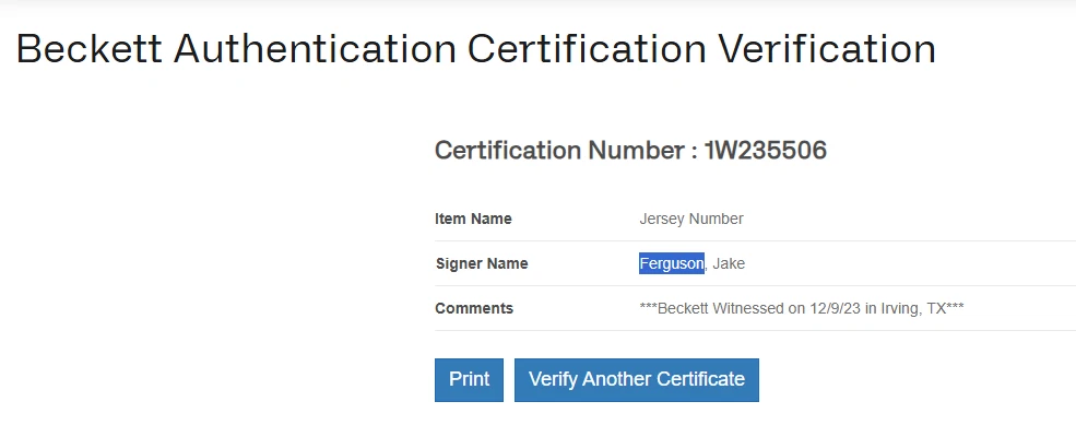 This auctionis for a Custom Jersey that is hand signed by JAKE FERGUSON. Please view each photo before purchasing and message me with any questions. Certification Number : 1W235506 This itemis guaranteed to be 100% authentic and will include a COA hologram from Beckett Authentication. Checkout some of our other great autographed items in our ebaystore and besure to add us to your favorites list.