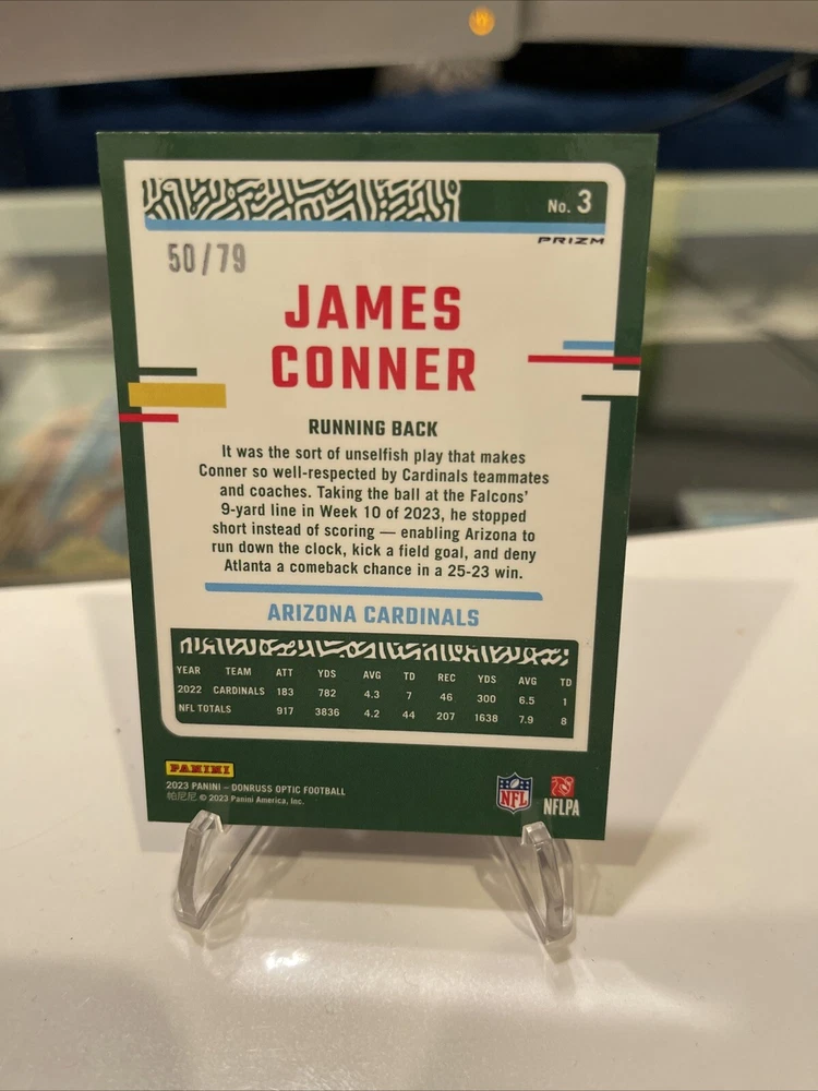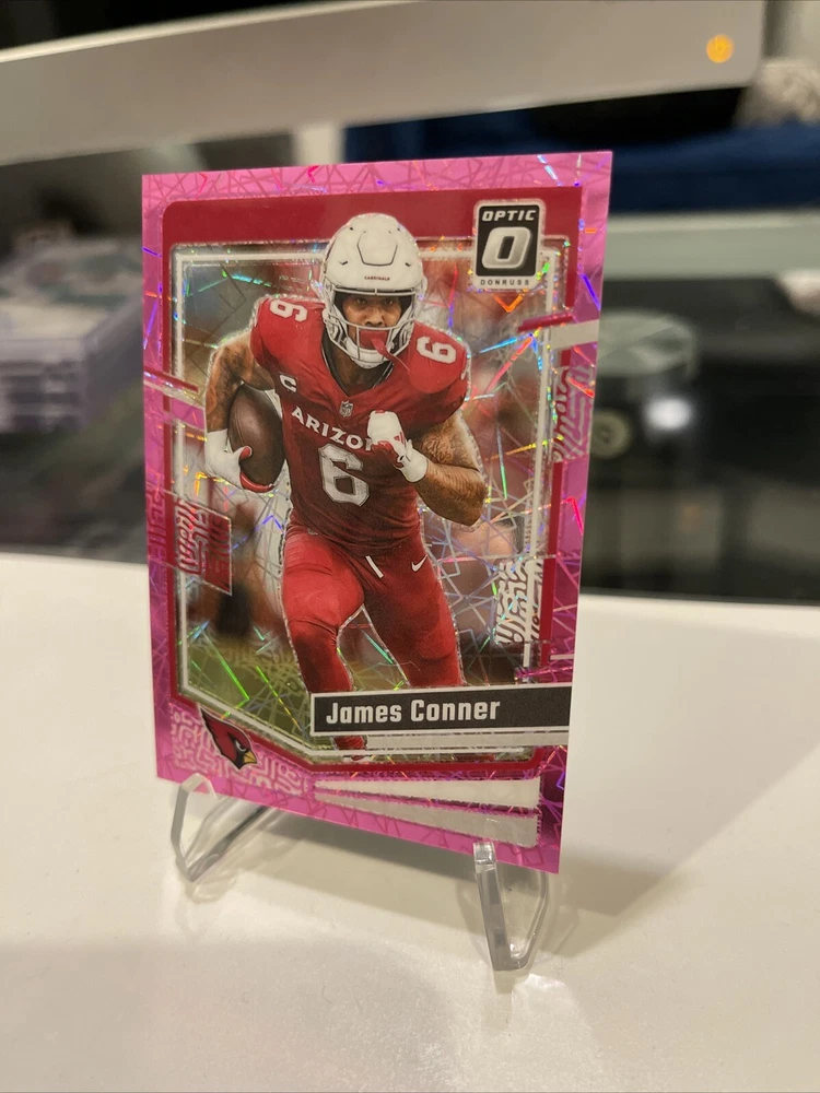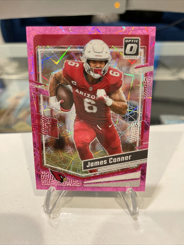 This is a rare and highly sought-after sports trading card featuring James Conner of the Arizona Cardinals. The card is from the 2023 Panini Donruss Optic set and has a print run of only 79. It is a Pink Velocity Prizm parallel variety, making it a unique addition to any collection. The card is in standard size and has been manufactured in the United States by Panini. It is an original and licensed reprint, with features such as being serial numbered and a short print. The card is named after the player himself and has the card number 3. This is a must-have for any fan of the National Football League (NFL) and sports trading cards.