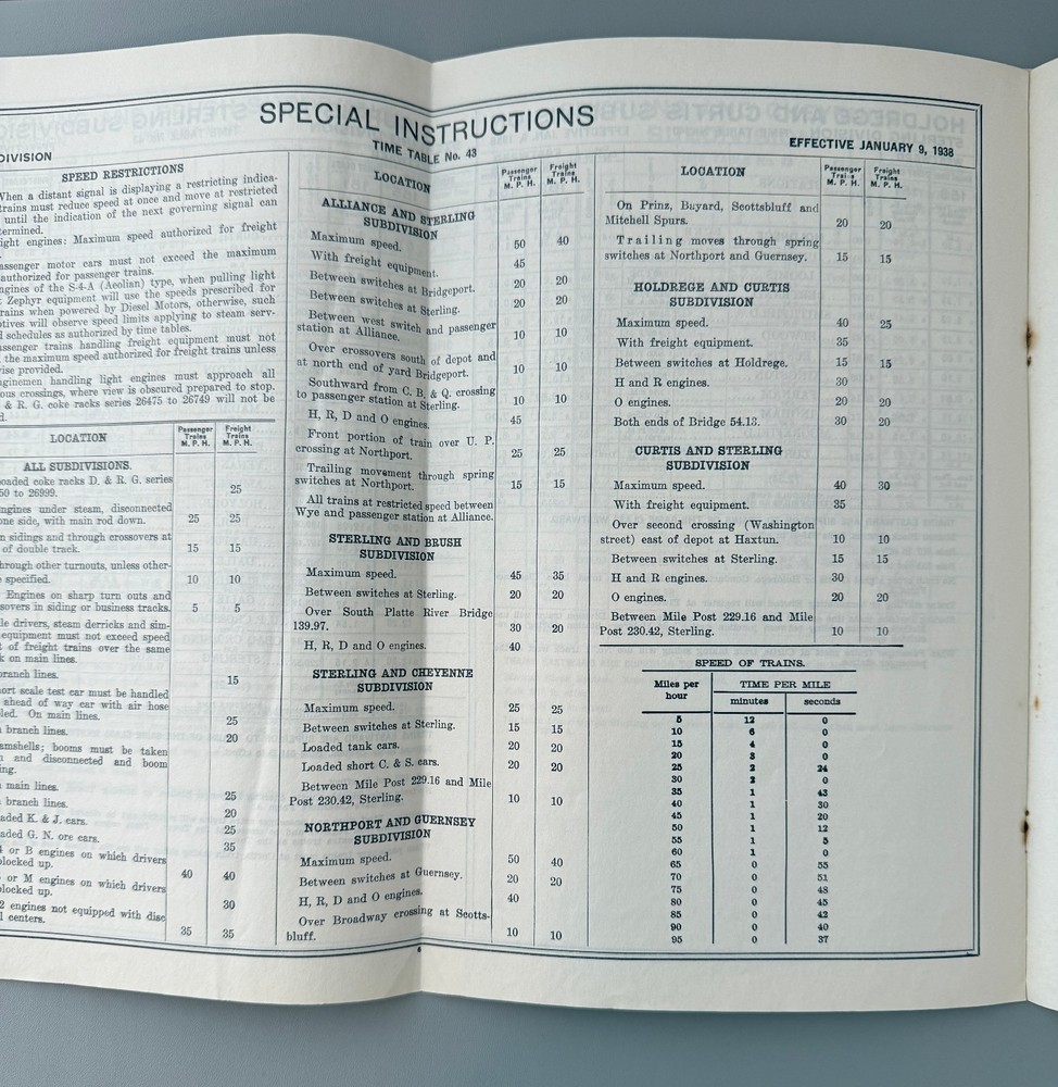 JAN 9 1938 CHICAGO BURLINGTON & QUINCY STERLING DIVISION EMPLOYEE TIMETABLE #43. Very nice, employee timetable for the Chicago Burlington & Quincy Railroad, Sterling Division, from January 9, 1938. #43 timetable. Horse blanket style. Great condition overall. Will ship via USPS Priority Mail, with insurance & tracking, and will be packed well for transit. PICK-UP is always available. We will combine shipping on multiple auctions when possible. Please wait to checkout until a revised invoice is sent. Please check out our other auctions as well, including other railroad collectibles!
