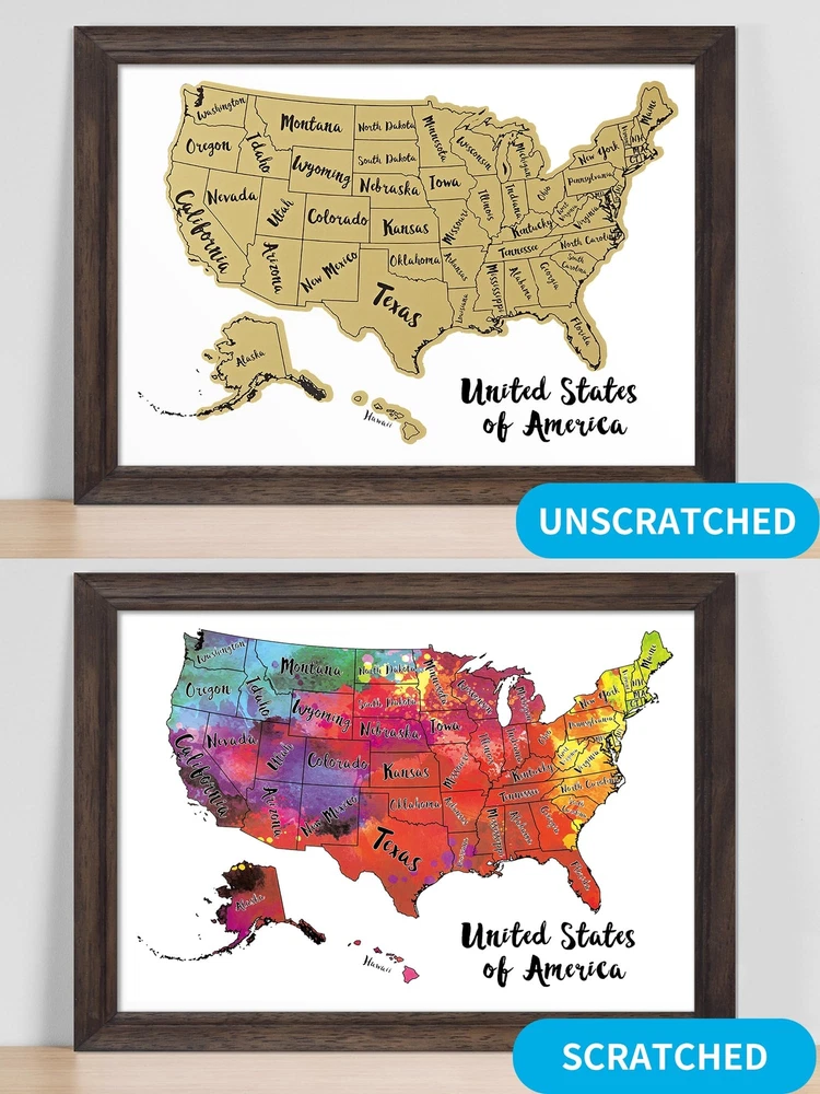 Product Description Plan new explorations with your USA Map! It is easy to scrape the gold foil and reveal a beautiful watercolor painting you have traveled. Easy to Use You could use some tools to scrape your map. Put 12X17" map in a frame (Frame Not Included) over some corkboard and use pins to mark the places where you traveled. Package Included 1 * Map 1 * Scrape Pen 10 * Pins Seller Policy 12 Months 12/24 Online Customer Service Exquisite Gift For Traveling: This is a really fun way to keep track of your travels and scrape more sections. It's a unique gift for any occasion, like a birthday, anniversary, wedding, valentines, Christmas and so on. Easy To Use: Could use multiple tools to scrape map and easily handle edges. Easy to scrape the gold foil and reveal a beautiful watercolor painting you have traveled. Record Your Travel: 12x17 inches map fits a standard US frame (Frame Not Included) and hangs on a bulletin or corkboard. You also could place flags and stickers in some cities already marked on the map! Durable & Portable: Coated with a premium foil material, our map is durable to resist accidental scrape and damage. Cylindrical packaging is convenient to carry, will not add any trouble to your journey. Product Contents: Includes 1 JARLINK scratch off USA map and 25 practical accessories, ideal for exploring and documenting your travels.