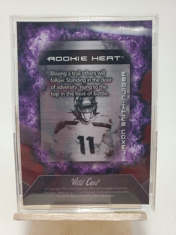 This Jaxon Smith-Njigba trading card is a must-have for any serious collector. With a print run of only 75, this 2023 Wild Card Matte Rookie Heat Orange/Purple card is a rare find that any fan of the Ohio State Buckeyes or Seattle Seahawks would love to add to their collection. This card features a serial number, making it an authentic and valuable addition to your collection. The card is ungraded, but the quality of the printing and the attention to detail in the design make it clear that this card is going to be a valuable piece for years to come. With its unique purple parallel and rookie designation, this card is sure to be a hit with any fan of Jaxon Smith-Njigba or any collector looking for a rare and valuable addition to their collection.