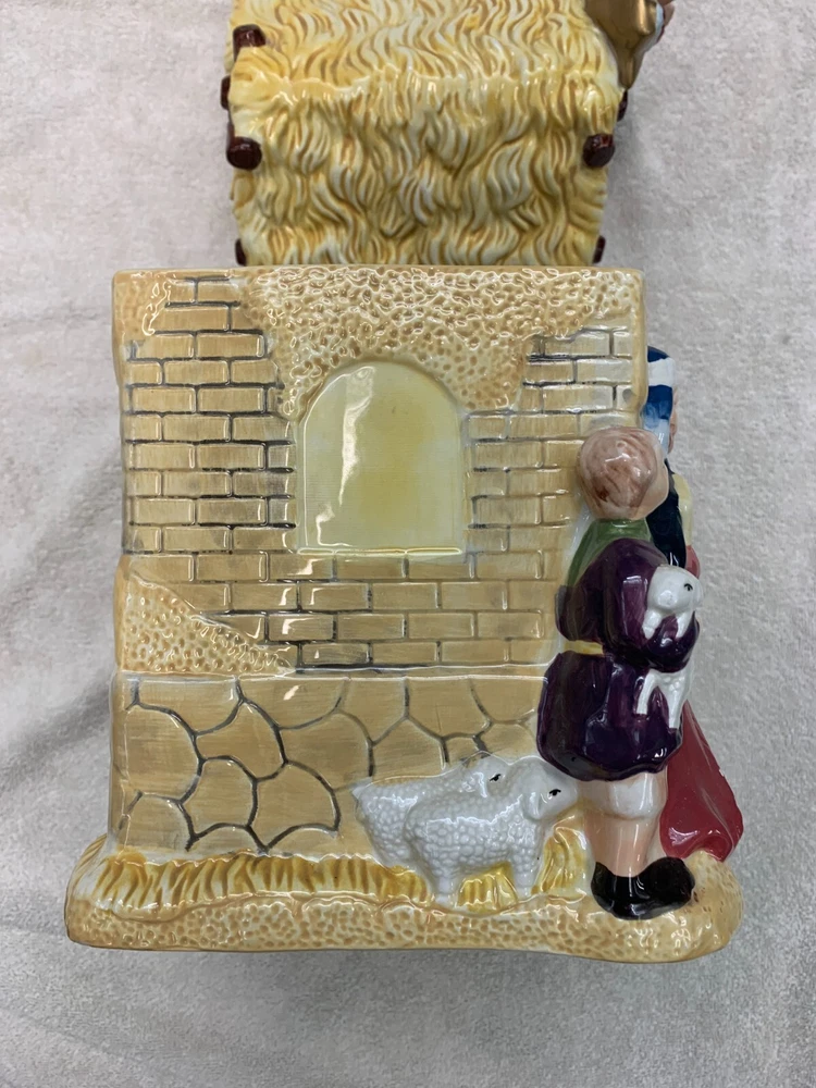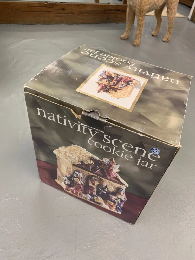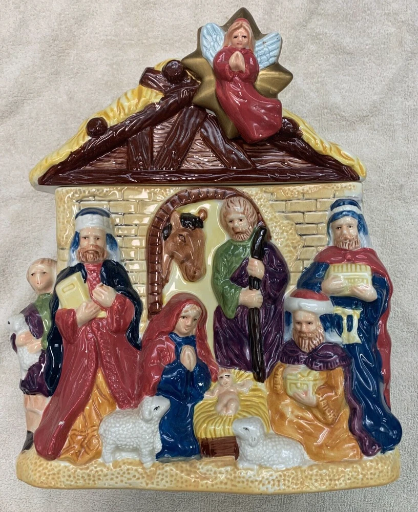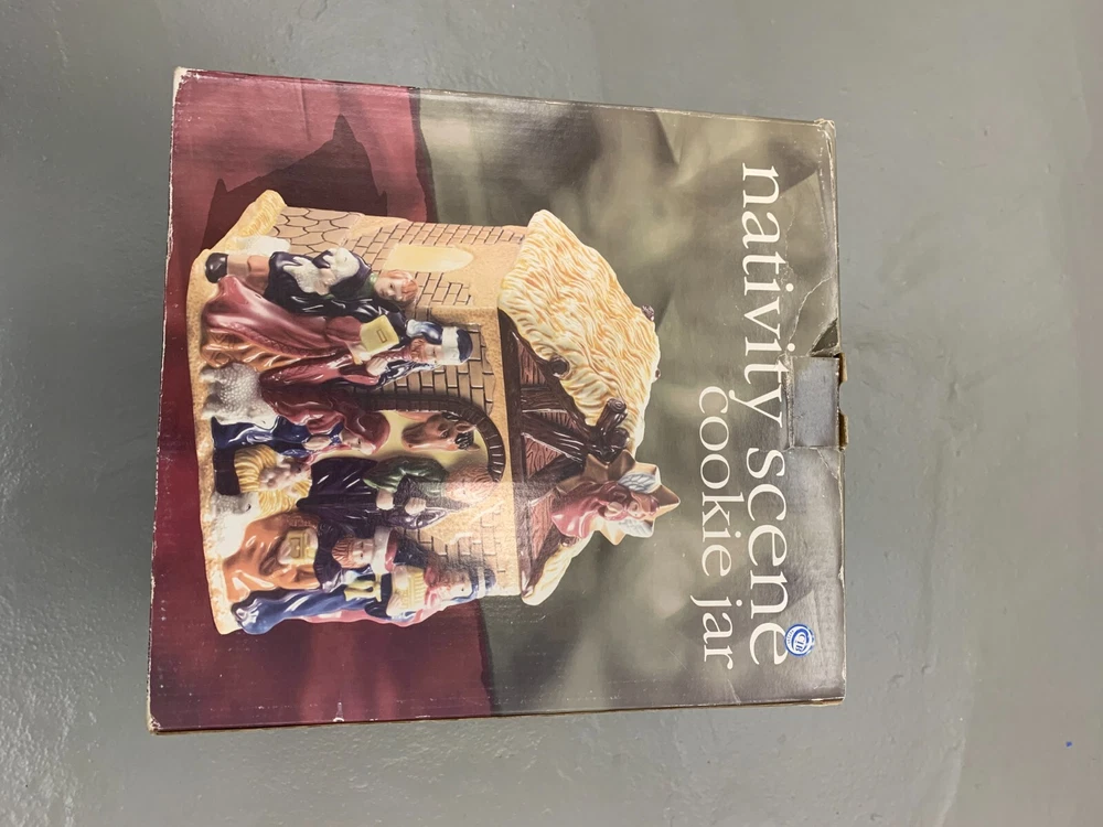 Celebrate the birth of Jesus with this eye-catching ceramic cookie jar from Jay Imports. Featuring a detailed & colorful nativity scene with dimensional figures and animals, this jar is perfect for storing your favorite holiday treats. The jar comes with a roof lid with angel/star and includes two items in total. Made with care, it's a great addition to any Christmas decor. Whether you're using it to serve cookies or as a decorative piece, this nativity scene cookie jar is sure to bring joy to your home this holiday season. 12" high x 10" wide x 7 1/2" deep One tiny chip in Shepard's pink robe- easily touched up. (see detail) Otherwise, item is pristine.
